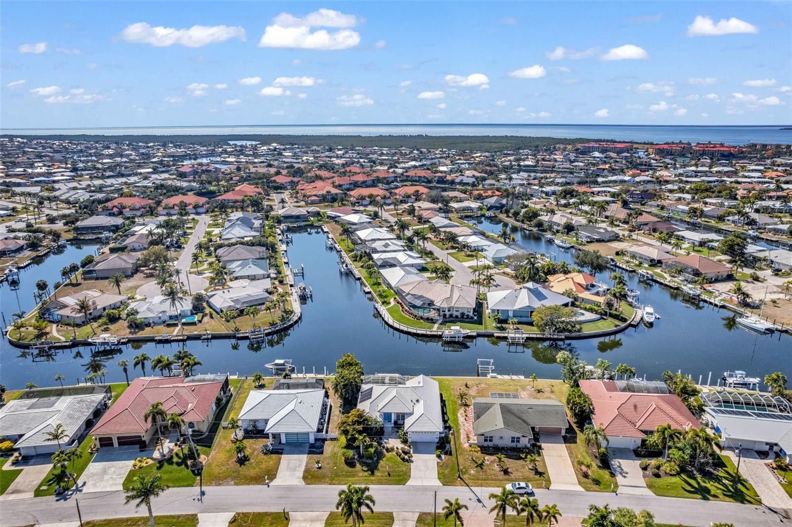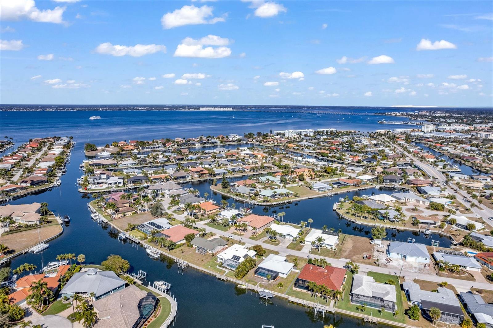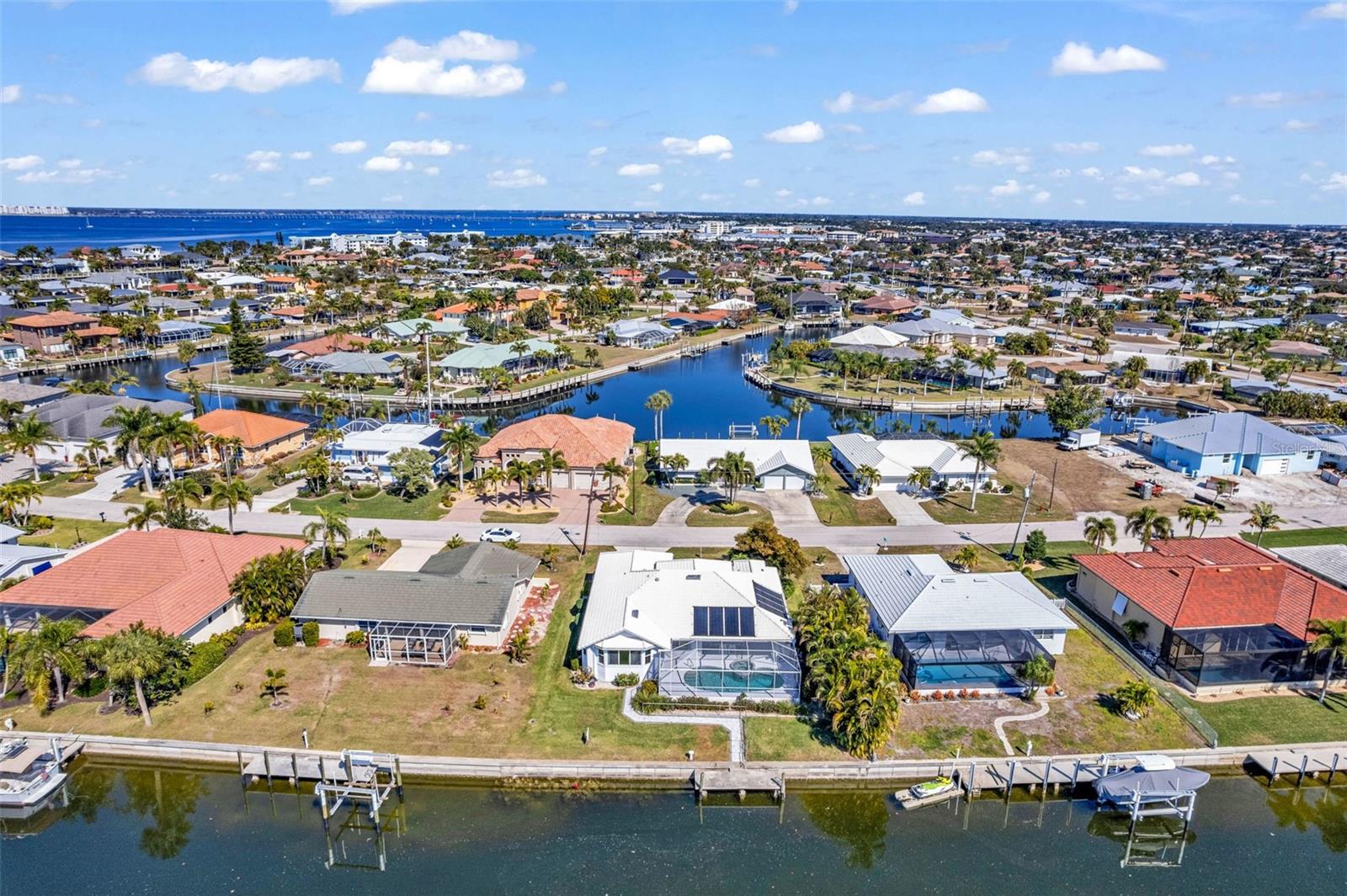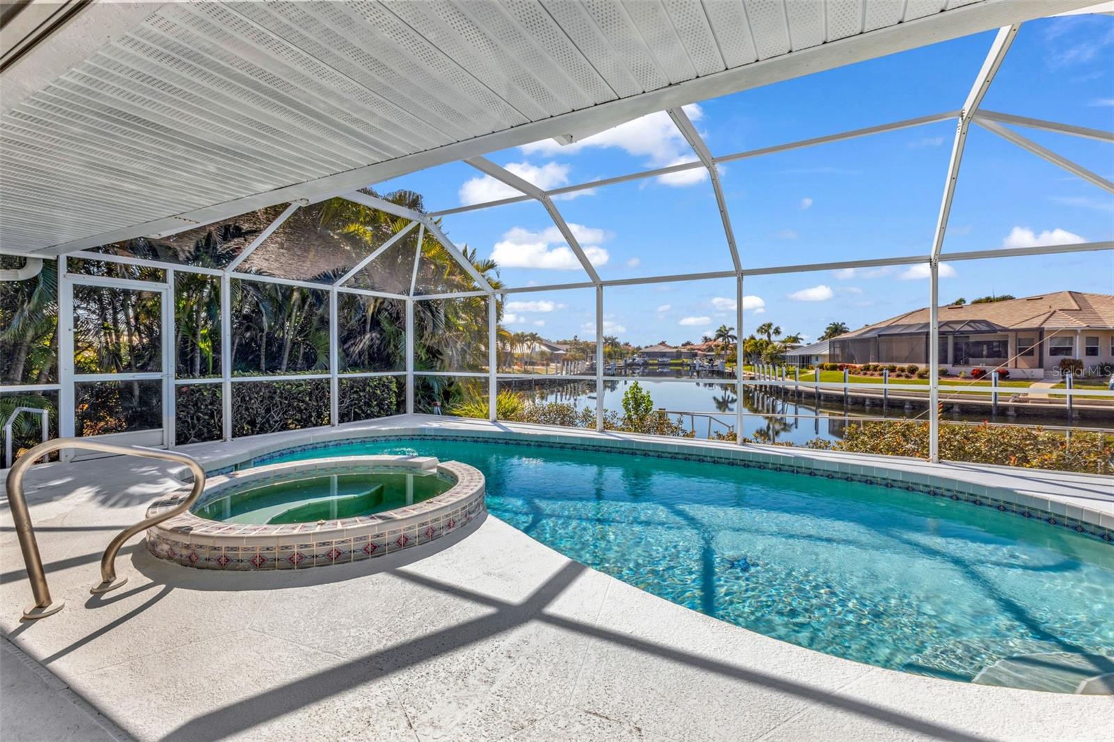 One or more photo(s) has been virtually staged. Location is everything—and this one delivers. Experience exceptional waterfront living with a rare double canal intersection view and less than 2,000 feet to open water at Charlotte Harbor. Sailboat access and a concrete dock make this property a boater’s dream. Beautifully renovated in 2026, this 3-bedroom, 2.5-bath residence offers a bright, modern interior with thoughtful upgrades throughout. The light-filled kitchen features granite countertops, a peninsula breakfast bar, stainless steel appliances, gorgeous Viking Fridge, and seamless flow into the adjoining family room—where breathtaking water views surround you from nearly every angle. A split-bedroom floor plan ensures privacy, while the newly renovated bathrooms add a refined, contemporary touch. The spacious primary suite offers direct access to the lanai and pool area, creating a true indoor-outdoor retreat. Engineered hardwood flooring in the living and family rooms adds warmth and sophistication. Expansive sliding glass doors in both living spaces open to the lanai, blending interior comfort with waterfront serenity. A convenient half bath on the lanai enhances poolside entertaining. Step outside to your sparkling heated pool and spa, perfectly positioned to capture wide water views. The garage features new epoxy flooring for a clean, polished finish. With premium updates, sailboat water access, and an unbeatable intersection view, this home embodies the very best of Southwest Florida waterfront living.