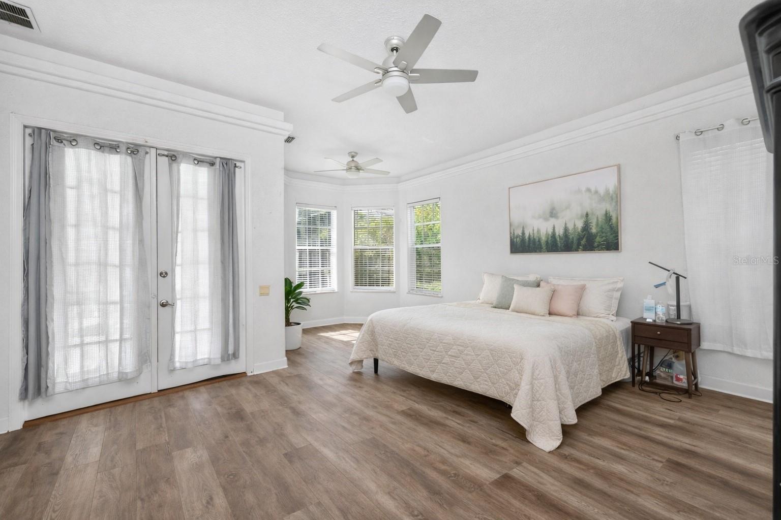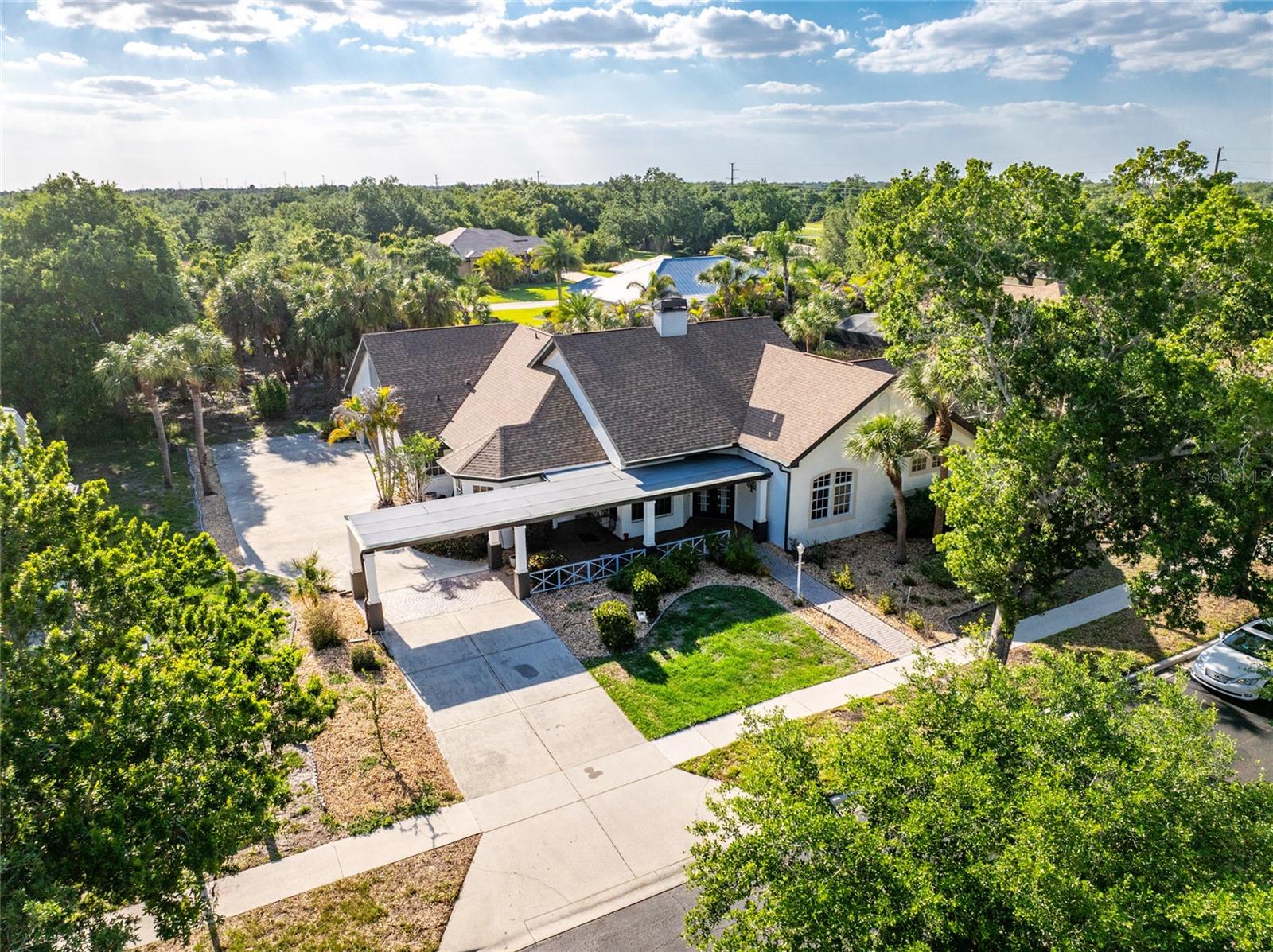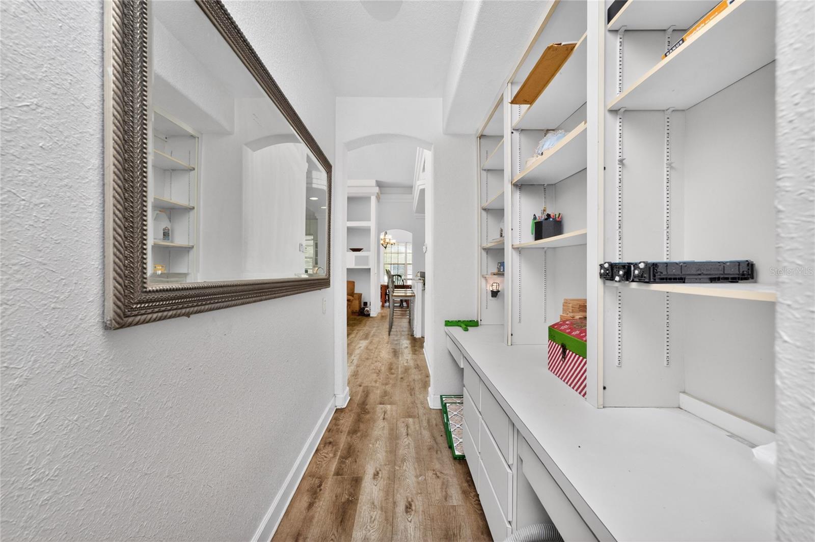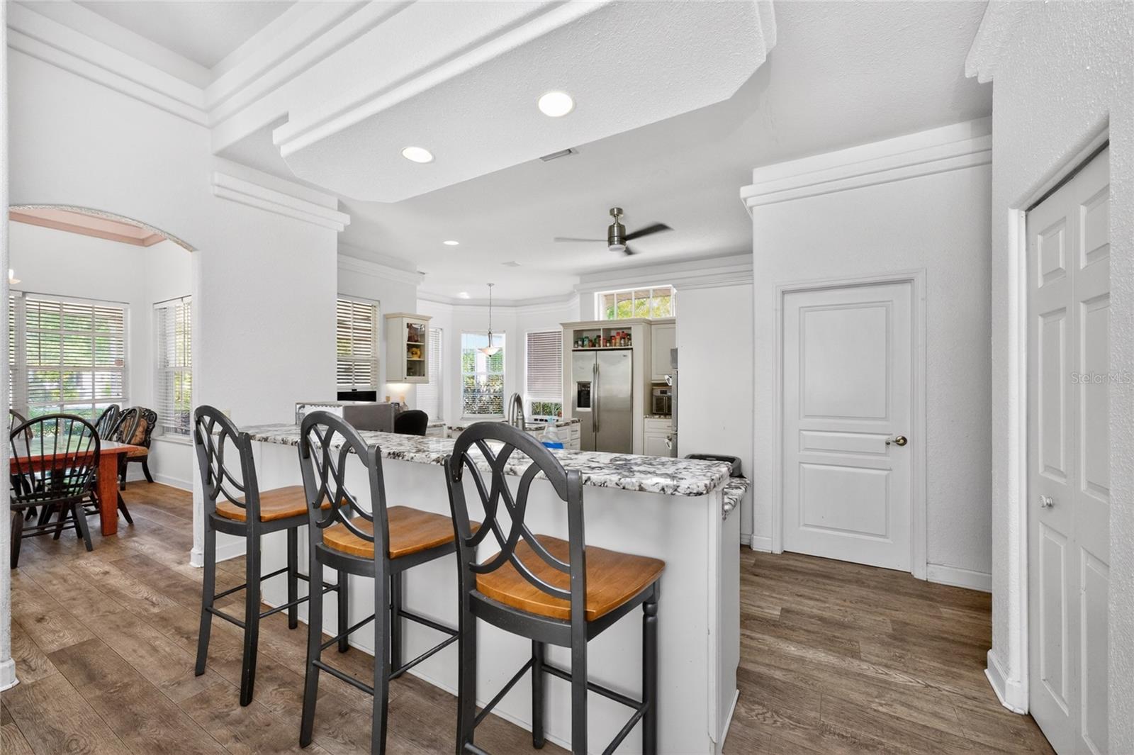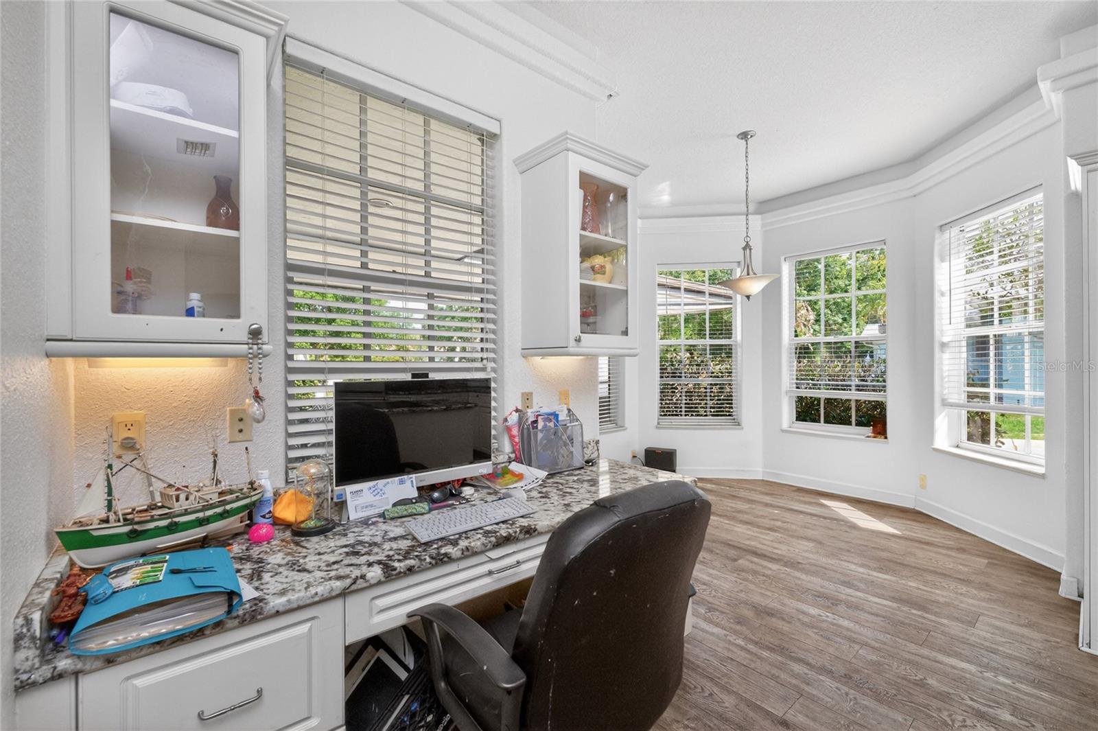 One or more photo(s) has been virtually staged. PRICED TO SELL, ADD YOUR FINISHING TOUCHES! Step through the impressive covered entry and discover this spacious 5-bedroom plus den, 3½-bath home designed for comfortable living and entertaining. The main living areas feature Luxury vinyl plank flooring, soaring volume ceilings, along with a central vacuum system, security system, and pre-wiring for surround sound. The kitchen offers an abundance of cabinetry, granite countertops, a stylish backsplash, smooth cooktop, and double built-in ovens, making it perfect for everyday use or hosting guests. A unique triple-sided wood-burning fireplace creates a warm focal point connecting the foyer, living room, and family room. The primary suite is a private retreat with French doors leading to the pool, a patio, wet bar, and an en-suite bath with a jetted tub. Jack and Jill bedrooms include walk-in closets with built-in desks and a nearby library area, while a separate guest wing provides added privacy with its own bedroom and bath. A winding staircase leads to a spacious loft ideal for a game room or additional bedroom. The outdoor space is designed for relaxation with a sparkling pool, ambient lighting, built-in cabinetry, and a convenient pool bath, all surrounded by mature landscaping. Located in a desirable gated community with tree-lined streets, residents enjoy amenities including tennis courts, a basketball court, and a playground.