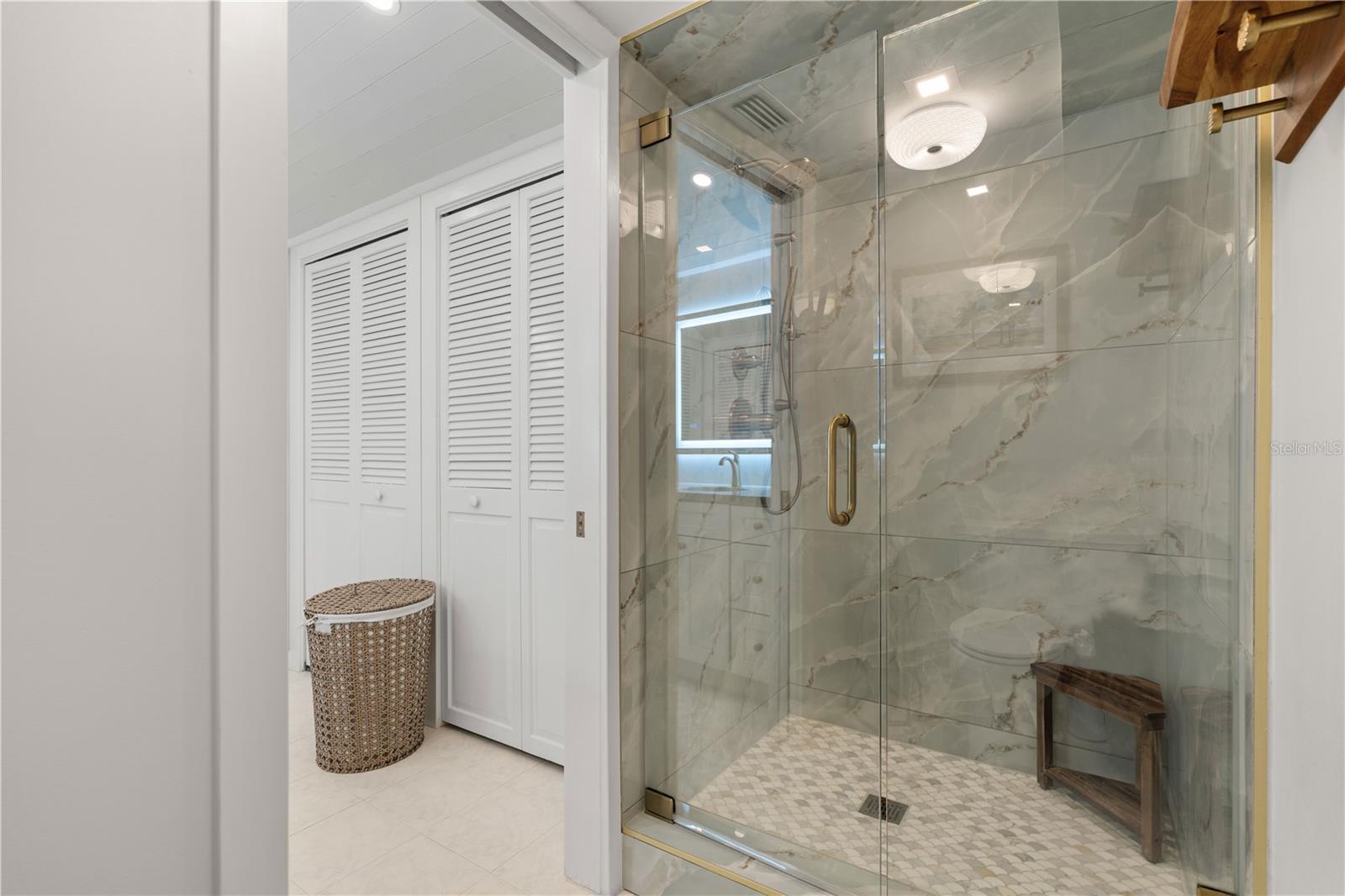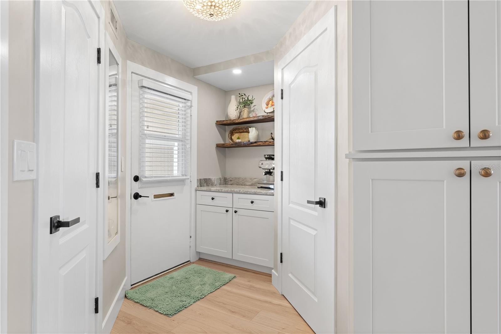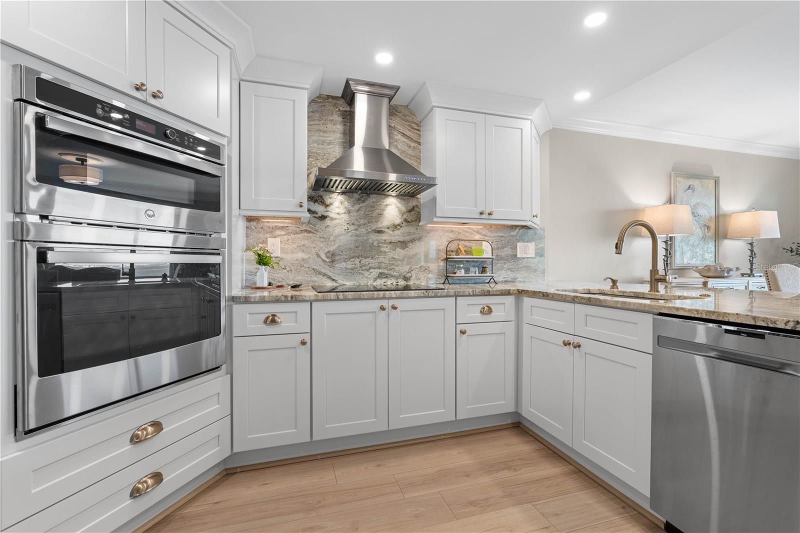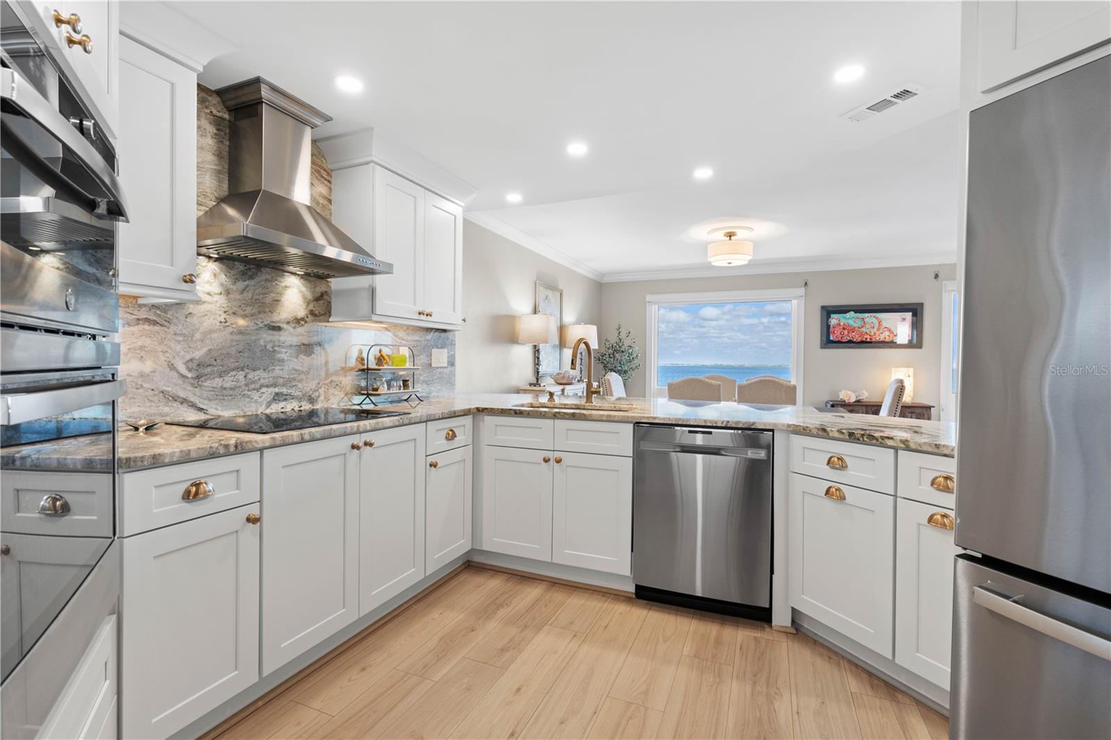 TOP-FLOOR, END-UNIT HARBORFRONT CONDO IN COLONY POINT - Enjoy sweeping, unobstructed views of Charlotte Harbor from this beautifully remodeled 2 bed/2 bath condo in Colony Point, a waterfront condo complex in Punta Gorda Isles. Located on the top floor, this end-unit is perched at the tip of a peninsula offering exceptional privacy along with panoramic water views that stretch for miles. Inside, the light-filled interior showcases an open-concept layout designed to take full advantage of the harbor backdrop. Large impact-resistant windows frame the water from the great room, dining area, and Florida room, filling the home with natural light throughout the day. Wood-look, LVT flooring, crown molding, and a soft coastal palette create a polished yet relaxed atmosphere ideal for everyday living or entertaining. At the heart of the home is the fully remodeled gourmet kitchen designed for both style and function. Custom shaker cabinetry with pull-out storage and soft-close drawers maximizes organization, while quartzite countertops and a full-height quartzite backsplash & waterfall edge add timeless elegance. Stainless steel appliances, including built-in oven and microwave, are complemented by under-cabinet lighting and a wraparound breakfast bar that overlooks the living area and harbor beyond. The adjacent butler's pantry with second entrance features a beverage center/coffee bar w/quartzite counter, nearby built-in glass-enclosed wine/bottle storage and two walk-in pantries. The laundry area is also located here. An air-conditioned Florida room extends the living space and provides a front-row seat to the spectacular water view. Surrounded by large windows and protected by electric roll-down hurricane shutters, this versatile space is perfect for relaxing with a morning coffee or watching dolphins play or boats pass by in the harbor. Barn doors separate the Florida room from the master bedroom and great room. The master suite offers tranquil harbor views and features plantation shutters, ample closet space, and a beautifully updated en-suite bath with stone vanity, illuminated mirror, and glass-enclosed walk-in shower. The guest bedroom also enjoys water views and has convenient access to the updated guest bath. Additional touches to round out the unit include recently added ceiling fans with hidden wires, Schlage Encode WiFi door lock, Lutron dimmers throughout and Hunter roll-down shades. NEW Carrier A/C in 2022. Unit comes with one assigned, covered parking space. Residents of Colony Point enjoy beautifully maintained waterfront grounds, a beach-like seating area with Adirondack chairs positioned to overlook the canal, a screened and heated community pool, clubhouse for social gatherings, bike storage room, floating dock/kayak launch, and a 420-foot concrete dock with immediate sailboat access to Charlotte Harbor. Dock spaces are available on a first-come basis when available. Ideally located just minutes from the Isles Yacht Club, Fishermen’s Village, and historic downtown Punta Gorda, this home places waterfront dining, boutique shopping, parks, and year-round events within easy reach. Schedule an appointment today and experience harbor front living at its finest.