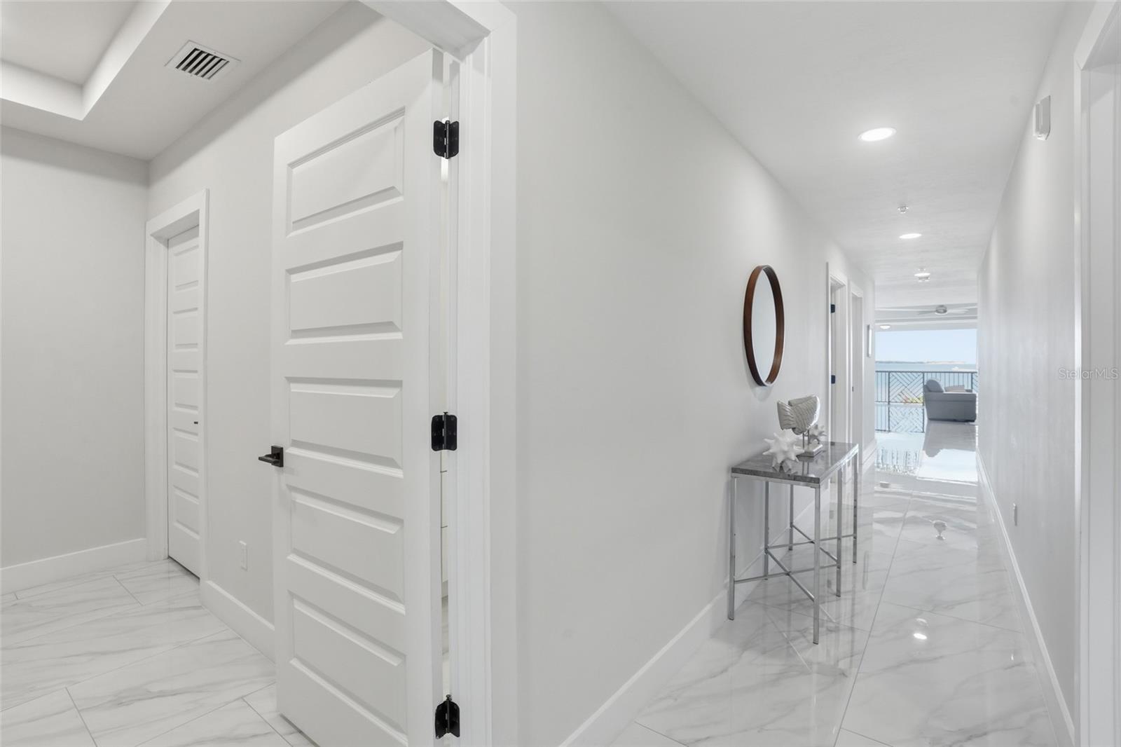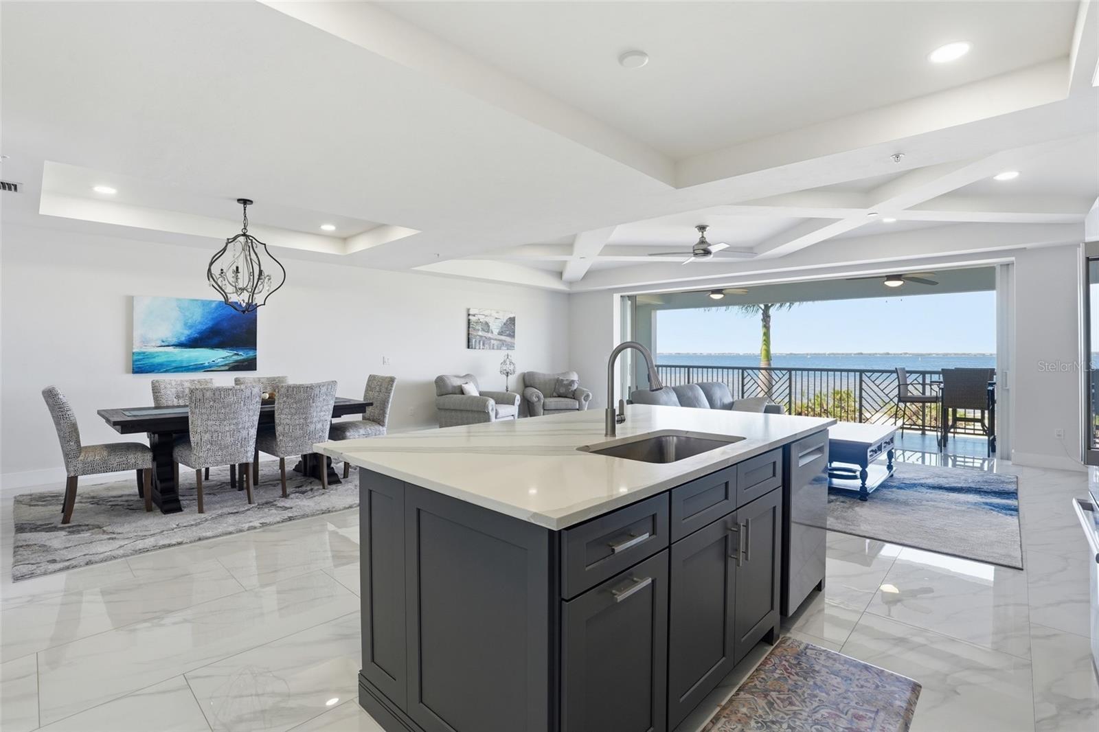 Experience LUXURY WATERFRONT LIVING in this stunning 2-bedroom, 2 1/2-bath residence featuring some of the most breathtaking views in the area. This elevated condo offers over 1,600 square feet of beautifully designed living space, complete with oversized 24” x 48” marble-look porcelain tile flooring, elegant coffered ceilings, and a spacious great room that seamlessly showcases the spectacular water views. The expansive open-air balcony spans the full width of the unit—perfect for enjoying your morning coffee or unwinding in the evening while taking in the serene surroundings. The gourmet kitchen is designed to impress, featuring stainless steel appliances including a Frigidaire induction cooktop, Bosch refrigerator and dishwasher, quartz island, mother-of-pearl tile backsplash, microwave/warming drawer, and an abundance of soft-close cabinetry for all your storage needs. The luxurious primary suite offers walk-in closets and a spa-inspired ensuite bath with dual sinks, a quartz-topped vanity, soaking tub, and a frameless glass-enclosed shower. The guest bedroom is generously sized and conveniently located near the guest bathroom. An additional half bath and a spacious utility room provide added comfort and functionality. Additional features include impact-resistant windows and pocketing sliding glass doors, allowing for abundant natural light and uninterrupted panoramic water views throughout. This move-in-ready condo invites you to immediately embrace the Florida lifestyle. Ideally located within walking and biking distance to Fisherman’s Village, as well as local restaurants, live music, and historic downtown Punta Gorda. Call us and Schedule your showing TODAY!