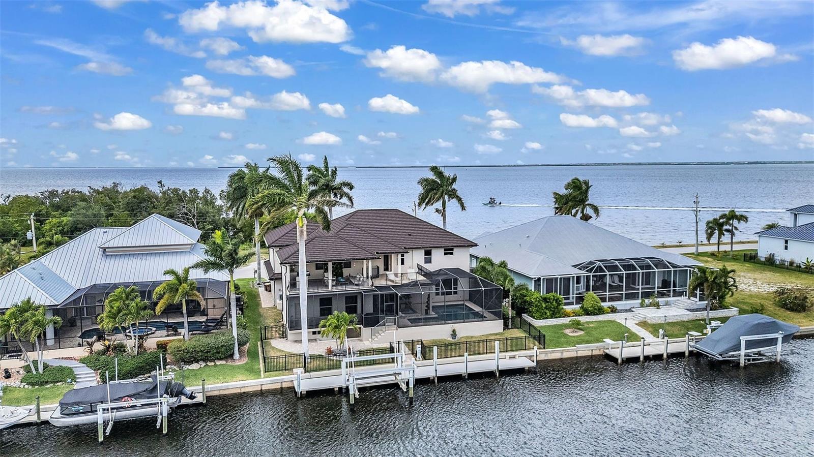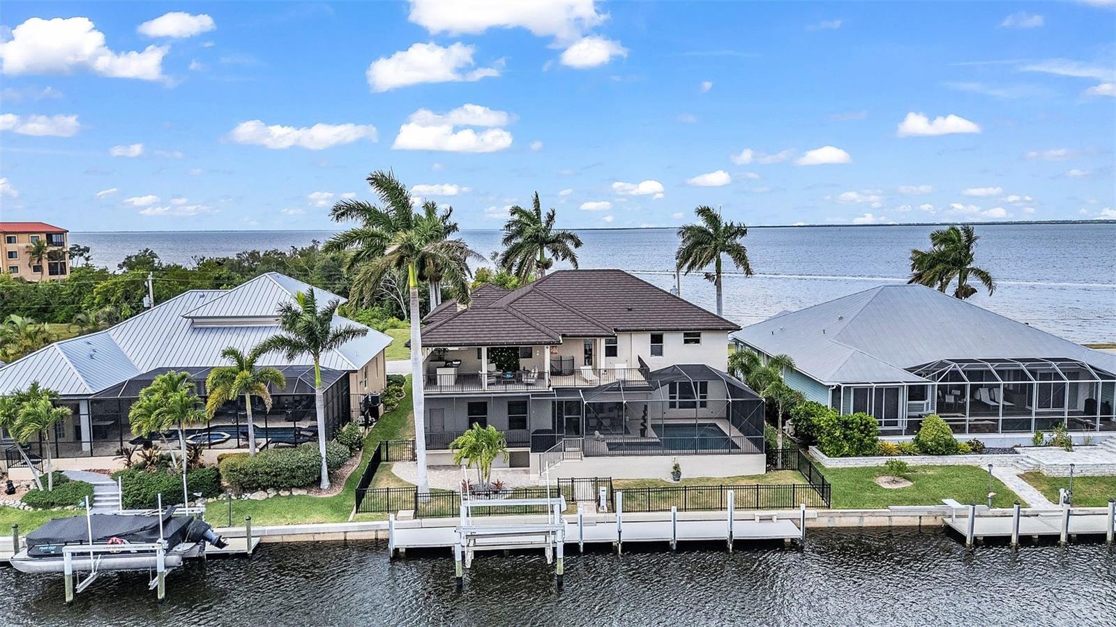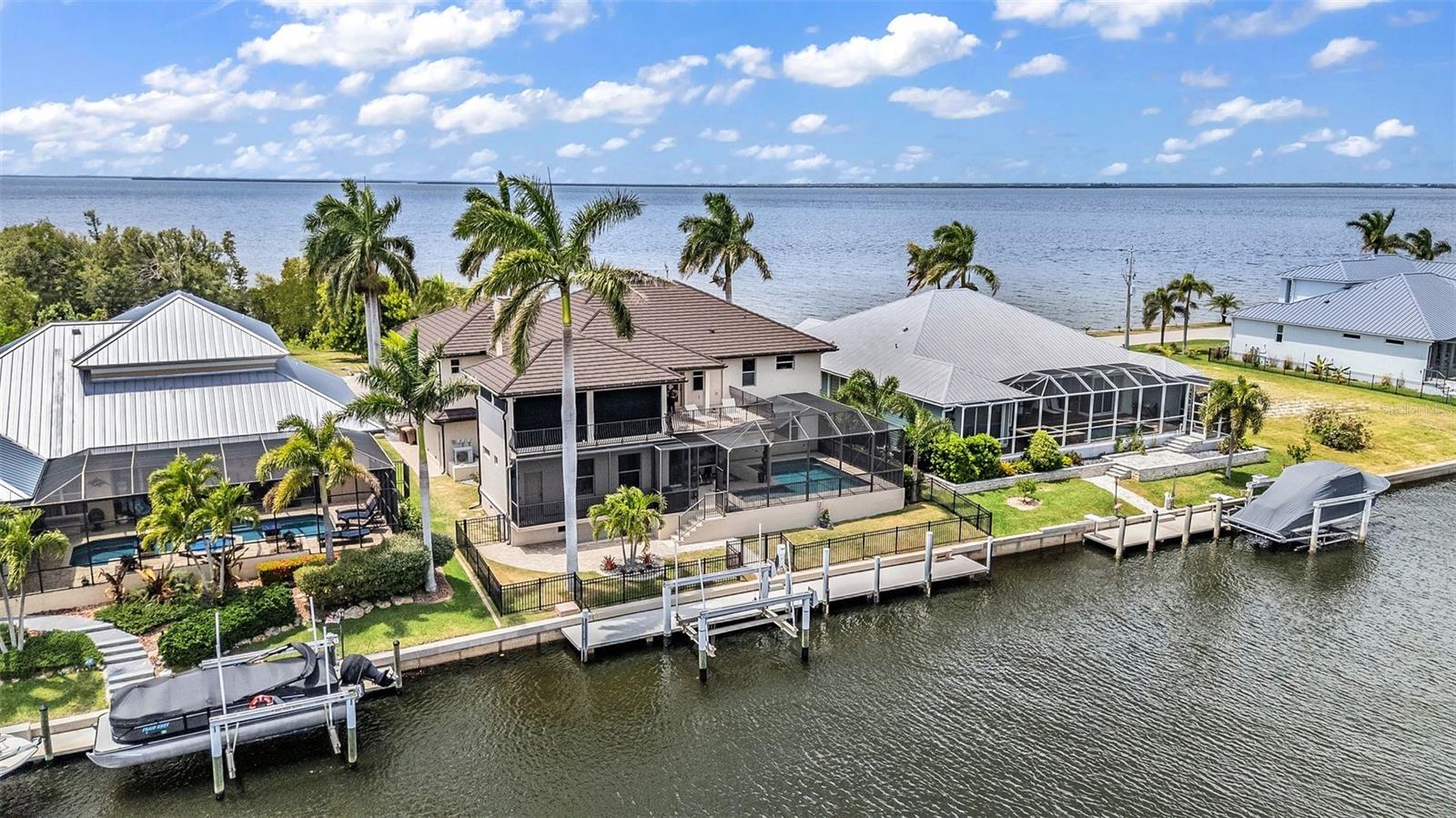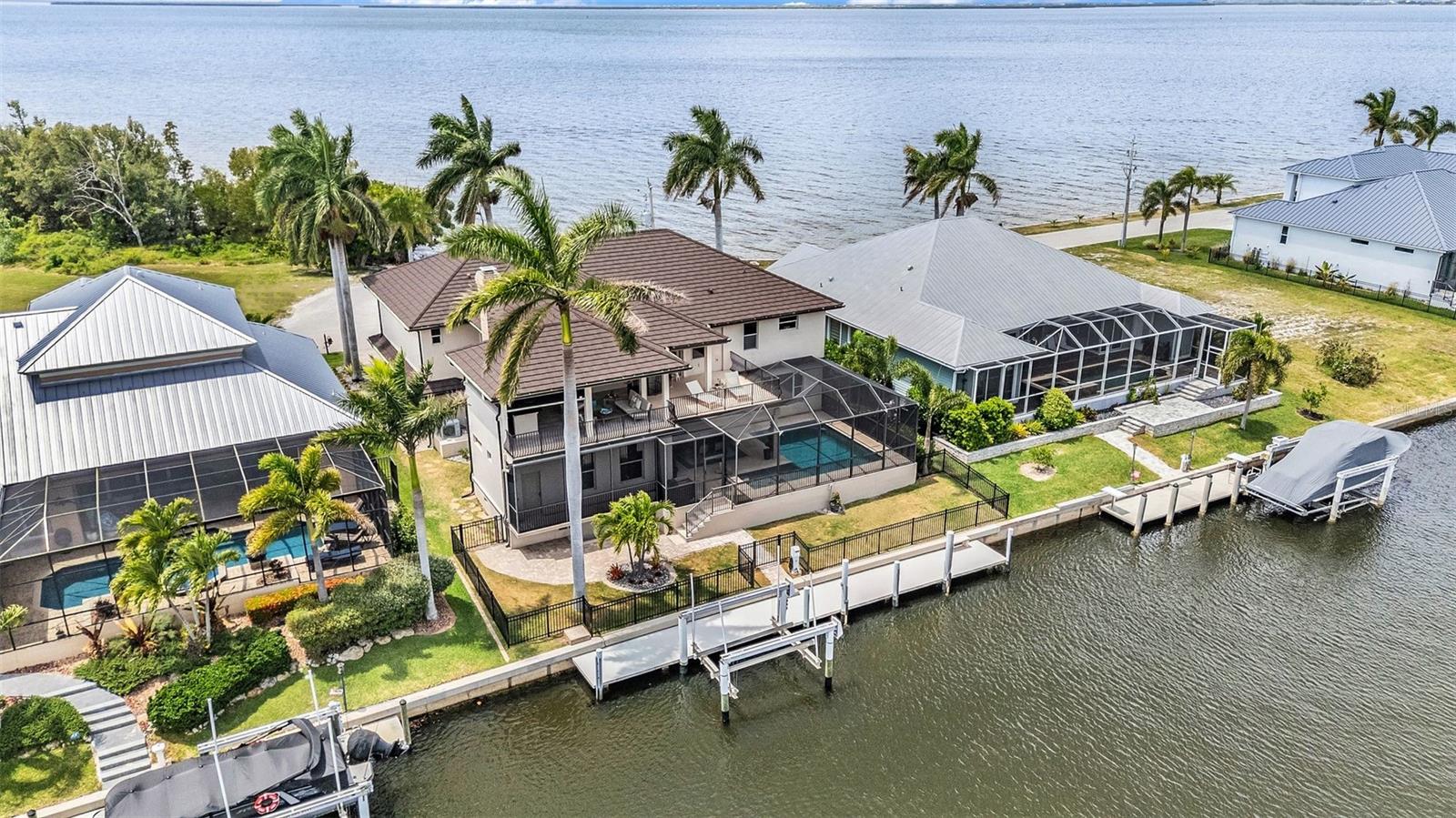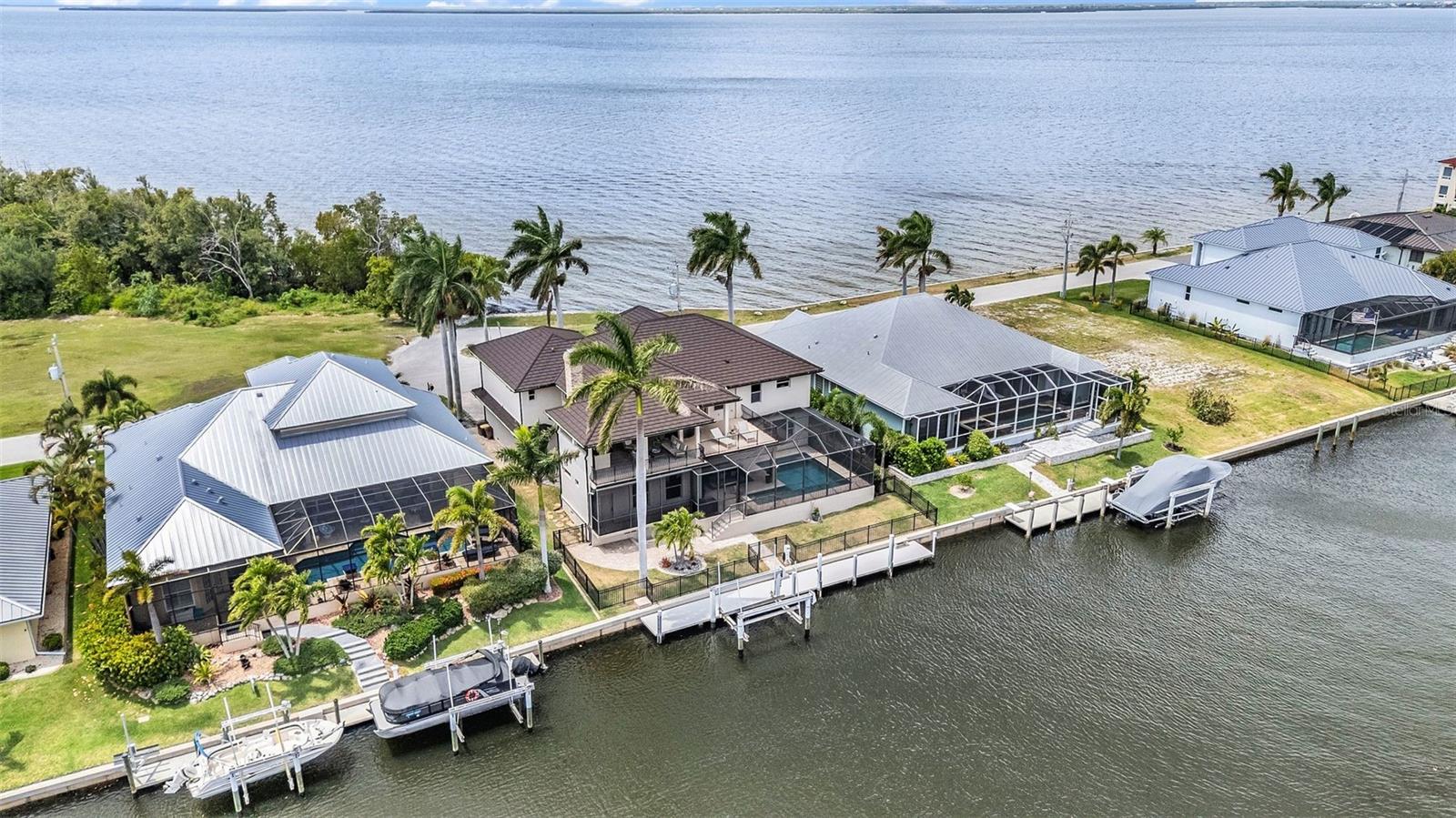 Positioned between a wide canal and the open expanse of the Peace River, this custom residence delivers a RARE DUAL WATER EXPERIENCE, sunrises in the back, sunsets in the front, and sailboat access to Charlotte Harbor just minutes away. Originally built in 1981 and thoughtfully reimagined in 2012, the home blends its classic waterfront roots with a more modern, livable design. Start your mornings on the lanai as boats glide past and dolphins and manatees surface in the canal. Spend your afternoons poolside, surrounded by travertine decking and a heated saltwater pool designed for both relaxation and entertaining. Then, as the day winds down, move to the front patio where sweeping Peace River views provide a nightly sunset show. For boaters, this is what it’s all about: a 60' CONCRETE DOCK WITH A 16,000LB LIFT and quick, unobstructed access to open water. No long idle zones. No compromises. Inside, the home is designed to feel elevated yet livable. Natural light fills the main living spaces, with water views woven throughout. The kitchen is built for real use and gathering, featuring a large center island, custom cabinetry, high-end appliances, a wet bar, a beverage center, a pot filler, and a unique prep area with a wood-burning fireplace. The layout offers 4 bedrooms plus an office, including two private suites. Every bedroom enjoys a water view, with primary and secondary suites overlooking the Peace River and guest rooms capturing the calm canal setting. Upstairs, a 20’ x 40’ INDOOR-OUTDOOR LOUNGE becomes the ultimate entertaining space. With a full bar and panoramic views of both the canal and the harbor, it easily transitions from open air to enclosed space with a remote-controlled Kevlar screen, perfect for hosting or unwinding in complete comfort. A spiral staircase connects directly to the pool level, creating a smooth indoor-outdoor connection. An elevator connects all levels, and upgrades, including a metal roof, hurricane impact windows and doors with electric shutters, updated A/C, pool equipment, and dock systems, provide peace of mind. A whole-home sound system and advanced network keep everything effortlessly connected, while the garage is EV-ready. Located in Punta Gorda Isles, you will enjoy miles of waterfront paths, easy access to parks and beaches, and a short ride to dining, Fisherman’s Village, and the weekly farmer’s market. This is more than a home; it is a daily experience of water, light, and effortless coastal living.