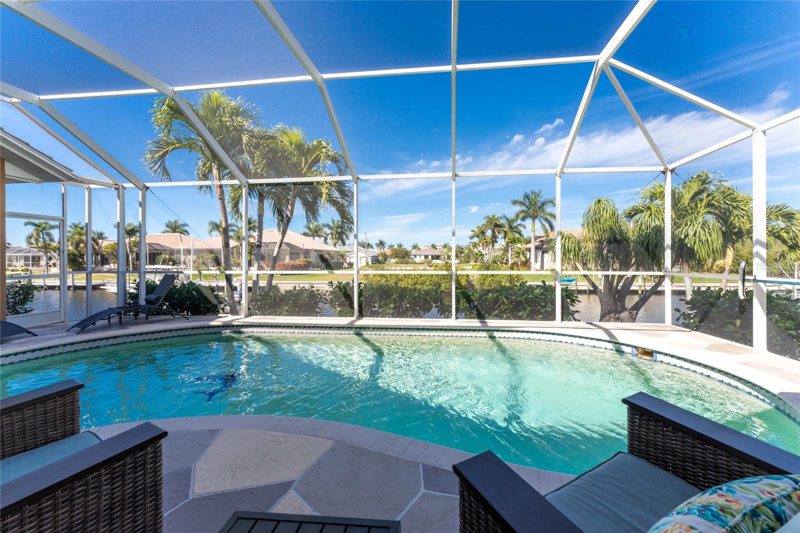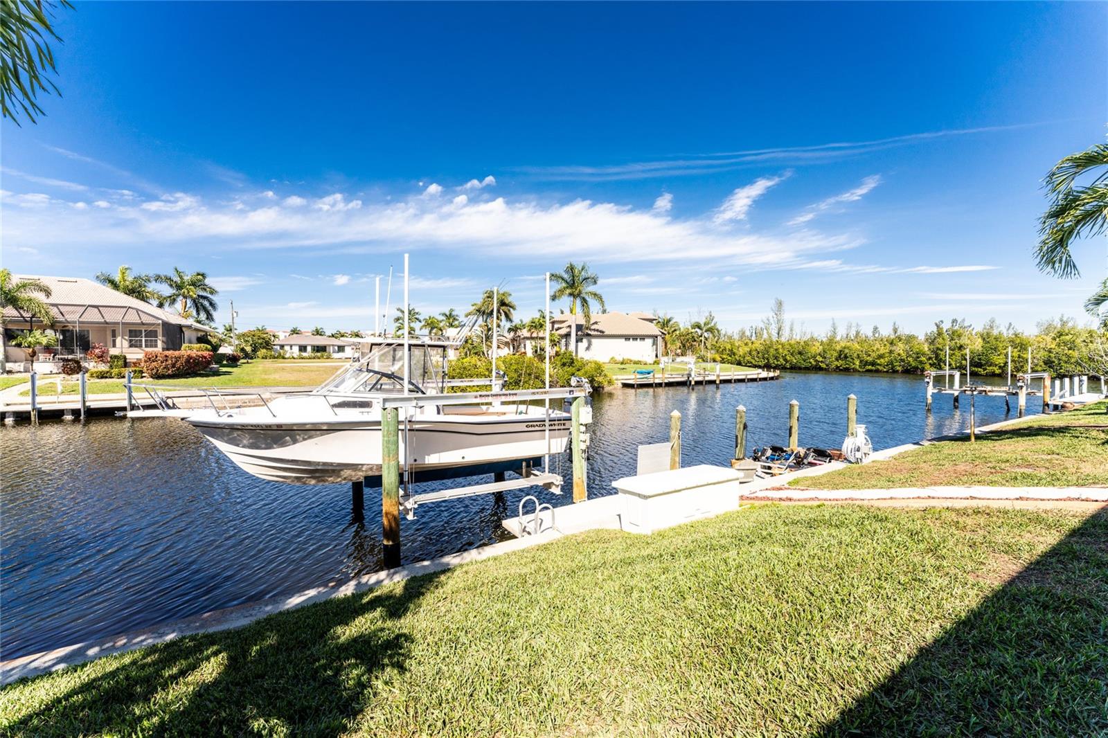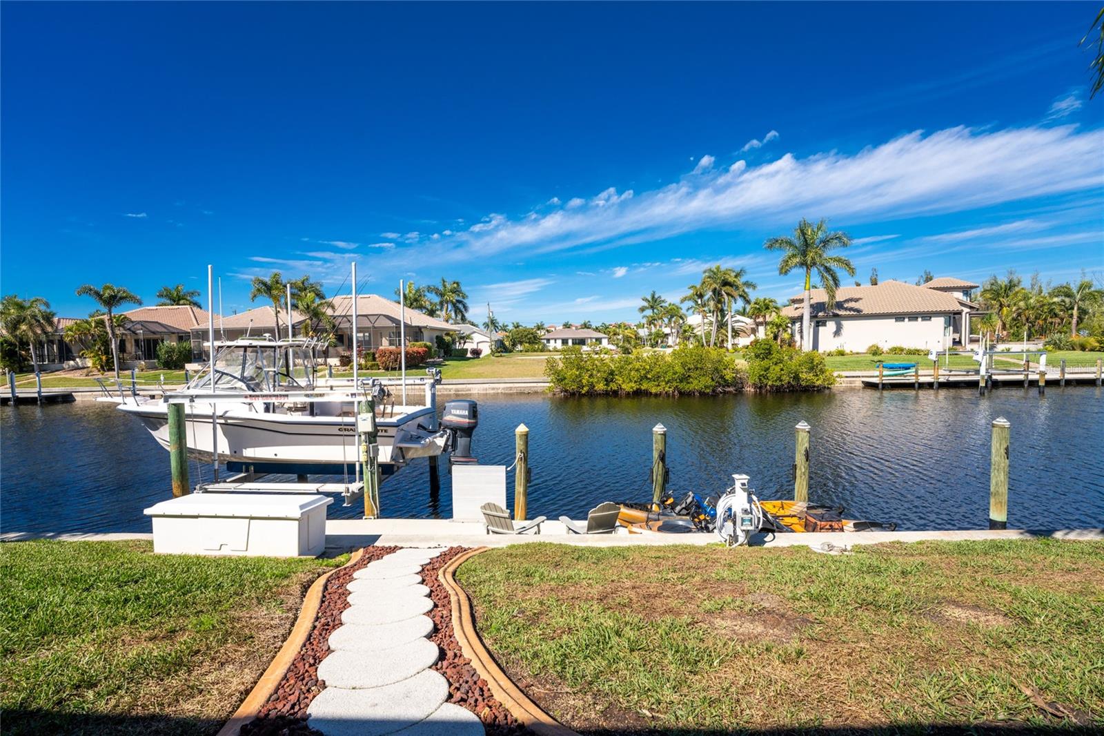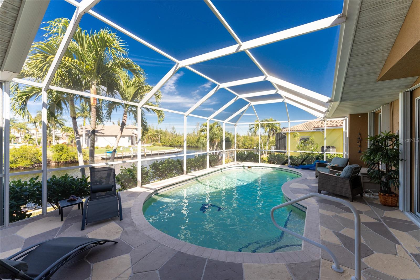 Welcome to your own piece of paradise in Punta Gorda, Florida! This stunning waterfront property offers direct sailboat access to Charlotte Harbor, boasting 109 feet of water frontage, a concrete dock complete with water and electric connections, and a 12,000 lbs boat lift. As you step into the house through the expansive glass doors, you're greeted by high ceilings and a well-designed open floor plan. The spacious living area leads you seamlessly to a large zero corner door, inviting you to the covered veranda and saltwater pool overlooking the canal. The kitchen is a chef's dream, featuring a Professional series Wolf Subzero Stainless-Steel refrigerator and gas range. Its aesthetic appeal is enhanced by granite countertops, a tiled backsplash, and Kraftmade soft-close wood cabinets. This home is designed for both functionality and style, with a split floor plan providing privacy. The generous master suite is filled with natural light and offers a walk-in closet. The ensuite bathroom is equipped with a double vanity, walk-in shower, and a large soaking tub. Two guest bedrooms and a second bath with access to the veranda/pool area ensure comfort for both residents and guests. Entertain effortlessly with a spacious dining area, a breakfast nook, and a well-appointed laundry room featuring a high-capacity Manitowoc Ice maker. The lanai, finished with stamped concrete, includes a saltwater pool, a piped-in gas line, a grill station, and a veranda with Nautilus electric roll-down hurricane shutters. Additional features include a Kohler whole-house backup generator, a 1,000 lbs propane tank, a 30 Amp RV outdoor plug, a water purification system, and a water softener. Enjoy a scenic boat ride through the beautiful canals, reaching Charlotte Harbor in approximately twenty minutes. This property is not just a home; it's a waterfront haven equipped with all the amenities for a luxurious Florida lifestyle.