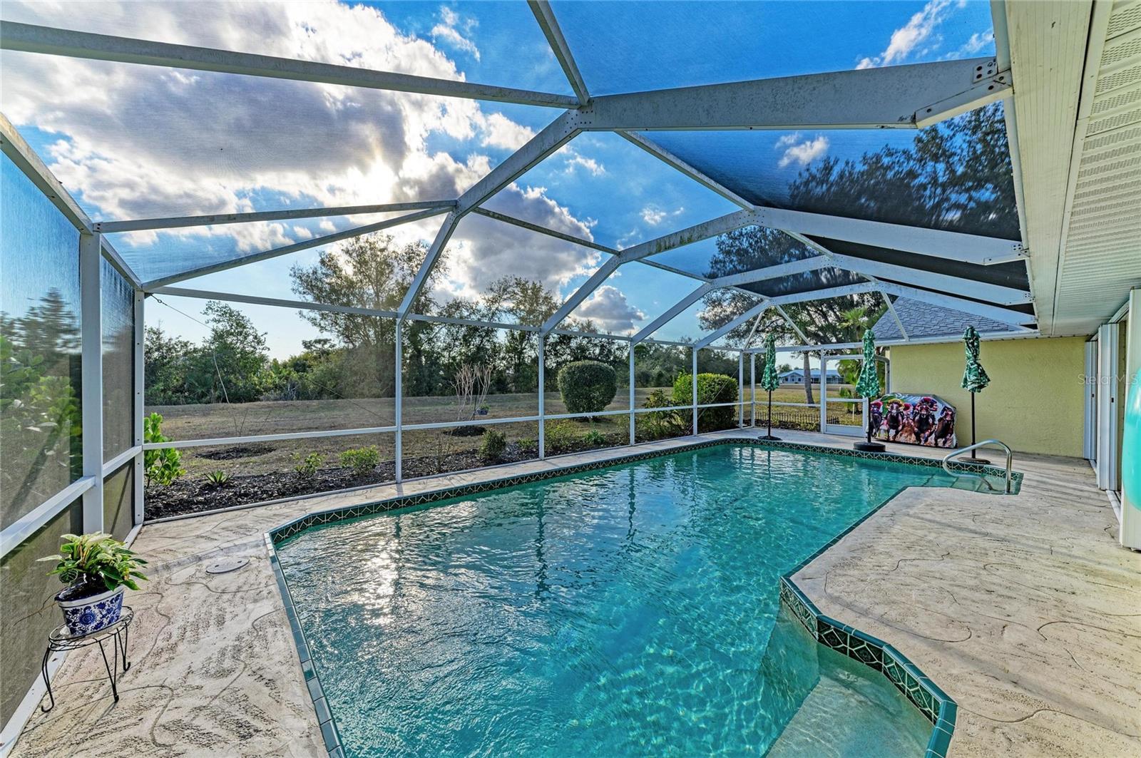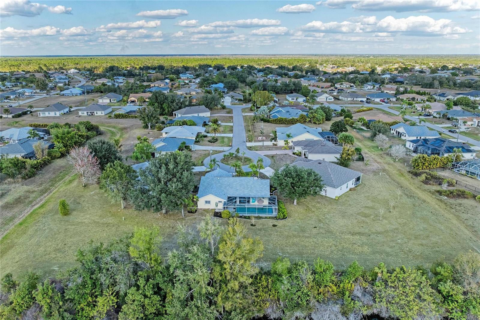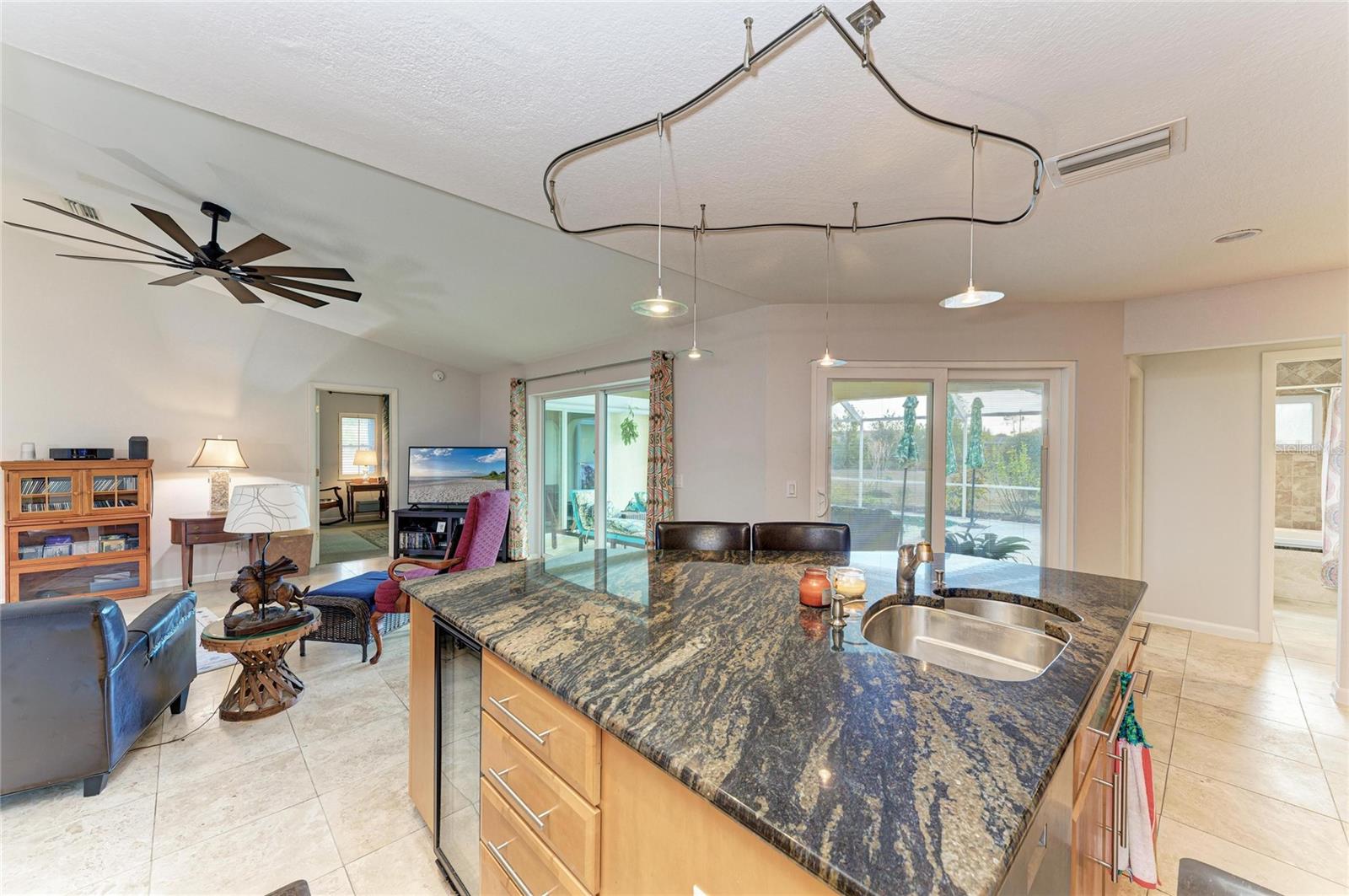 Located on a quiet cul-de-sac, this 3-bedroom, 2-bathroom residence sits on an oversized lot with a rear greenbelt providing additional privacy. The home offers an open-concept layout with a split floor plan, travertine flooring, vaulted ceilings, and double-pane windows with hurricane shutters. Sliding glass doors provide access to the covered lanai, pool, and backyard. The kitchen features stone countertops, wood cabinetry, stainless steel appliances, a built-in wine refrigerator, a large island, dual pantries, and a built-in desk area. A spacious laundry room includes a utility sink and ample space for folding and hanging. The primary suite includes lanai access via sliding doors, two walk-in closets, and an en-suite bathroom with dual sinks, vanity, and a walk-in shower with dual shower heads. Guest bedrooms are well-sized, and the guest bathroom includes a jetted tub. New Roof 2023 with 4 nails on straps, total AC and duct work 2022, hot water heater 2022, painted interior and exterior 2024, pool pump 2021 Additional features include a screened lanai, private pool, and backyard with no rear neighbors. Conveniently located in Deep Creek near shopping, dining, and local amenities.