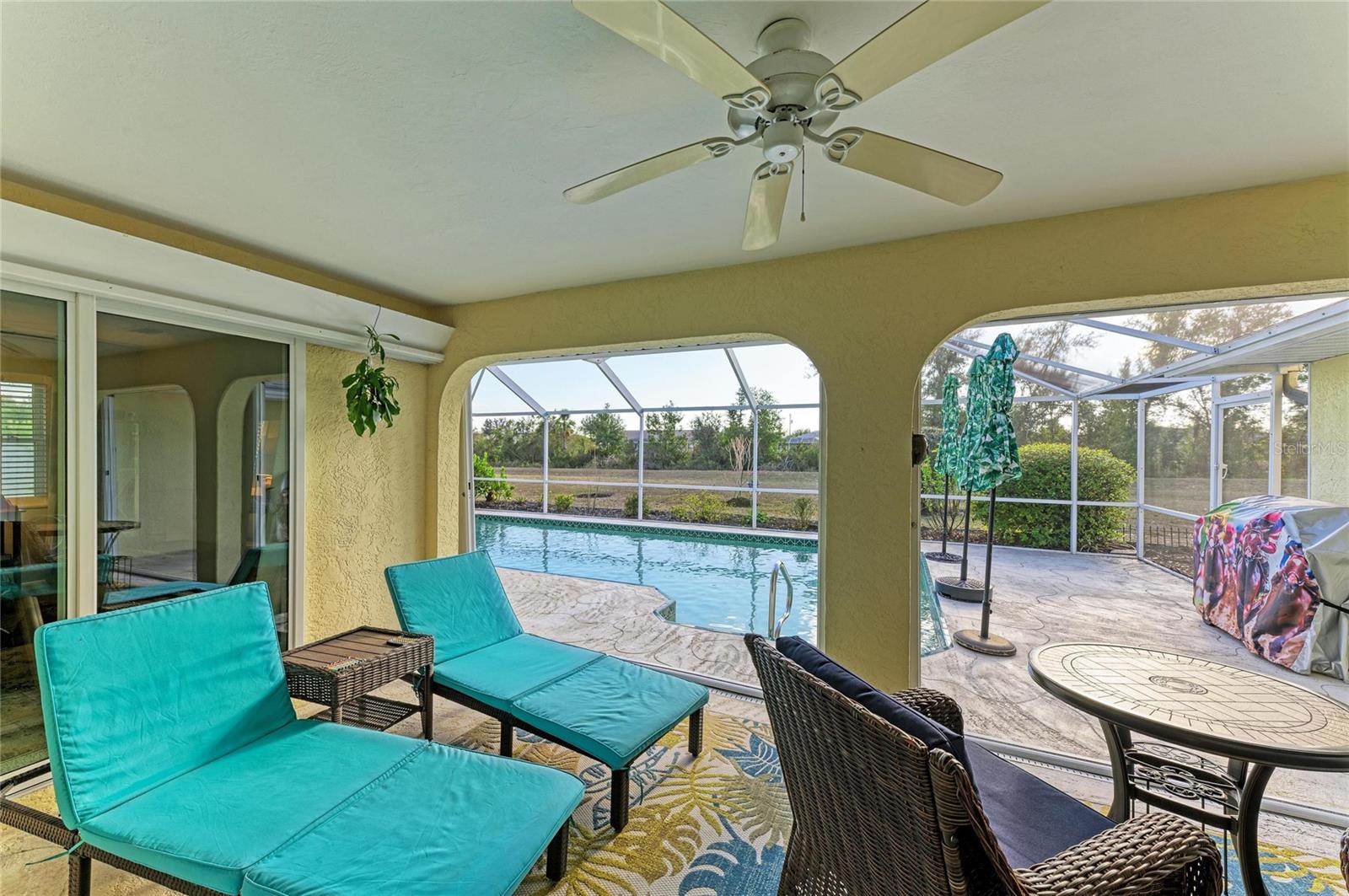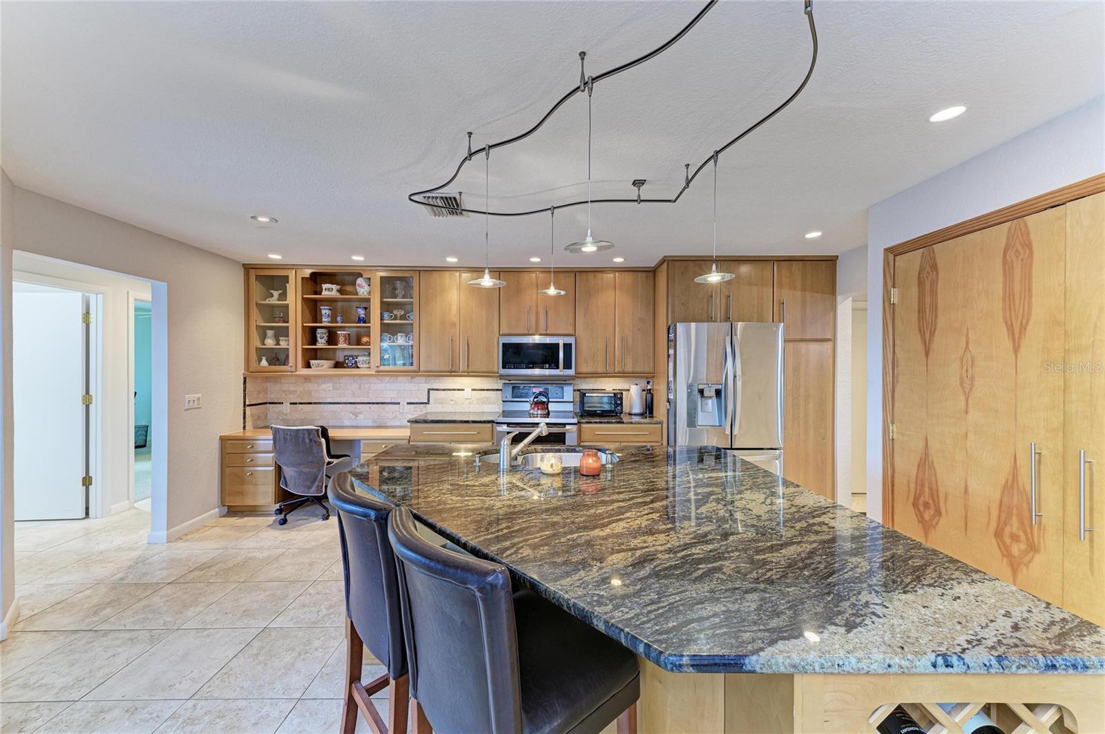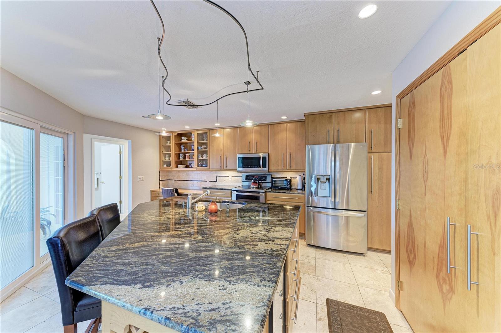 Located on a quiet cul-de-sac, this 3-bedroom, 2-bathroom residence sits on an oversized lot with a rear greenbelt providing additional privacy. The home offers an open-concept layout with a split floor plan, travertine flooring, vaulted ceilings, and double-pane windows with hurricane shutters. Sliding glass doors provide access to the covered lanai, pool, and backyard. The kitchen features stone countertops, wood cabinetry, stainless steel appliances, a built-in wine refrigerator, a large island, dual pantries, and a built-in desk area. A spacious laundry room includes a utility sink and ample space for folding and hanging. The primary suite includes lanai access via sliding doors, two walk-in closets, and an en-suite bathroom with dual sinks, vanity, and a walk-in shower with dual shower heads. Guest bedrooms are well-sized, and the guest bathroom includes a jetted tub. New Roof 2023 with 4 nails on straps, total AC and duct work 2022, hot water heater 2022, painted interior and exterior 2024, pool pump 2021 Additional features include a screened lanai, private pool, and backyard with no rear neighbors. Conveniently located in Deep Creek near shopping, dining, and local amenities.