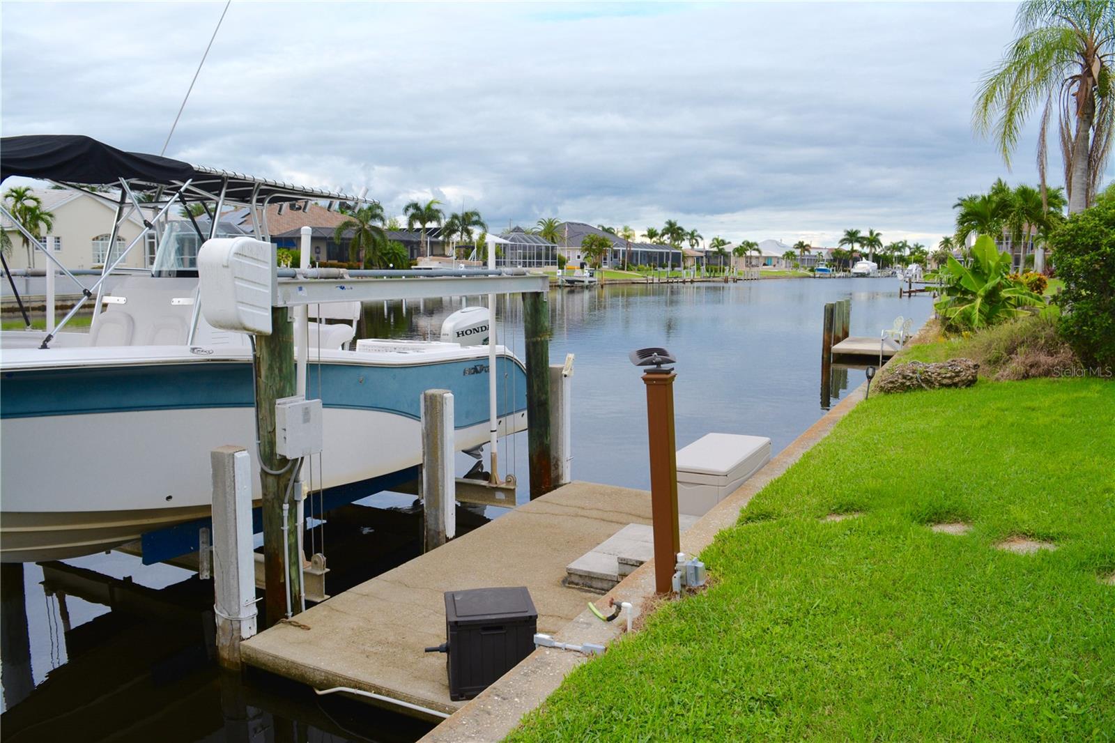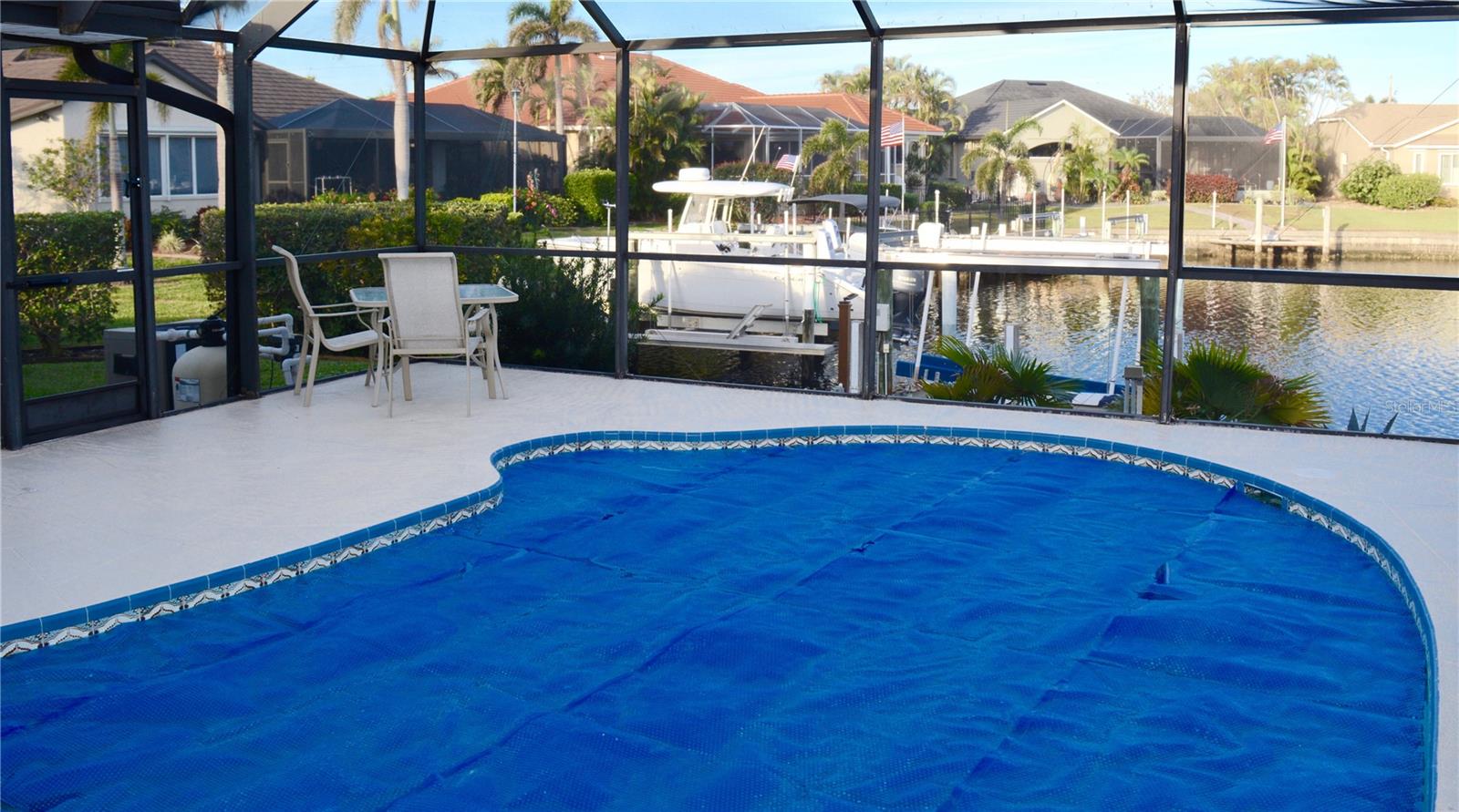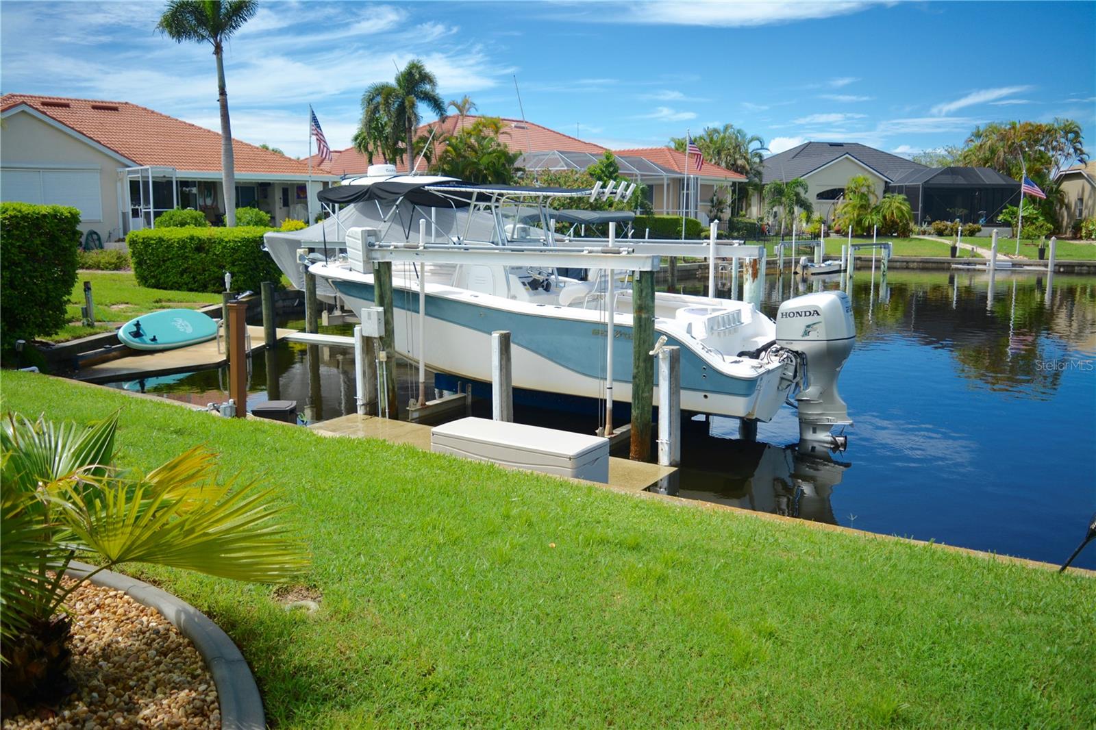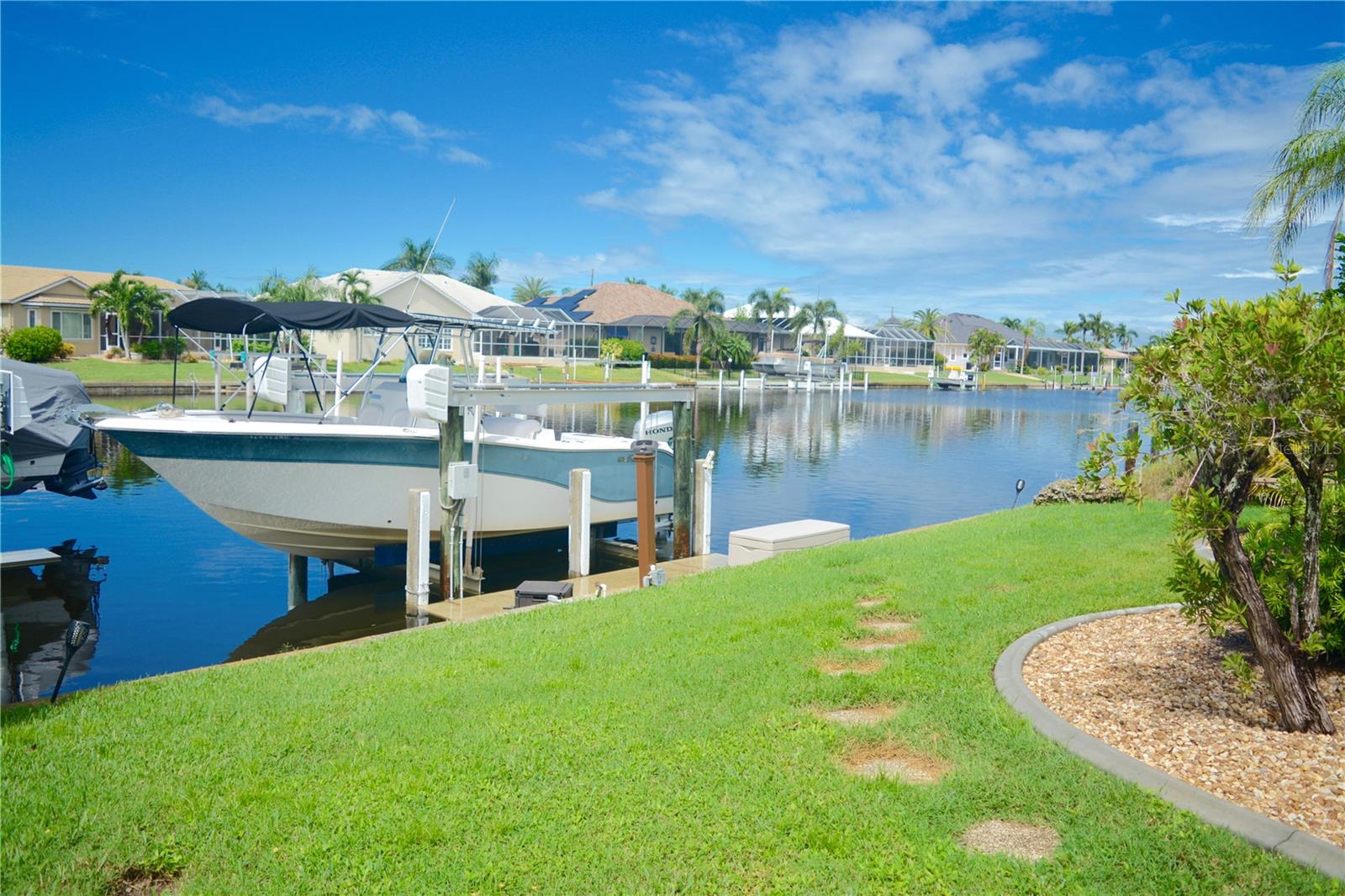 WATERFRONT pool home located in desirable deed restricted BURNT STORE ISLES with 2,269 square feet of living. This beautiful community offers water access as well as Golf at Twin Isles Country Club. Beautiful 4 bed, 2 bath CANAL HOME with POOL, 2-car garage. Salt Water Capable Pool Features 15,000 gallon 28X15X5 Ft deep with built-in Jets/sitting area and Pool Heater. Canal with wide sailboat basin providing access to Charlotte Harbor leading to the Gulf of Mexico. Minutes from the Twin Isles County Club for boaters with tennis, bocce, pool, renowned for its splendid golf course, and marina. Nestled on a tranquil cul-de-sac with 51’ OF WATER FRONTAGE/Seawall with CONCRETE DOCK with WATER and ELECTRICITY and a 12,000 lb. BOAT LIFT. The moment you arrive at this great home you will notice the Landscaped yard, cement tile roof, updated exterior paint, and lighting fixtures. Coastal décor greets you as you enter your home featuring ALL-NEW Luxury Vinyl Plank flooring throughout and interior paint. The kitchen showcases all-new stainless-steel appliances, an abundance of counter and cabinet space with updated wifi controlled interior fixtures, and new wifi ceiling fans throughout the home, breakfast bar, pantry closet, tray ceiling with new light fixture, dinette area that overlooks the pool and waterway beyond and is open to your family room. The spacious master suite, with private pool access, easily fits a king-size bedroom set and features a large walk-in closet with new closet adjustable closet shelving. Master bath with Walk-In Shower extended vanity, and linen closet. There are three additional bedrooms 2 of the 3 feature large Walk-In Closets walk-in closets and a second full bath that has direct access to the pool area. Relax while watching the Florida sunsets from your lanai. The two-car garage features an extra room that is ideal for a workshop, hobbyist, or additional storage. The home has an inside laundry room with a utility sink and extra storage, newer accordion shutters, a newly updated irrigation system, and an underground propane tank. This waterfront property is a boater’s and golfer’s dream. Close to I-75/US41 and Located in a popular boating and golf community, this home offers easy access to Yacht Club, Fishermen's Village, and the historic downtown area of Punta Gorda. You'll also have the opportunity to indulge in world-class fishing, boating, and fine dining. And if you're in the mood for a beach day, you're just a short drive away. Don't miss out on this incredible opportunity to own a home in this highly sought-after location. Come enjoy the Florida lifestyle in this impressive home. Taxes are Currently not Homesteaded. INFORMATION IS DEEMED RELIABLE BUT NOT GUARANTEED…TO BE VERIFIED BY THE BUYER AND/OR BUYER'S AGENT.