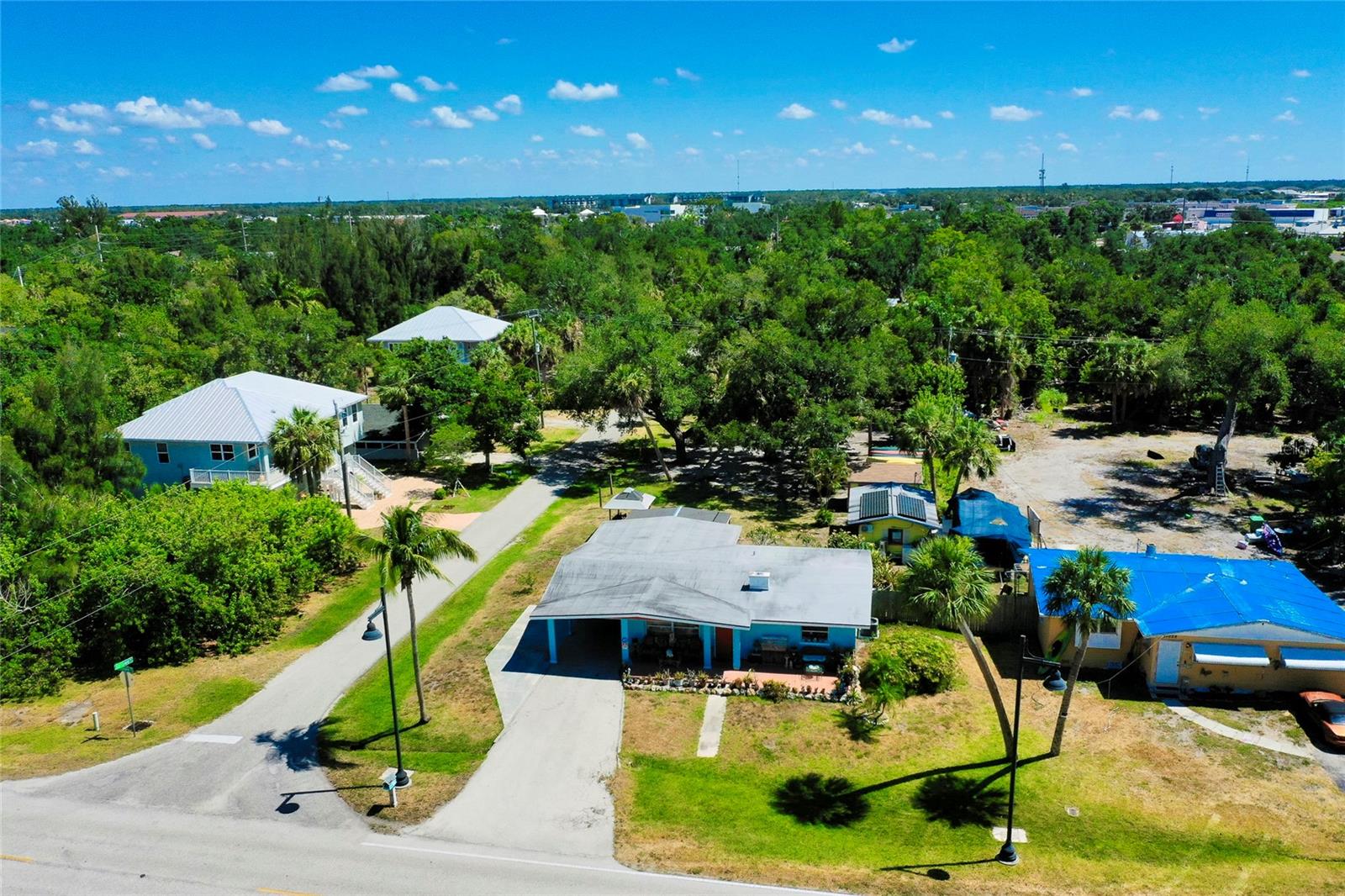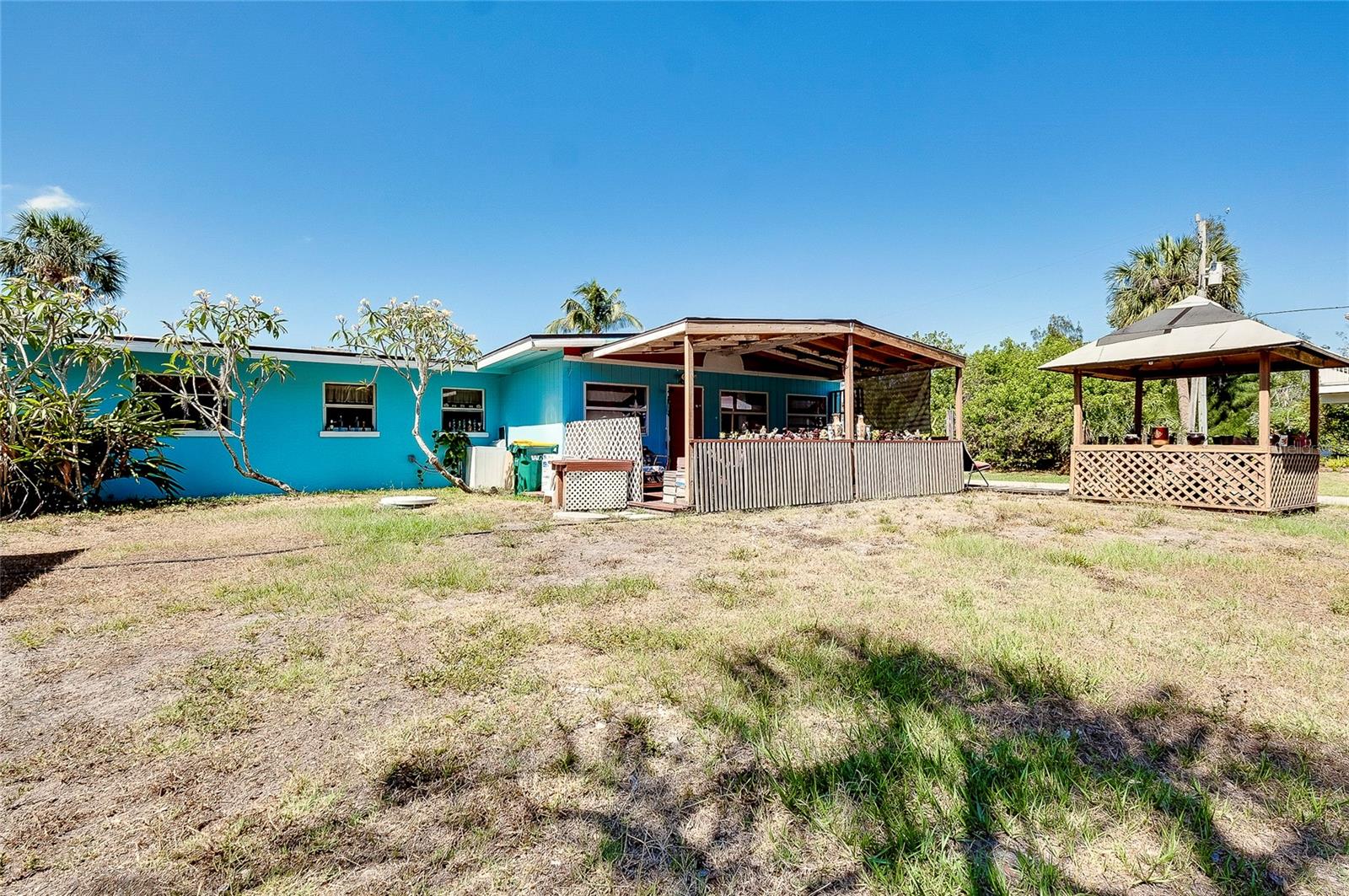 Welcome to your charming 1958 bungalow in the heart of Port Charlotte, Florida! This delightful home is perfectly situated directly across the street from Bayshore Live Oak Park, offering you immediate access to stunning coastline trails, playgrounds, picnic pavilions, fishing piers, and boat access. Enjoy the serene park views and the convenience of a less than 2-minute drive to the luxurious Sunseeker Resort Charlotte Harbor. The main house boasts 1,392 sq ft of comfortable living space, featuring 2 spacious bedrooms and 1 modern bathroom on a corner lot. The recently remodeled kitchen comes equipped with all new stainless-steel appliances, quartz counter tops, ideal for any home chef. The main living area is adorned with elegant ceramic tile, while the bedrooms feature classic terrazzo tile. The full bathroom includes a walk-in tiled shower for ease of use. Step outside to your covered back porch and enjoy the added charm of a gazebo, perfect for relaxing or entertaining. The property also includes a handy storage shed and a cozy in-law apartment complete with a full bath, kitchenette, and split A/C unit—ideal for guests or potential rental income including Airbnb potential. One of the standout features of this home is the solar panel system, providing you with reduced electricity costs. The generous 0.35-acre lot is shaded by towering oak trees and even has tree swings. Whether you're looking for a primary residence, a vacation rental like Airbnb, or a prime location to build your dream home, this property offers endless possibilities. Don’t miss out on this unique opportunity to own a piece of Port Charlotte’s charm with unobstructed views of Charlotte Harbor.