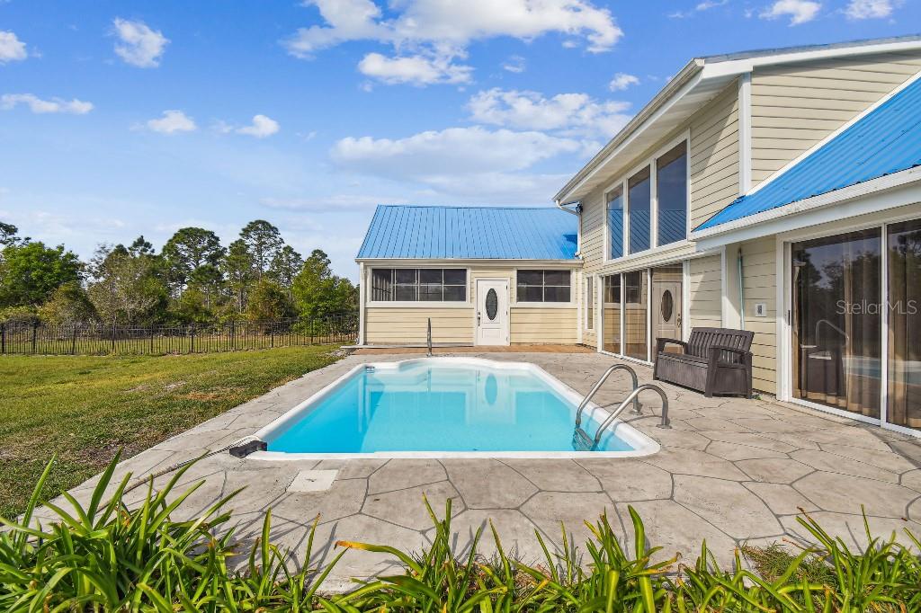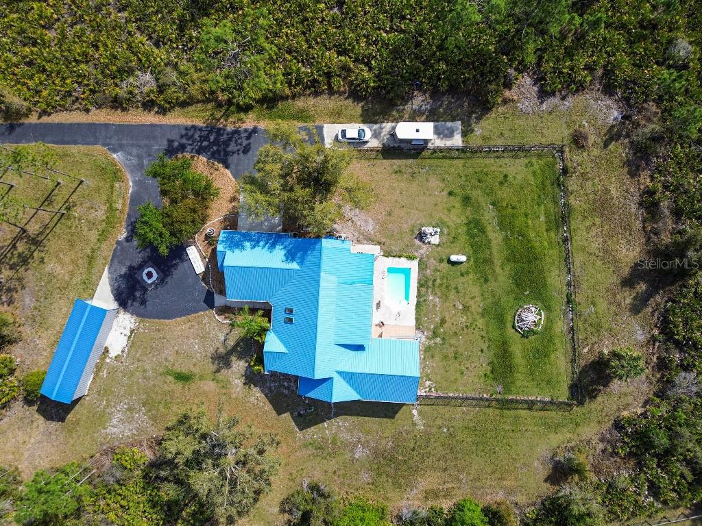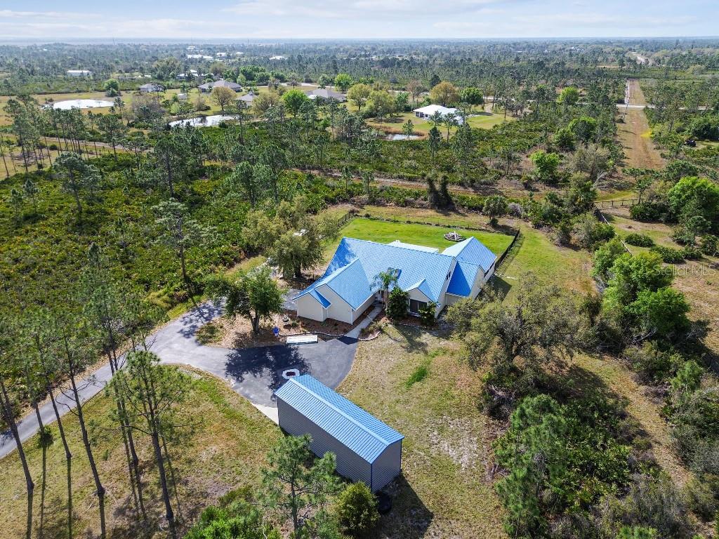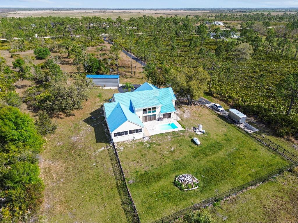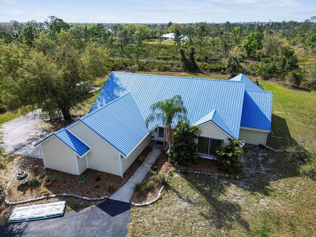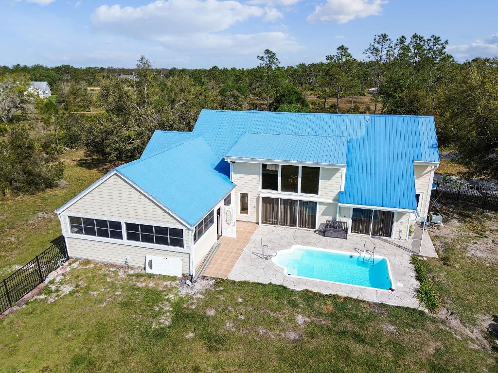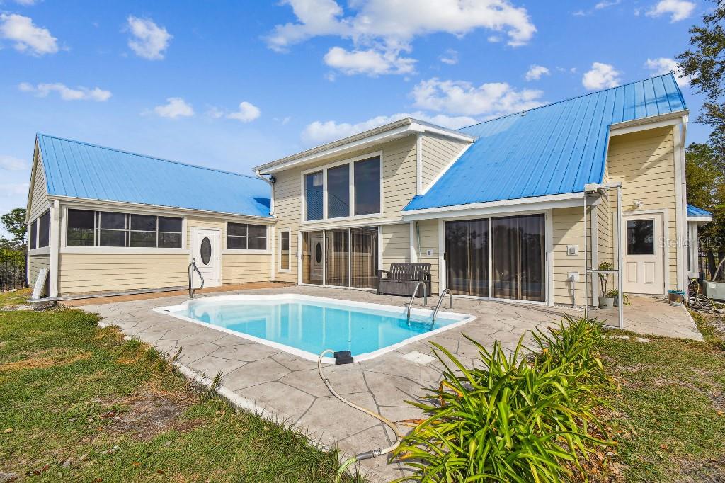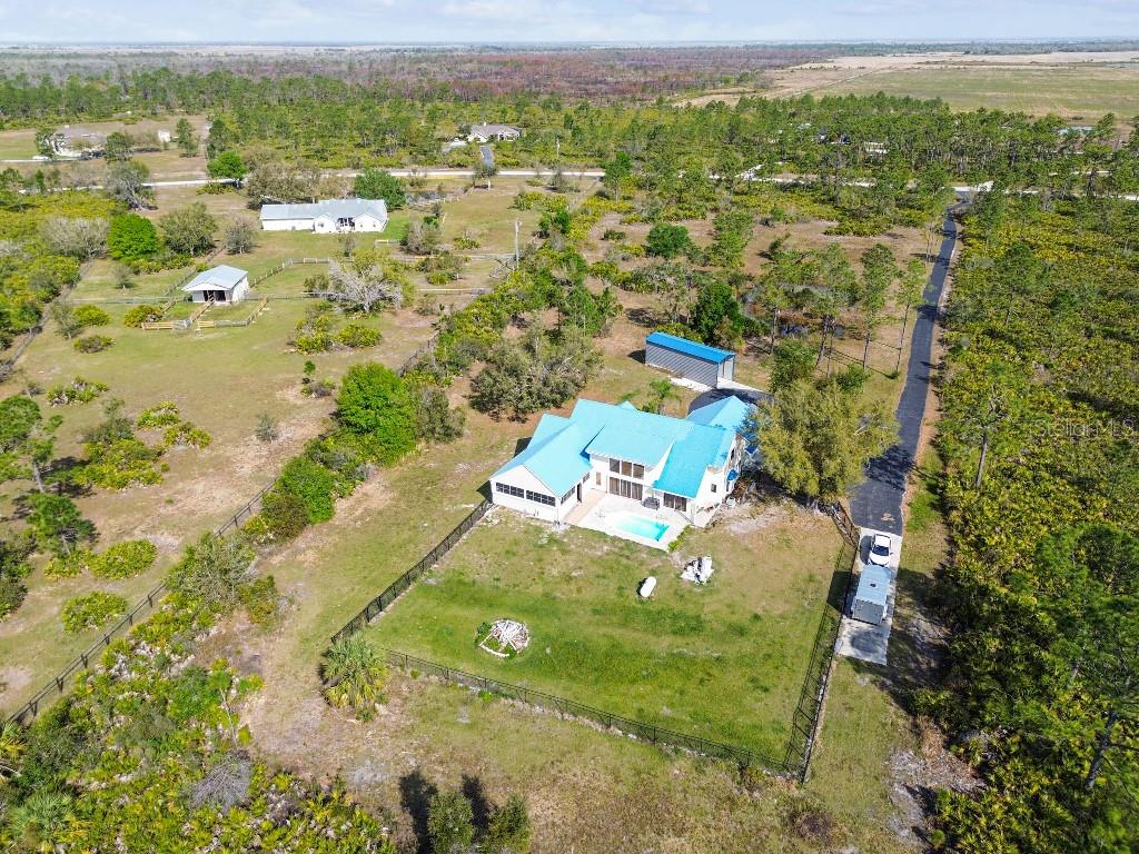 Welcome to country living on this 5 acres in the equestrian deed restricted community of Prairie Creek Park. This property features 3,308 sf of air conditioned living space with a heated bonus room that is an additional 480 sf off of the inground pool. This home offers many updates – recently resided with Hardie Board (12/23) has a 15 year color warranty and 30 year materials warranty, metal roof was repainted in 2022 and all new screws replaced (8/23), new LVP flooring in the living and dining rooms (10/23), kitchen, entry, hallway, bathrooms and laundry room have LVP as well. Kitchen has updated granite counter tops with hardwood cabinets that accentuate the stainless steel appliances. There is a large walk in pantry in the kitchen. The open living room dining room has abundant natural light coming into the home through five sliding glass doors and three oversized windows that lead to the vaulted ceiling. There are built in cabinets for your TV with shelves for books and collectibles. The master suite has a walk in closet, walk in shower dual sinks and dual toilets. A second bedroom with dual closets is on the main floor as well. The two other bedrooms are upstairs separated by a large loft that can be a game room, exercise room or anything else you want it to be. There is a full bathroom with tub upstairs. There is a large amount of the backyard fenced for peace of mind with young ones or pets to play in. A 2.5 car garage fits two vehicles nicely with room for toys and a workshop. The RV garage out front will fit a 40 ft RV and has power in the garage.