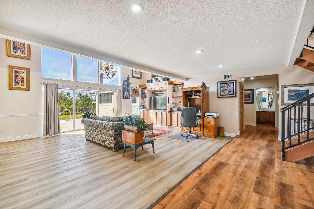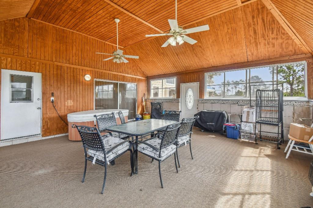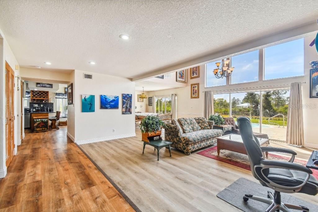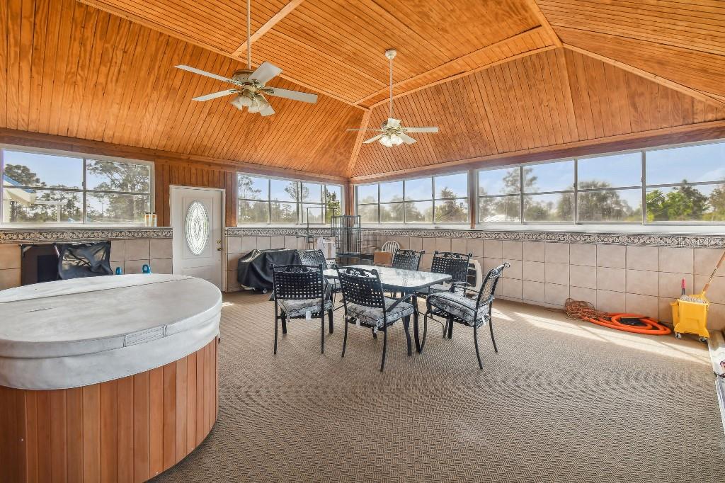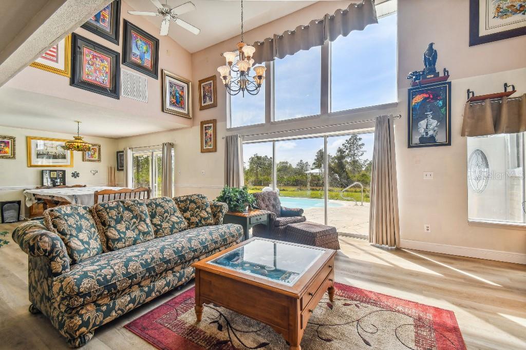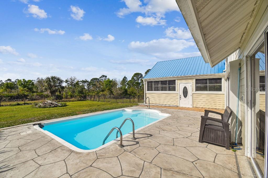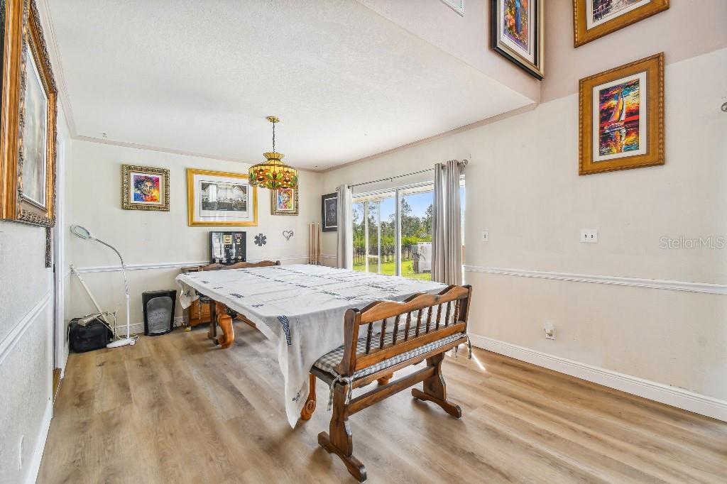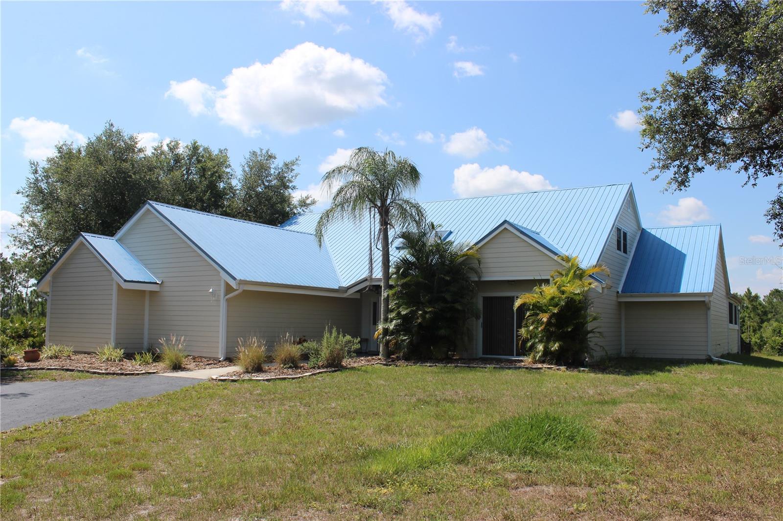 Welcome to country living on this 5 acres in the equestrian deed restricted community of Prairie Creek Park. This property features 3,308 sf of air conditioned living space with a heated bonus room that is an additional 480 sf off of the inground pool. This home offers many updates – recently resided with Hardie Board (12/23) has a 15 year color warranty and 30 year materials warranty, metal roof was repainted in 2022 and all new screws replaced (8/23), new LVP flooring in the living and dining rooms (10/23), kitchen, entry, hallway, bathrooms and laundry room have LVP as well. Kitchen has updated granite counter tops with hardwood cabinets that accentuate the stainless steel appliances. There is a large walk in pantry in the kitchen. The open living room dining room has abundant natural light coming into the home through five sliding glass doors and three oversized windows that lead to the vaulted ceiling. There are built in cabinets for your TV with shelves for books and collectibles. The master suite has a walk in closet, walk in shower dual sinks and dual toilets. A second bedroom with dual closets is on the main floor as well. The two other bedrooms are upstairs separated by a large loft that can be a game room, exercise room or anything else you want it to be. There is a full bathroom with tub upstairs. There is a large amount of the backyard fenced for peace of mind with young ones or pets to play in. A 2.5 car garage fits two vehicles nicely with room for toys and a workshop. The RV garage out front will fit a 40 ft RV and has power in the garage.