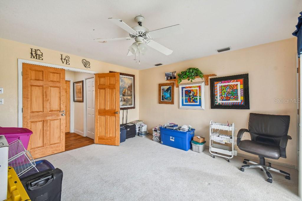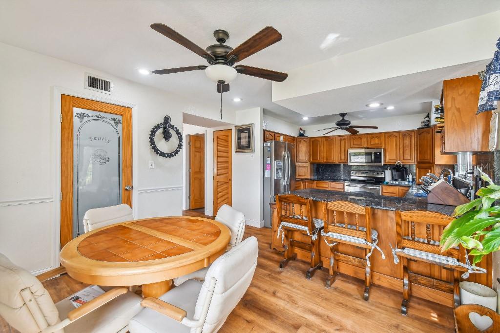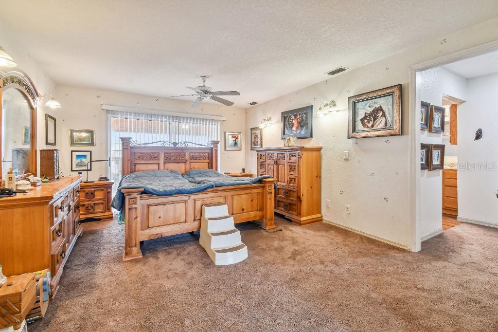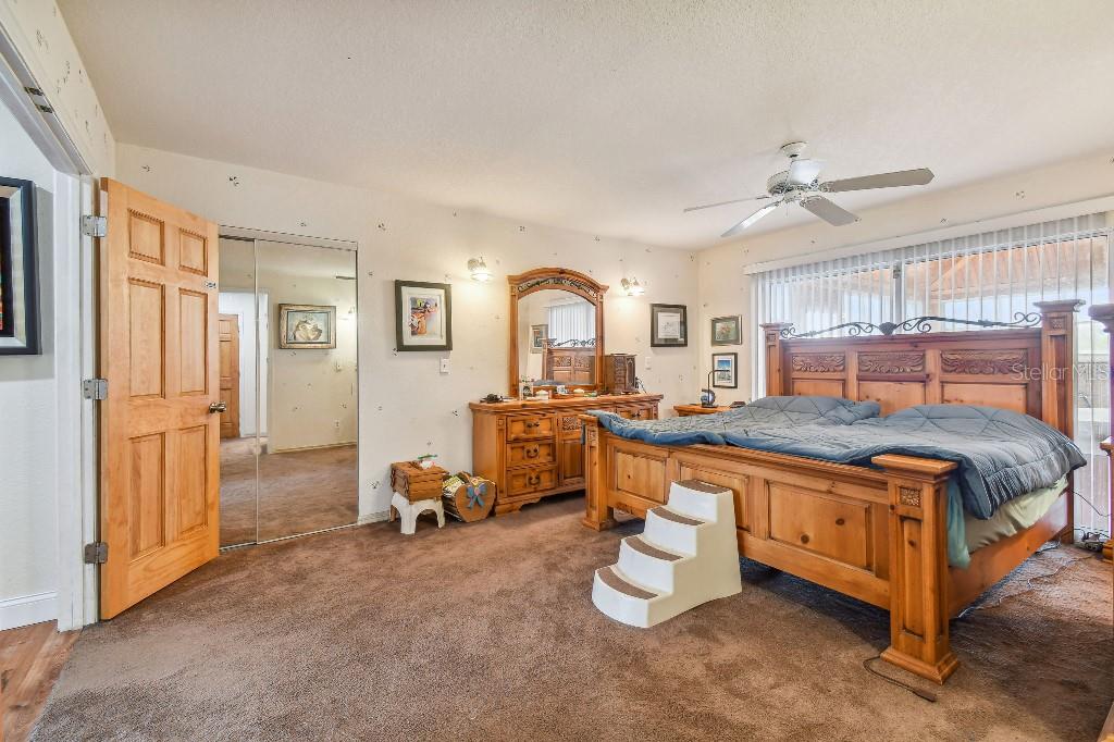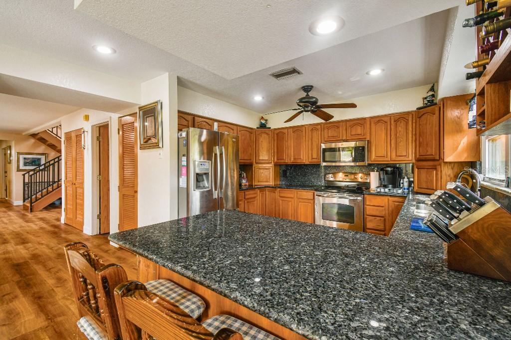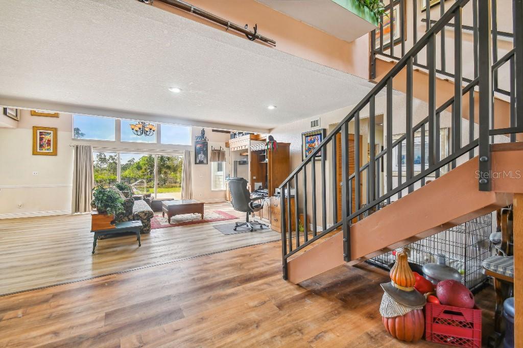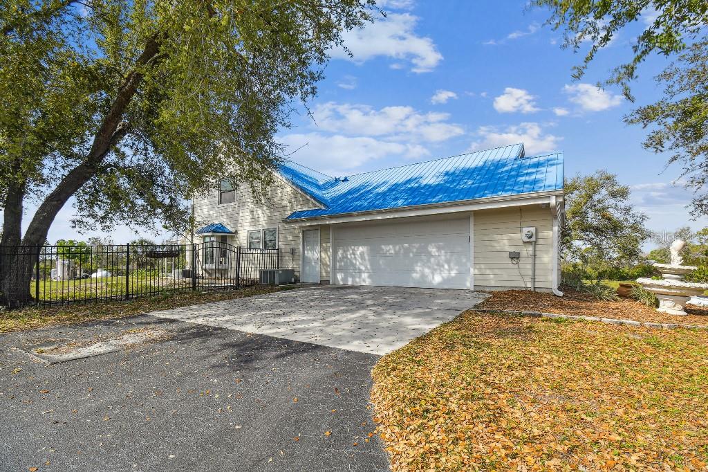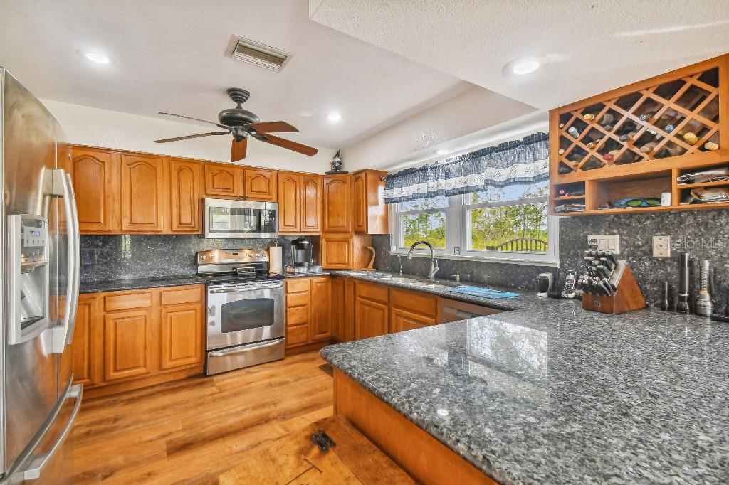 Welcome to country living on this 5 acres in the equestrian deed restricted community of Prairie Creek Park. This property features 3,308 sf of air conditioned living space with a heated bonus room that is an additional 480 sf off of the inground pool. This home offers many updates – recently resided with Hardie Board (12/23) has a 15 year color warranty and 30 year materials warranty, metal roof was repainted in 2022 and all new screws replaced (8/23), new LVP flooring in the living and dining rooms (10/23), kitchen, entry, hallway, bathrooms and laundry room have LVP as well. Kitchen has updated granite counter tops with hardwood cabinets that accentuate the stainless steel appliances. There is a large walk in pantry in the kitchen. The open living room dining room has abundant natural light coming into the home through five sliding glass doors and three oversized windows that lead to the vaulted ceiling. There are built in cabinets for your TV with shelves for books and collectibles. The master suite has a walk in closet, walk in shower dual sinks and dual toilets. A second bedroom with dual closets is on the main floor as well. The two other bedrooms are upstairs separated by a large loft that can be a game room, exercise room or anything else you want it to be. There is a full bathroom with tub upstairs. There is a large amount of the backyard fenced for peace of mind with young ones or pets to play in. A 2.5 car garage fits two vehicles nicely with room for toys and a workshop. The RV garage out front will fit a 40 ft RV and has power in the garage.
