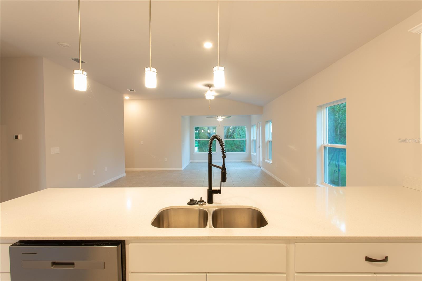 ***NEW CONSTRUCTION, NO WAIT, MOVE-IN READY!*** (+$15,000 FLEX CASH incentive!) Elevate your lifestyle with the opulence of the Sanibel II floorplan presented by Carpenter Homes—a masterpiece within the Florida Living Series, certified by the Florida Green Building Coalition (FGBC). This home features 4 bedrooms and 2 full bathrooms. This dream home is designed and built to immerse you in luxury. As you enter, a beautiful kitchen welcomes you, with an expansive, oversized bar that seamlessly flows into the living and dining area. The finesse of soft-close, Painted White 36" cabinets, and upgraded Blanco Matrix quartz countertops add a functional touch of luxury to the kitchen. Kitchen upgrades include a Moen Align matte black kitchen faucet, garbage disposal, and sleek stainless steel energy efficient appliances. This home exudes sophistication with a vaulted ceiling that unveils a spacious Florida Room, creating an indoor-outdoor haven. Additionally, Carpenter Homes provides an upgraded brushed nickel lighting package including pendants over the kitchen bar, and vanity fixtures in both bathrooms, accenting the overall lighting design. Brushed steel finish ceiling fans in each bedroom, as well as the great room, helps to circulate air flow and keep you cool in the Florida weather. Complimenting the expansive living area is Torino 12x24 grigio (gray) ceramic tile flooring. The Owner's suite is a sanctuary of indulgence, showcasing dual sinks, impeccably tiled Magnisi White 8x12 walls in the shower, and a generously sized walk-in closet. The home boasts Magnisi White 8x12 upgraded tiled walls in in the second bath/shower, a Blanco Matrix quartz vanity top, and Moen Align chrome faucets and shower/tub trim kits. The ampleness of this home continues with a utility room, and additions such as energy-efficient R-4.1 insulation on concrete exterior walls, Taexx tubes for pest control, and fabric hurricane shutters for every window. The Florida friendly landscaped yard is complemented by an irrigation system with a rain sensor to help maximize efficiency. The expansive 2-car garage, complete with garage door opener and two remotes, not only provides ample space for your everyday needs but also ensures the utmost convenience and versatility for all your storage and parking requirements. Step into a world where extravagance meets eco-conscious living—your forever home awaits, a testament to timeless elegance and modern sustainability. Available to view any time.