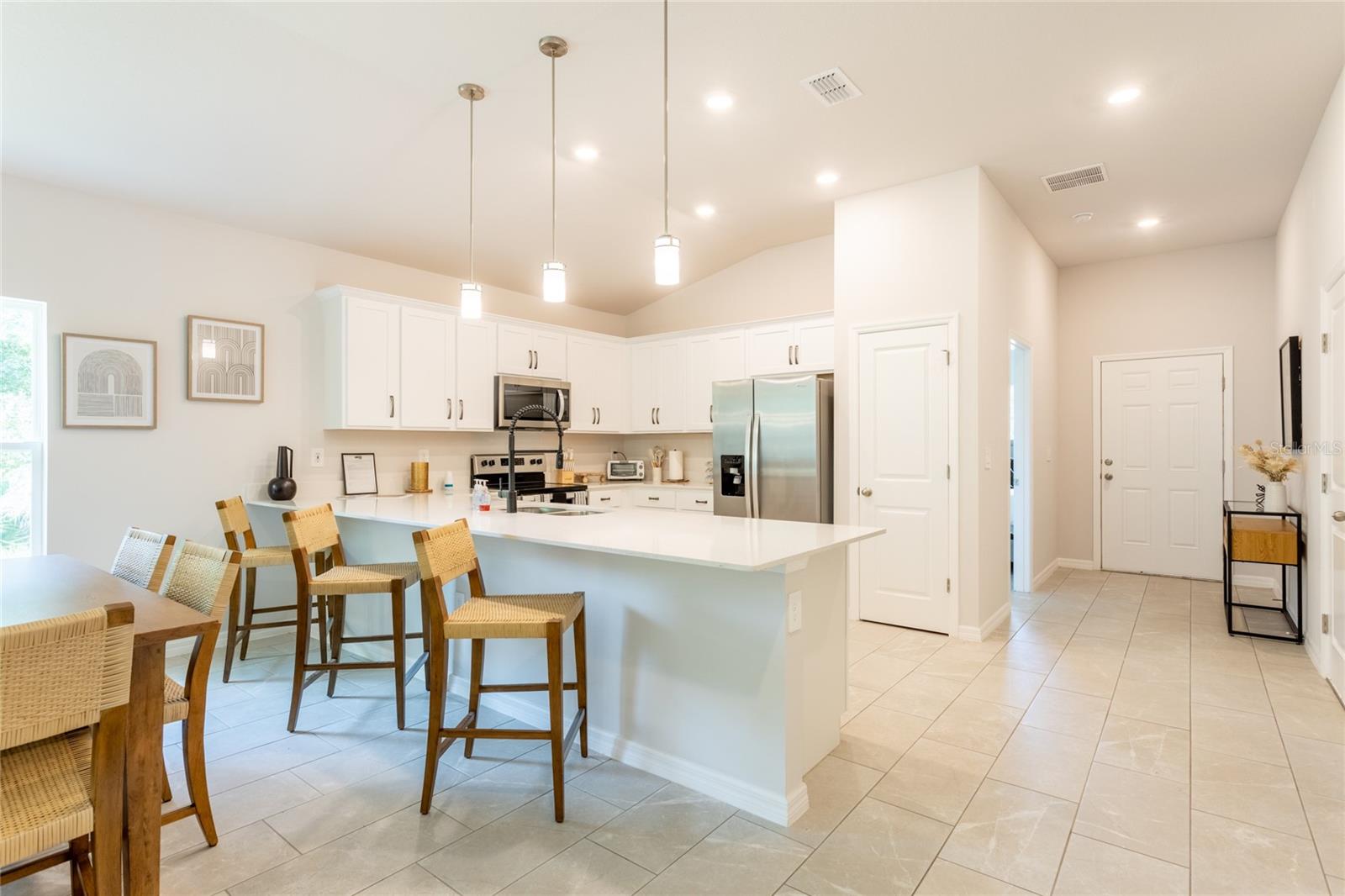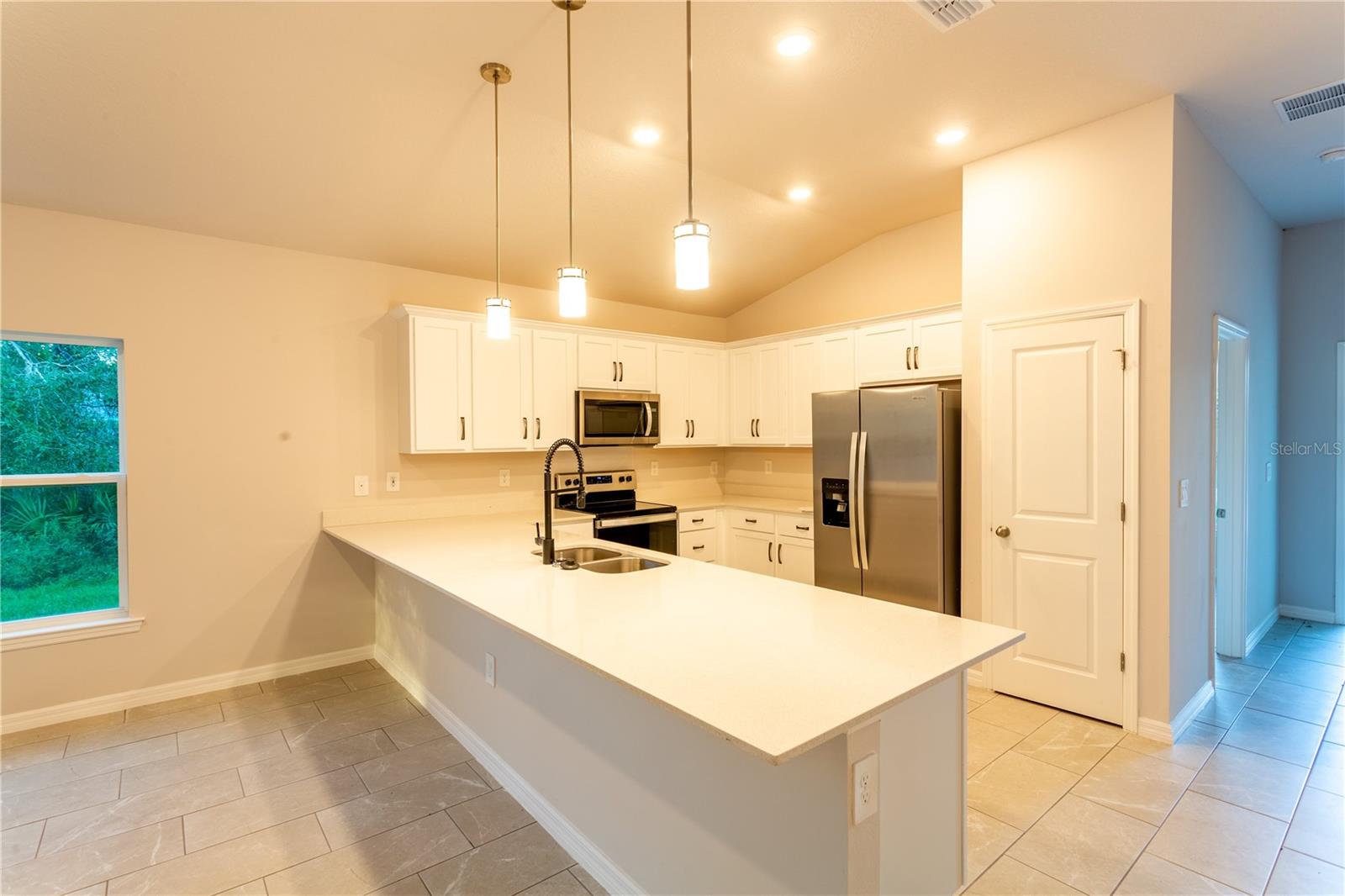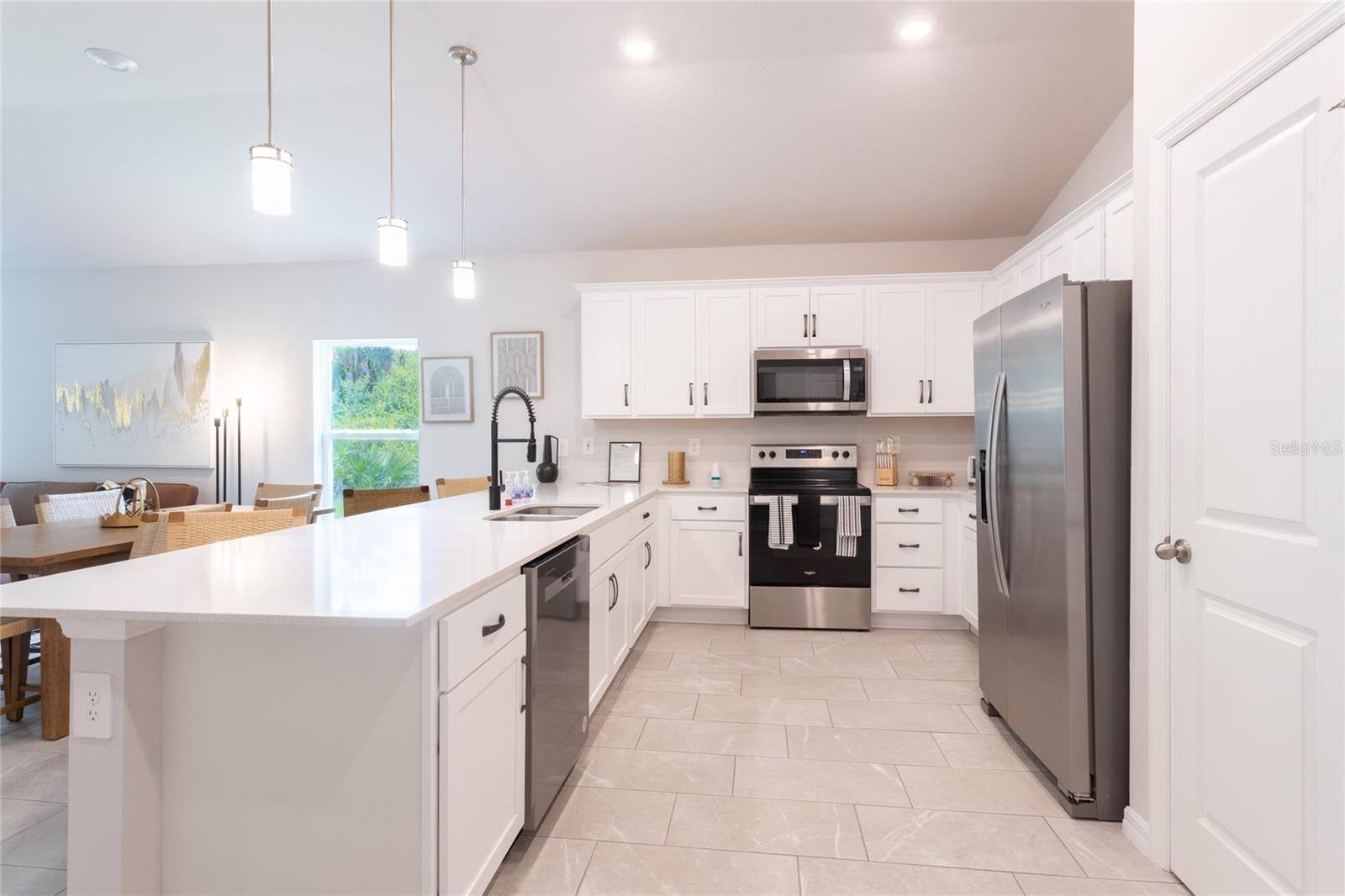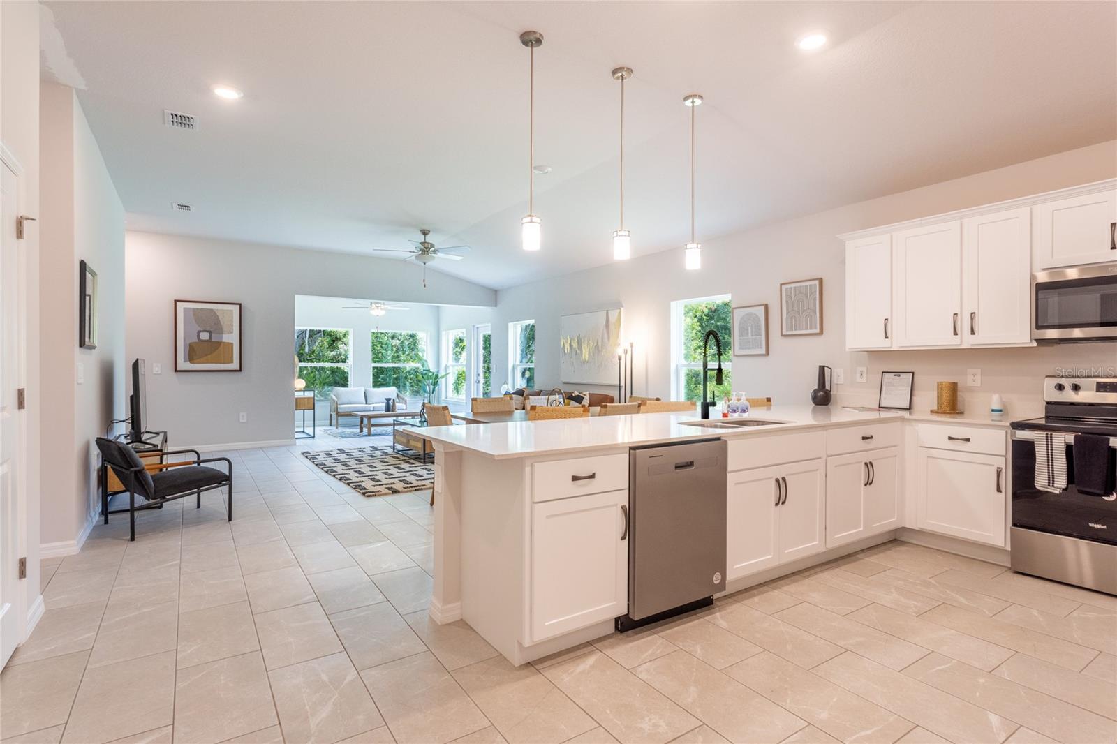***NEW CONSTRUCTION, NO WAIT, MOVE-IN READY!*** Elevate your lifestyle with the opulence of the Sanibel II floorplan presented by Carpenter Homes—a masterpiece within the Florida Living Series, certified by the Florida Green Building Coalition (FGBC). This home features 4 bedrooms and 2 full bathrooms. This dream home is designed and built to immerse you in luxury. As you enter, a beautiful kitchen welcomes you, with an expansive, oversized bar that seamlessly flows into the living and dining area. The finesse of soft-close, Painted White 36" cabinets, and upgraded Blanco Matrix quartz countertops add a functional touch of luxury to the kitchen. Kitchen upgrades include a Moen Align matte black kitchen faucet, garbage disposal, and sleek stainless steel energy efficient appliances. This home exudes sophistication with a vaulted ceiling that unveils a spacious Florida Room, creating an indoor-outdoor haven. Additionally, Carpenter Homes provides an upgraded brushed nickel lighting package including pendants over the kitchen bar, and vanity fixtures in both bathrooms, accenting the overall lighting design. Brushed steel finish ceiling fans in each bedroom, as well as the great room, helps to circulate air flow and keep you cool in the Florida weather. Complimenting the expansive living area is Torino 12x24 grigio (gray) ceramic tile flooring. The Owner's suite is a sanctuary of indulgence, showcasing dual sinks, impeccably tiled Magnisi White 8x12 walls in the shower, and a generously sized walk-in closet. The home boasts Magnisi White 8x12 upgraded tiled walls in in the second bath/shower, a Blanco Matrix quartz vanity top, and Moen Align chrome faucets and shower/tub trim kits. The ampleness of this home continues with a utility room, and additions such as energy-efficient R-4.1 insulation on concrete exterior walls, Taexx tubes for pest control, and fabric hurricane shutters for every window. The Florida friendly landscaped yard is complemented by an irrigation system with a rain sensor to help maximize efficiency. The expansive 2-car garage, complete with garage door opener and two remotes, not only provides ample space for your everyday needs but also ensures the utmost convenience and versatility for all your storage and parking requirements. Step into a world where extravagance meets eco-conscious living—your forever home awaits, a testament to timeless elegance and modern sustainability. Available to view any time!