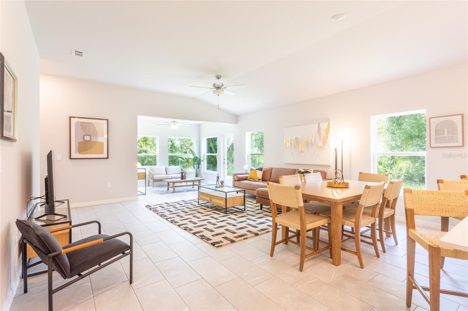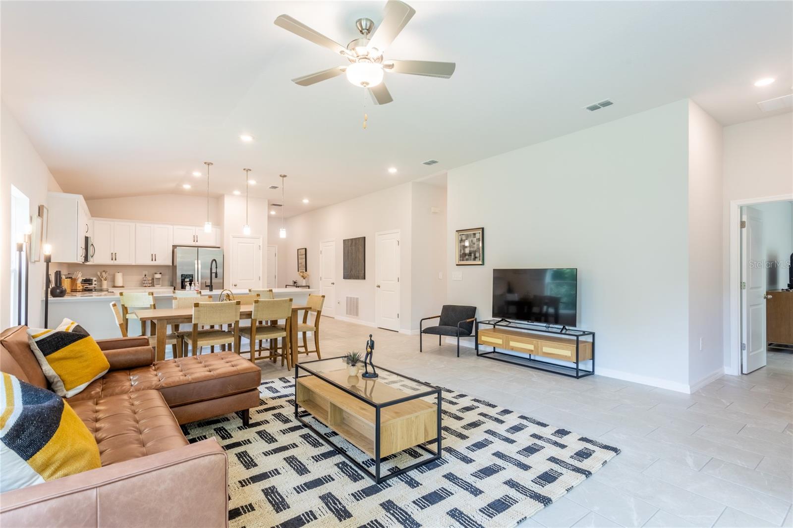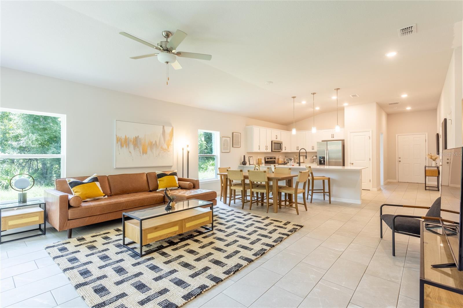 ***NEW CONSTRUCTION, NO WAIT, MOVE-IN READY!*** Elevate your lifestyle with the opulence of the Sanibel II floorplan presented by Carpenter Homes—a masterpiece within the Florida Living Series, certified by the Florida Green Building Coalition (FGBC). This home features 4 bedrooms and 2 full bathrooms. This dream home is designed and built to immerse you in luxury. As you enter, a beautiful kitchen welcomes you, with an expansive, oversized bar that seamlessly flows into the living and dining area. The finesse of soft-close, Painted White 36" cabinets, and upgraded Blanco Matrix quartz countertops add a functional touch of luxury to the kitchen. Kitchen upgrades include a Moen Align matte black kitchen faucet, garbage disposal, and sleek stainless steel energy efficient appliances. This home exudes sophistication with a vaulted ceiling that unveils a spacious Florida Room, creating an indoor-outdoor haven. Additionally, Carpenter Homes provides an upgraded brushed nickel lighting package including pendants over the kitchen bar, and vanity fixtures in both bathrooms, accenting the overall lighting design. Brushed steel finish ceiling fans in each bedroom, as well as the great room, helps to circulate air flow and keep you cool in the Florida weather. Complimenting the expansive living area is Torino 12x24 grigio (gray) ceramic tile flooring. The Owner's suite is a sanctuary of indulgence, showcasing dual sinks, impeccably tiled Magnisi White 8x12 walls in the shower, and a generously sized walk-in closet. The home boasts Magnisi White 8x12 upgraded tiled walls in in the second bath/shower, a Blanco Matrix quartz vanity top, and Moen Align chrome faucets and shower/tub trim kits. The ampleness of this home continues with a utility room, and additions such as energy-efficient R-4.1 insulation on concrete exterior walls, Taexx tubes for pest control, and fabric hurricane shutters for every window. The Florida friendly landscaped yard is complemented by an irrigation system with a rain sensor to help maximize efficiency. The expansive 2-car garage, complete with garage door opener and two remotes, not only provides ample space for your everyday needs but also ensures the utmost convenience and versatility for all your storage and parking requirements. Step into a world where extravagance meets eco-conscious living—your forever home awaits, a testament to timeless elegance and modern sustainability. Available to view any time!