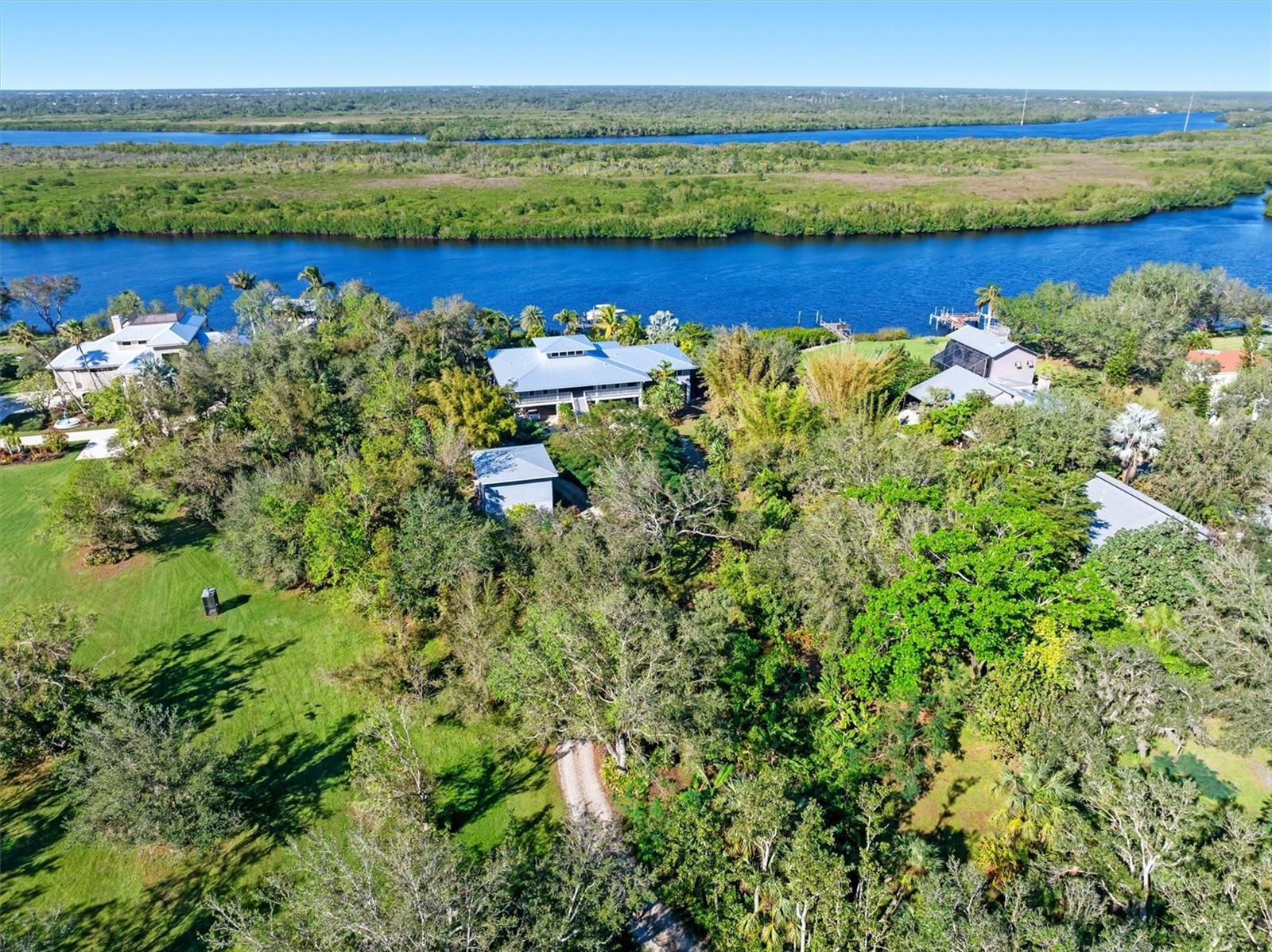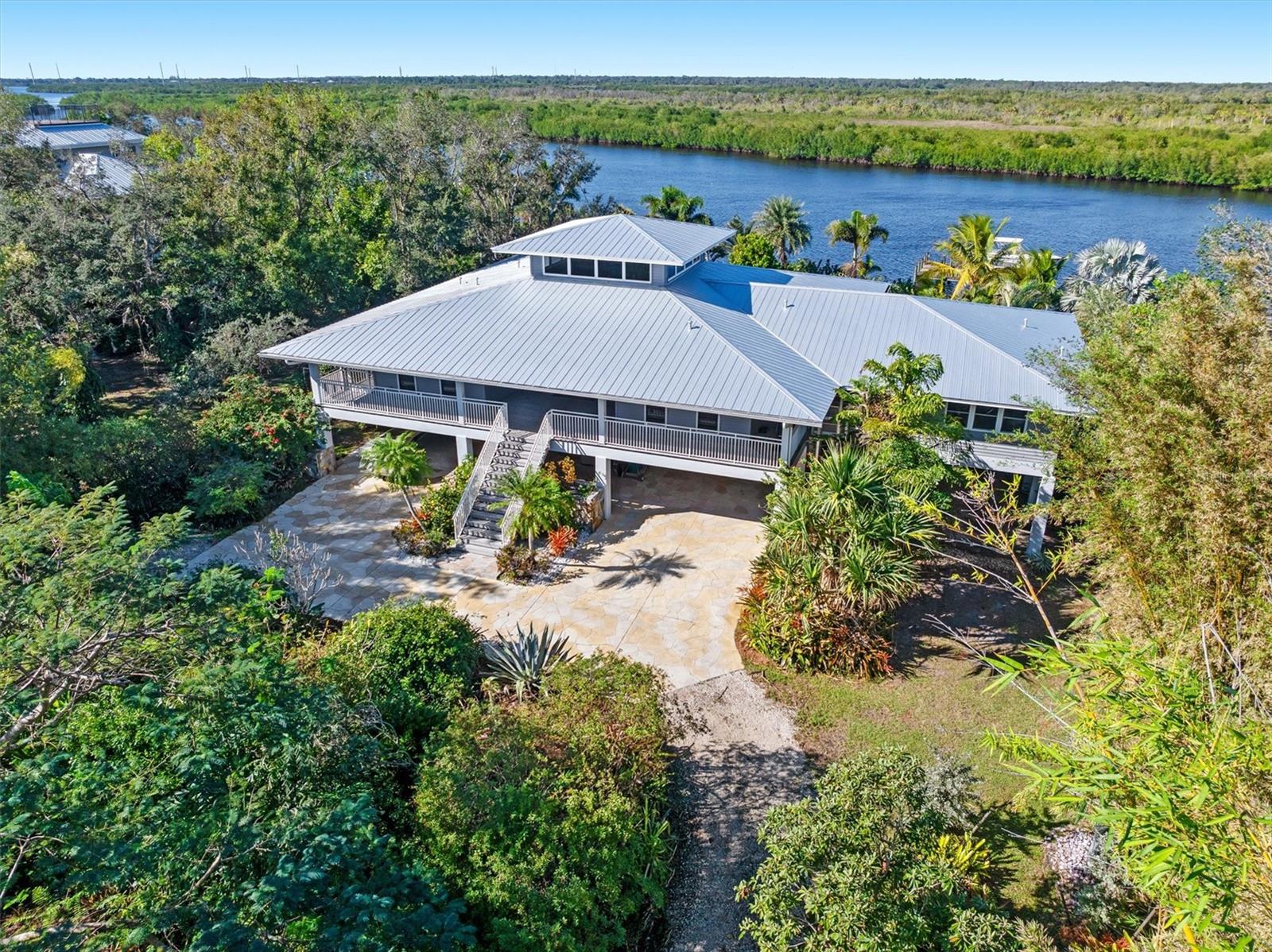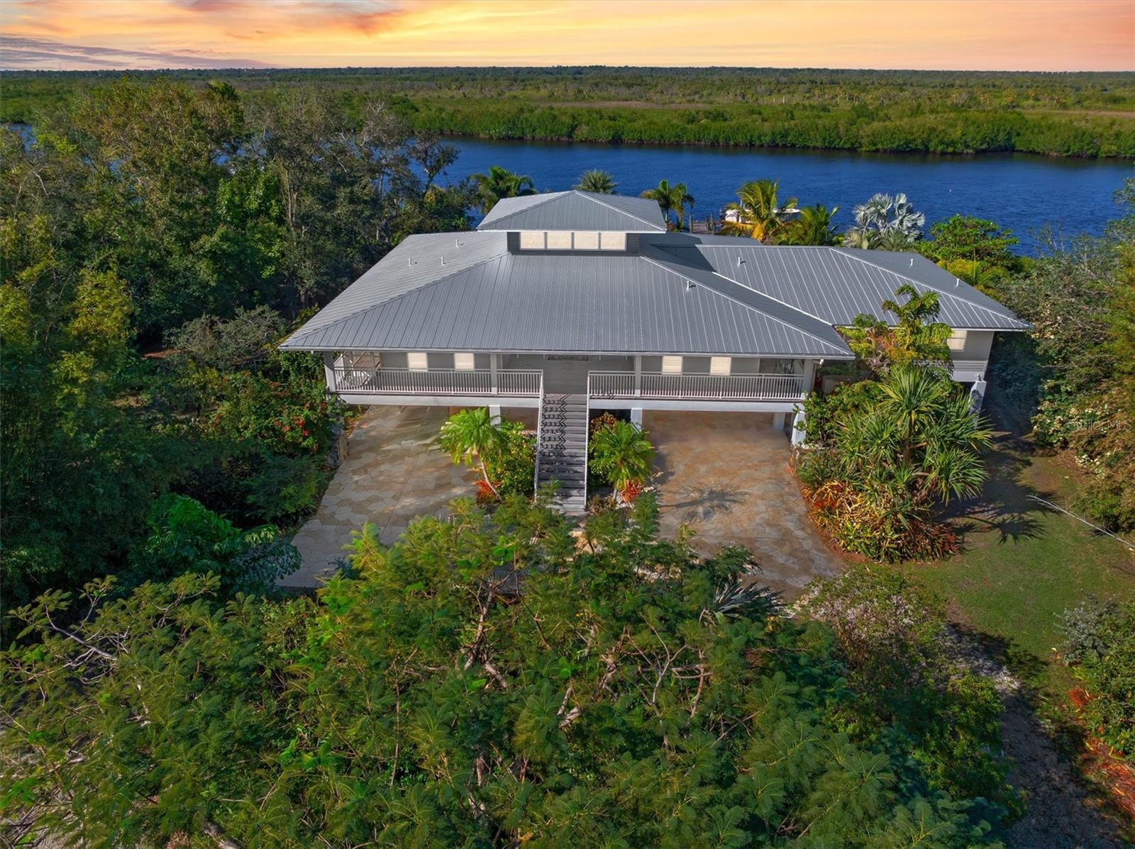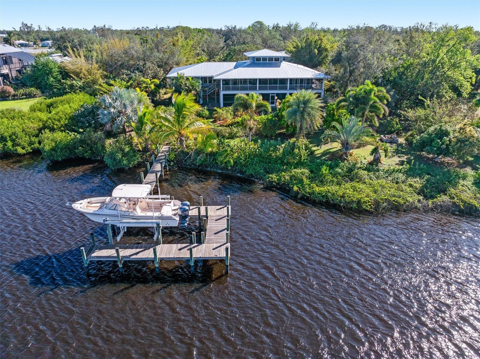 Welcome to Your Luxurious Private Sanctuary! From the moment you arrive, this exceptional estate welcomes you with lush, mature landscaping that exudes sophistication and tranquility. The stunning Key West-style home, nestled in a private, secluded setting, offers unmatched serenity. As you approach the handcrafted, imported wooden front doors, you are greeted by an expansive living space with soaring ceilings and an abundance of natural light, setting the stage for comfort and elegance. Designed to present the best of Florida living, this extraordinary home features a loft that provides a remarkable 270-degree panoramic view. Elevated on a peaceful riverbank, the home boasts unobstructed vistas of the river and a serene mangrove island, offering an idyllic setting for both relaxation and entertaining. Large windows throughout the home invite refreshing breezes and showcase breathtaking sunsets over the Peace River Basin and Hidden Creek. Set on over 2 acres of prime land, this custom executive home offers more than 3,700 square feet of luxurious, air-conditioned living space. The thoughtfully designed split-bedroom layout ensures privacy, with three spacious bedrooms, an office/den, two and a half baths. Recent upgrades include a new metal roof and a new septic system. The property also features a full-house generator, a propane tank, and an irrigation system sourced from a private well. A separate two story building provides a two-car garage with additional potential as a guest house, office, or multigenerational living space. Inside, every detail has been thoughtfully considered. The formal dining room and family room are perfect for intimate gatherings or grand-scale entertaining. The chef-inspired kitchen is a true highlight, featuring 42-inch premium wood cabinetry, an oversized island, gleaming granite countertops, and high-end appliances. Solid wood floors lend timeless elegance, while designer lighting, custom fixtures, and refined window treatments add sophistication to every room. Outdoor living is equally spectacular. Two enclosed entertainment spaces provide serene greenbelt views, while the expansive wraparound porch on the main level provides 360-degree vistas of the lush landscape. Meticulously maintained landscaping and mature trees ensure privacy, creating an oasis perfect for relaxation or entertaining guests in ultimate luxury. For hobbyists and those in need of extra storage, the ground level features a large workshop and ample storage space, with room for tools, equipment, and recreational vehicles. A 10,000 pound boat lift and dock provides direct access to the water, ideal for fishing or enjoying a day on the Gulf. Ideally located, this home is located close to shopping and restaurants, eight miles from Interstate 75 (Exit 164), and ten miles from historic downtown Punta Gorda on Charlotte Harbor, as well as the Punta Gorda Airport (PGD). Take the next step in experiencing this magnificent estate with a virtual walk-through via the 3D tour link provided and schedule an in-person visit to fully appreciate the elegance, serenity, and luxury this exceptional property offers.