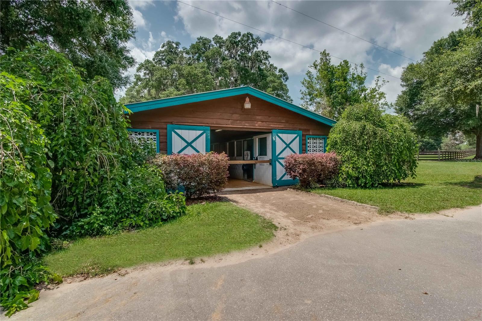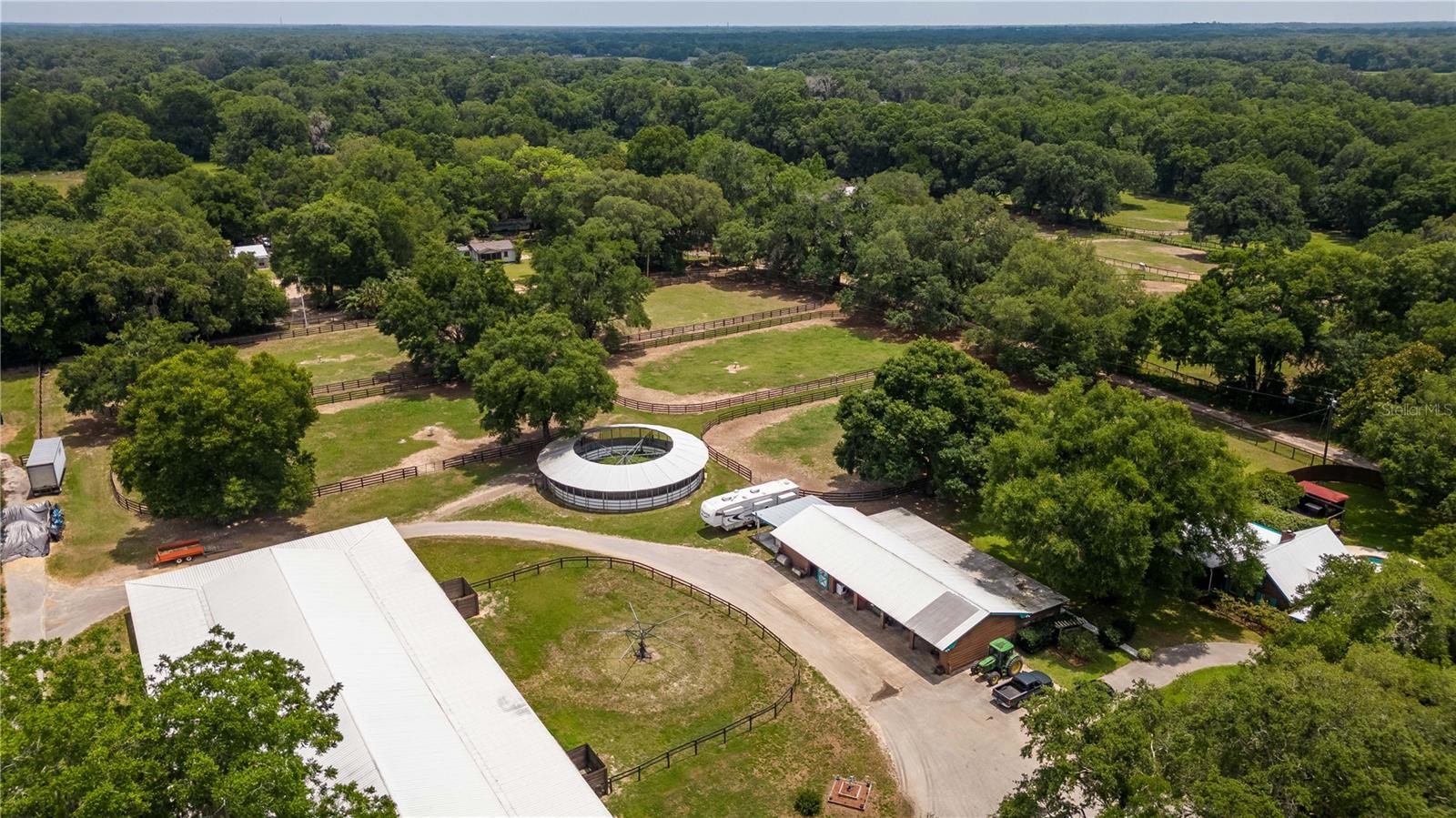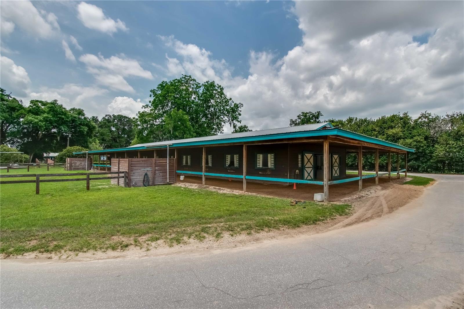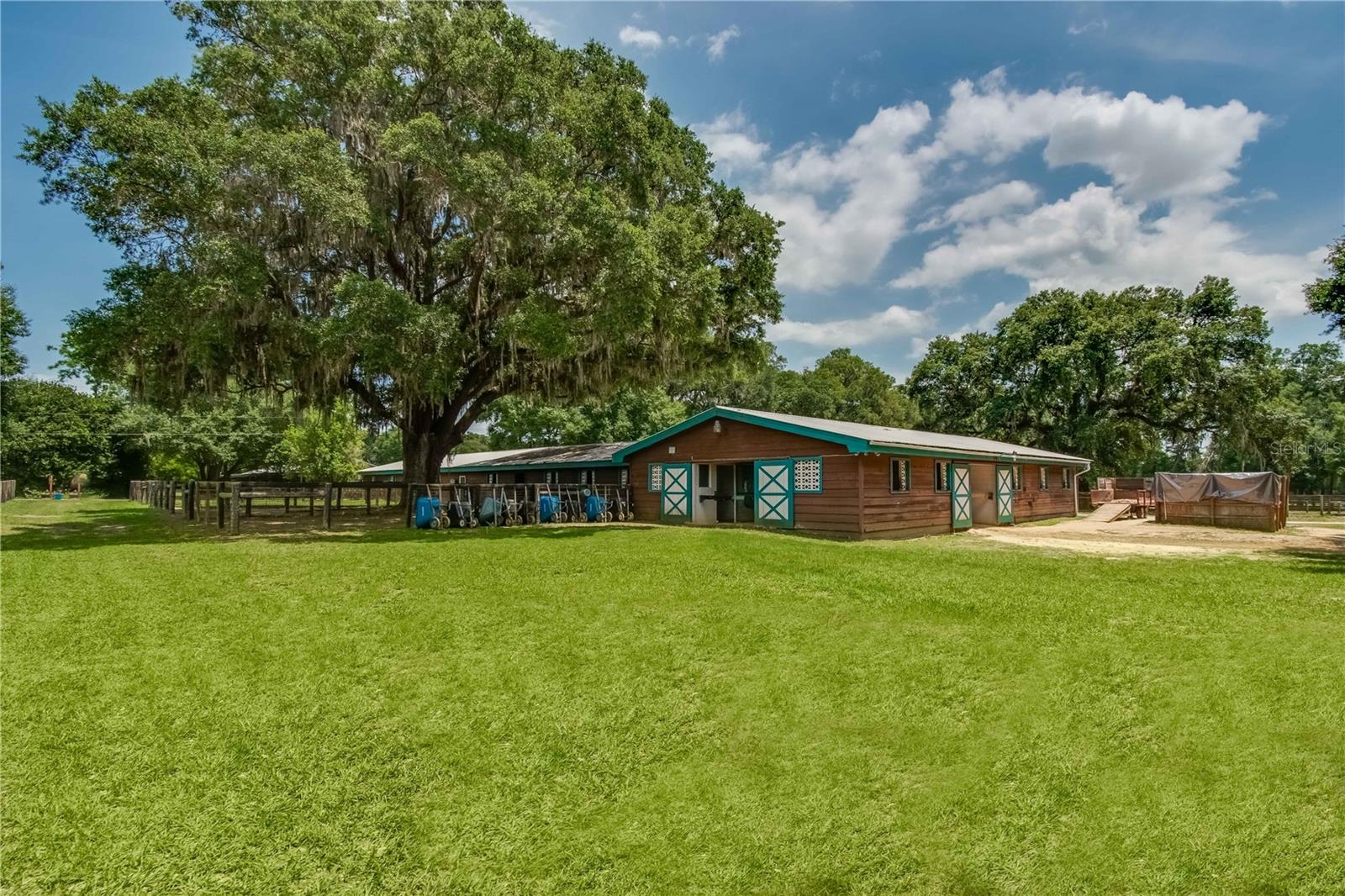 Great Investment opportunity! Well established and maintained 36+ acre thoroughbred training facility that can either continue as a thoroughbred operation or can easily be converted to a sport horse facility. The land is beautiful with mature oaks providing much sought after shade. The paddocks boast lush grass with excellent fencing. The home on the property is beautiful with a great outdoor pool area for relaxing. This is a turnkey opportunity with everything you need to operate. There are many ways to provide income from this property to an investor. Two barns are in place, a 28-stall center aisle barn with office and 8 adjacent surgery paddocks , and a 20-stall shedrow and center aisle barn. Additional features of the barn include feed and tack storage, bathroom, wash racks with hot water, fly spray system, and even a Vibe Plate stall with ramp and fan. On the western side of the property is an impressive 5/8 mile irrigated track that includes a 1/2 mile inner turf track for year-round training opportunities, equipped with a 6 horse starting gate, a track viewing stand, and a fully stocked pond at the center. A total of 30 paddocks have been carefully established throughout the property, including several new paddocks in the infield of the track itself. A 60’ European hotwalker with water system and crushed rubber footing is also on property, as well as a large workshop with an air conditioned break room and additional storeroom with washer and dryer, ice maker, and all tools. This farm has ample potential to be transformed for any horse discipline with a little vision. Providing the perfect place to keep an eye on the goings-on of the farm is the attractive 2-bedroom, 2-bath log cabin home. The spacious home features an open, split-bedroom floor plan with high cathedral ceilings, a rustic wood-finish, and a variety of extras. The kitchen is well-equipped with ample cabinet space, a gas stove, convection oven, breakfast bar, and much more. While both bedrooms are spacious, the master suite is particularly desirable with skylights, cathedral ceilings, and a private en-suite with garden tub. The loft space also provides the opportunity for a potential 3rd bedroom or use as a guest space. To the back of the home is a true oasis– fully fenced, the large backyard features stunning landscaping, a sparkling in-ground salt water pool and spa, a spacious pool deck, and an outdoor grilling station, and large trellis system that provides shade from flowering plants. A full-house generator provides the option to keep things running during a power outage and also powers the water to the barns. Wifi covers the entire farm, and there’s a full camera security system for added peace of mind– you can even watch horses train on the track! An RV hookup is also established on-property for additional accommodation options, and includes direct access to the septic. Just minutes from Majestic Oaks and the Ocala Jockey Club, which was recently acquired by the World Equestrian Center, this stunning training center provides the perfect foundation for a growing thoroughbred operation!
