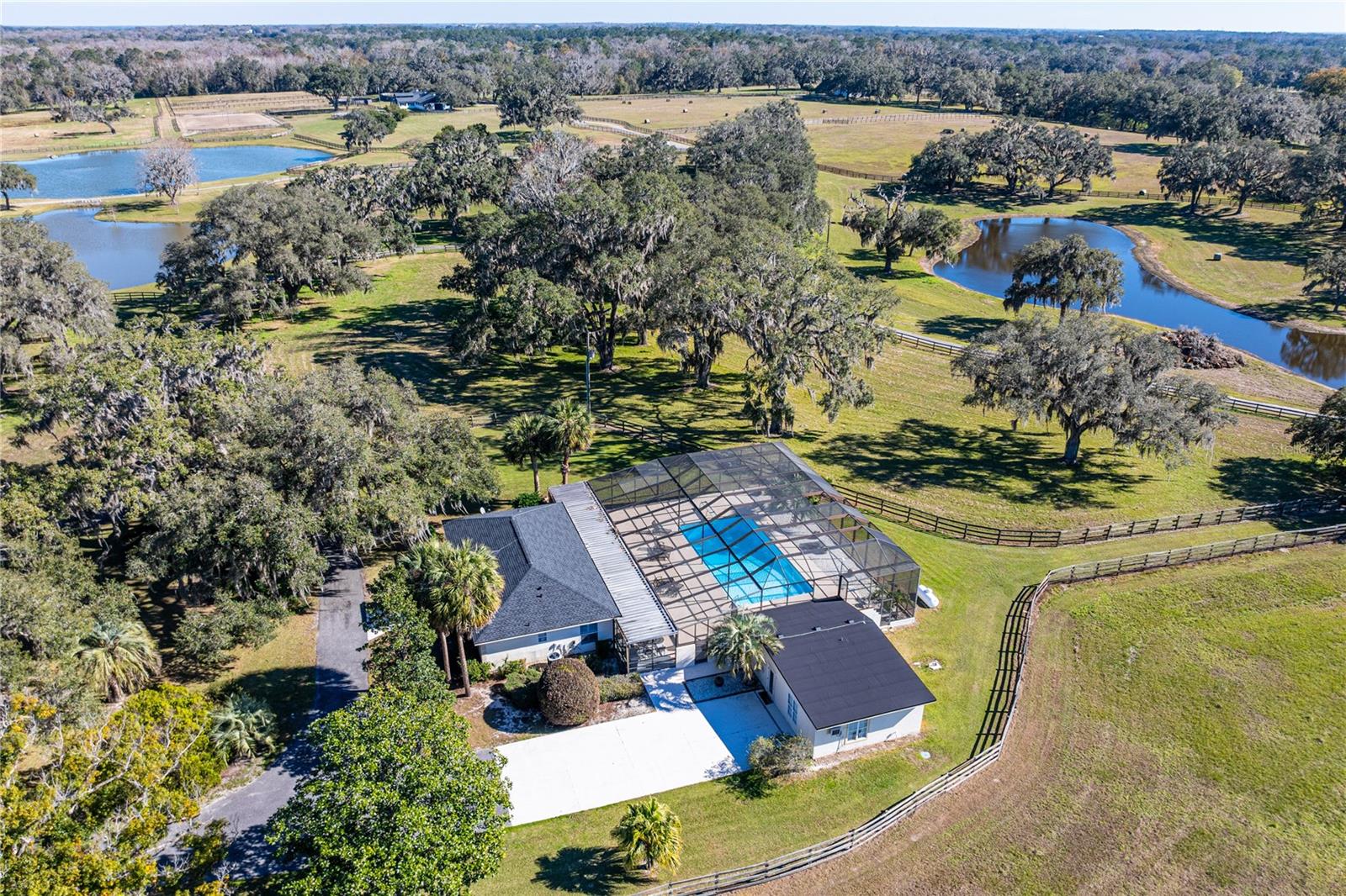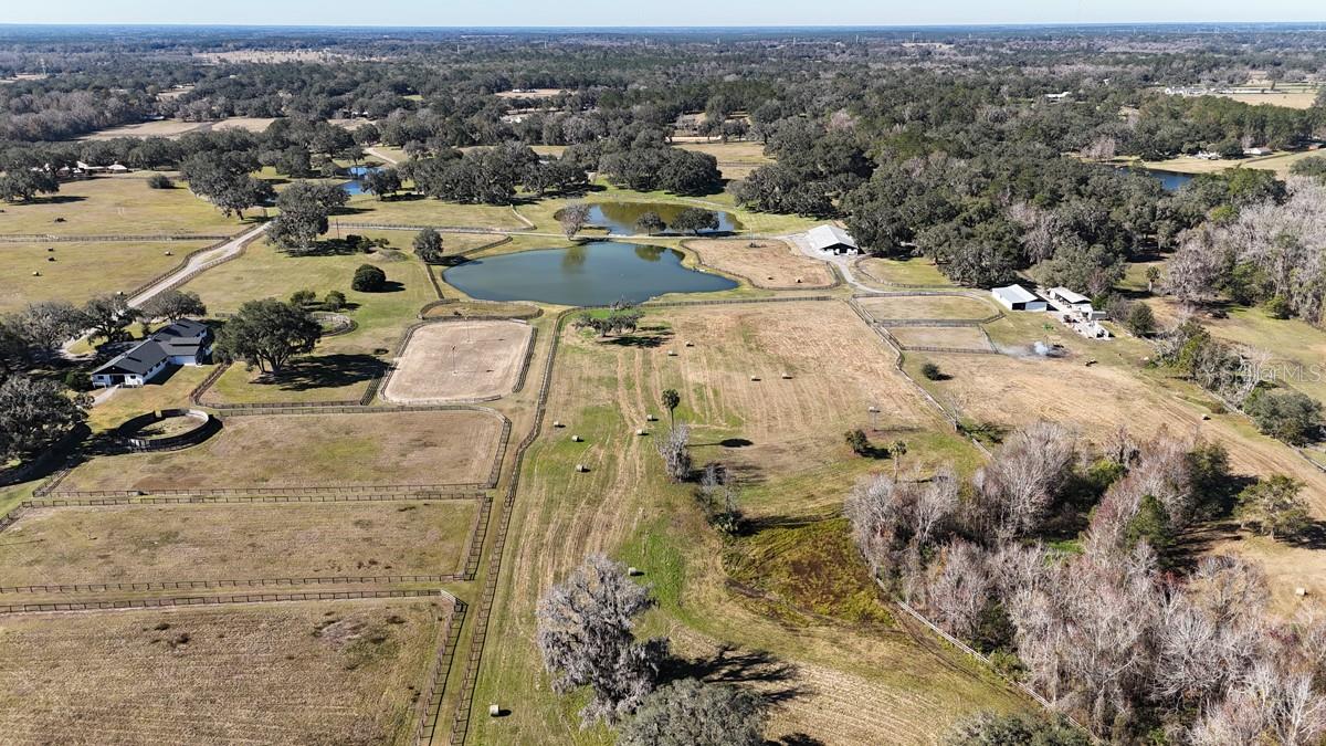 Welcome to a 125+/- acre breathtaking equestrian estate that captures tranquility, elegance, and privacy! This magnificent farm is truly a rare find nestled off the renowned 225A Golden Corridor and just 12 miles from the World Equestrian Center. Mature shade trees, lush green pastures, and gently rolling land, this property provides an idyllic setting for equestrian enthusiasts and those seeking a tranquil rural lifestyle. The extensive equestrian amenities include: Three Well-Appointed Barns: An impressive 18-stall show stable complete with two grooming stalls, an office, tack and feed rooms, a laundry room, an outdoor sitting area, and an upstairs 1-bedroom, 1-bath apartment. It is located adjacent to the grass jumping ring, the lit sand ring, the Eurosizer, round pens, and the turnout paddocks. A second barn featuring 23 stalls, a grooming stall, wash stalls, and a comfortable 3-bedroom apartment. A third barn features 6 stalls, an outdoor wash stall, and an efficiency apartment to accommodate your horses perfectly. You'll also enjoy a spacious main residence that boasts 3 bedrooms and 2 baths, designed with a screen-enclosed pool, plus a separate 1-bedroom, 1-bathroom guest apartment, making it ideal for family or visitors. As an added bonus, this property includes a generous 4-bedroom, 2-bath staff house, and 2 RV Hook-ups, ensuring you have everything needed for a seamless operation. Experience the serenity of nature with three picturesque lakes that enhance the charm of this exceptional property. This turnkey equestrian estate is a dream come true for horse lovers and those seeking a private sanctuary with top-tier amenities. Don't miss this unique opportunity to own a piece of paradise! Schedule your tour today and step into a life of luxury and tranquility!