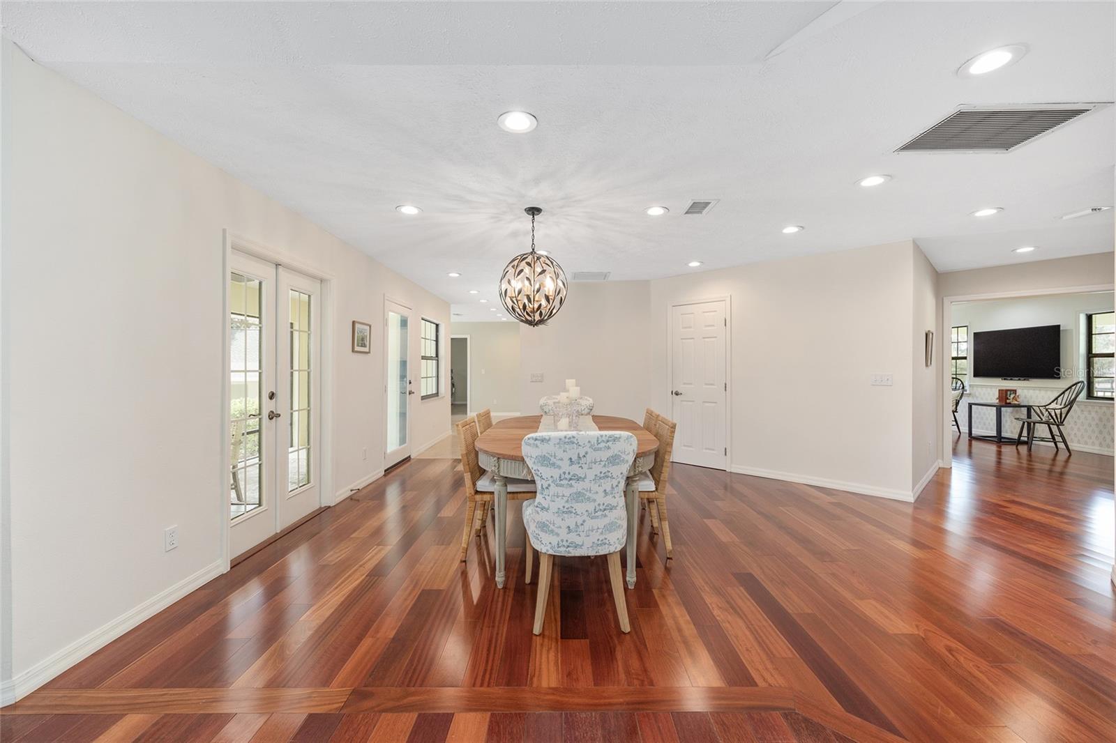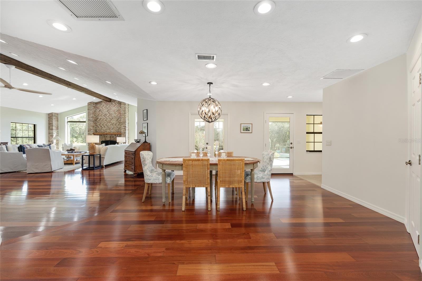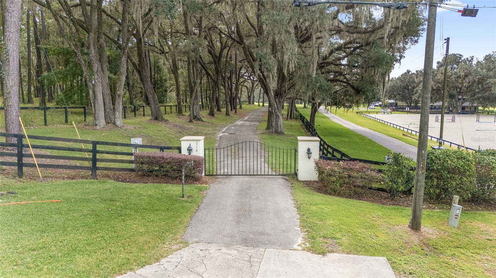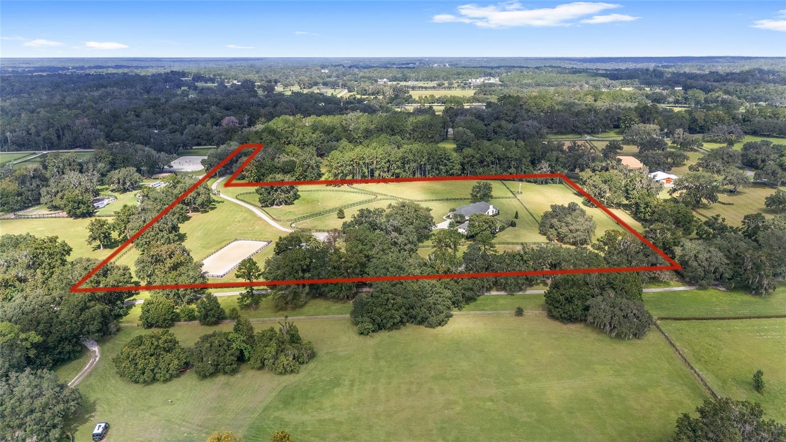 Set in the heart of northwest Ocala’s horse country, this meticulously maintained farm spans just under fourteen acres in the quiet and desirable Field of Dreams neighborhood. Ideally positioned only minutes from World Equestrian Center, HITS Ocala, and everyday conveniences, the property offers a rare blend of privacy and accessibility. A scenic, tree lined drive winds through gently rolling, manicured pastures, leading to the barn, arena, and residence. Mature landscaping surrounds the home, where a welcoming front patio and classic paver walkway create a warm first impression. Inside, the home is bright, inviting, and recently updated, featuring three bedrooms, two and a half baths, plus a den or office. Thoughtful upgrades include cherry and cork wood flooring, refreshed finishes throughout, and abundant natural light. The great room is designed for both everyday comfort and entertaining, highlighted by cathedral ceilings, expansive windows, and a dramatic floor to ceiling wood burning fireplace. The kitchen has been completely renovated with custom cabinetry, high end appliances including a GE Profile range with air fryer, Fisher and Paykel refrigerator and dishwasher, Viking microwave, a center island with breakfast bar, and a cozy breakfast nook with bay window views overlooking the pool. The split bedroom layout provides privacy for guests, with two generous guest rooms connected by a Jack and Jill bath with dual vanities. The primary suite offers a private retreat with its own screened lanai, two walk in closets, and a newly updated en suite bath featuring granite countertops and a walk in shower. French doors from the kitchen open to a screened patio that flows into the resort style pool area, surrounded by lush gardens, paver walkways, and built in seating ideal for relaxing or entertaining. Just off the pool, a detached guest area offers two private bedrooms, each with its own bath, along with a small exterior kitchenette, making it perfect for visiting friends or family. Equestrian amenities are equally well planned. The farm includes five three board fenced paddocks, each with water, and a concrete block center aisle barn with five matted stalls, twenty foot ceilings for excellent airflow, a fly spray system, wash rack, and tack room. The newly installed seventy by one hundred eighty foot irrigated arena with Fleet Footing is ready for year round training. A recently added one thousand gallon buried propane tank and whole house generator provide added peace of mind during storm season. For those seeking a move in ready horse property in one of Ocala’s most sought after locations, offering tranquility without sacrificing convenience, this exceptional farm truly delivers.