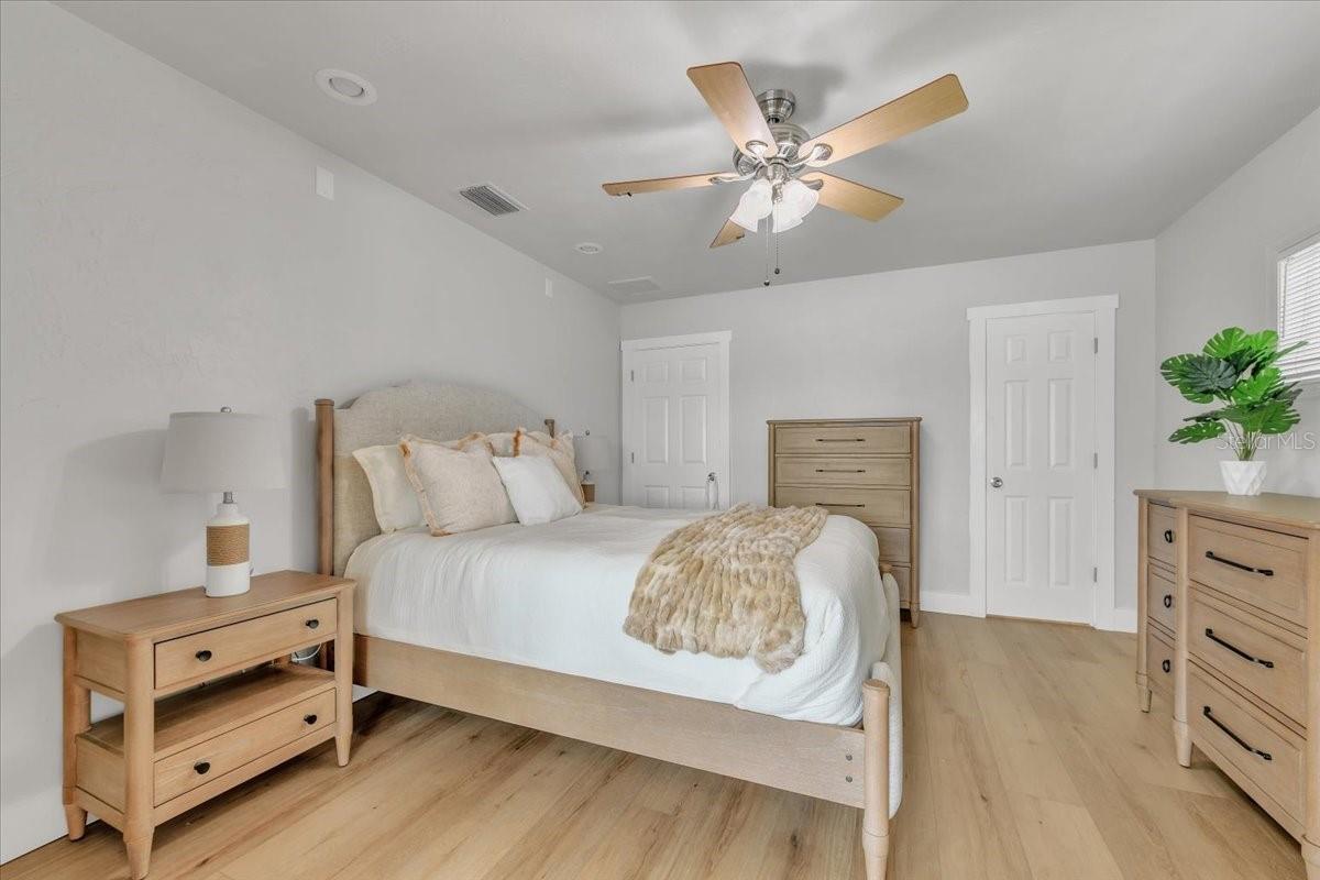 Welcome to your waterfront Spanish-Mediterranean style oasis. This split two-bedroom, three-bath home features Spanish tile flooring throughout (with LVP in the bedrooms), spacious living/dining/family rooms overlooking and opening to the pool and intercoastal views. The kitchen boasts natural light cabinets, granite countertops, stainless steel appliances, and an impressive custom pantry cabinet system. The primary bedroom suite features a walk-in closet and a spacious bathroom with a sizable walk-in shower with a sitting bench. A second bedroom suite offers a private full bath and large walk-in closet. Off the kitchen is a third full bath for guests. The HVAC unit has a UV light for cleaner air quality. The professionally landscaped lawn includes artificial turf that is virtually maintenance free. An in-ground, lighted pebble-tec pool, a double gang way composite dock with a 10,000-pound boat lift, water, and electricity, and kayak storage are all included. This home has spectacular water views from almost every room and just remodeled with all new furnishings. It is located just short 10-minute walk to the beach. Owner is a licensed Realtor in Florida.