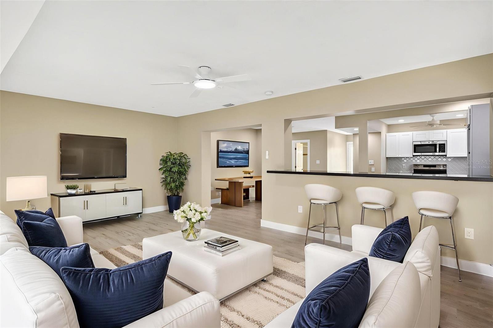 One or more photo(s) has been virtually staged. Lowest priced Move-in Ready 3 Bedroom 2 Bath Waterfront home on the Pinellas County Barrier Islands. This home was professionally remediated and remodeled. All city inspections are complete and permits are closed. This waterfront property with a deep water dock is nestled on a tranquil street in Redington Shores. A rare gem, this fully renovated residence offers an ideal location with direct boating access to the Intracoastal and Gulf of Mexico through John's Pass, or a swift golf cart ride to the beach, local shops, and restaurants. The open floor plan seamlessly connects the living and dining spaces, creating an inviting and spacious environment. The interior layout has been thoughtfully crafted by an interior designer, featuring luxury wood-look cottage tile, solid wood kitchen cabinets, and Silestone Quartz counters. A new spa-like primary bathroom adds a touch of modern elegance. The kitchen, with multiple eat-in spaces, overlooks the dining and living areas, facilitating easy entertaining. All three bedrooms are generously sized and strategically placed throughout the home. Step outside to an expansive patio boasting 50 feet of waterfront and plenty of room for the new owner to add a pool. The custom-designed, low-maintenance landscaping ensures more time to relish your new coastal lifestyle! Roof replaced October 2017 and new HVAC System August 2020.