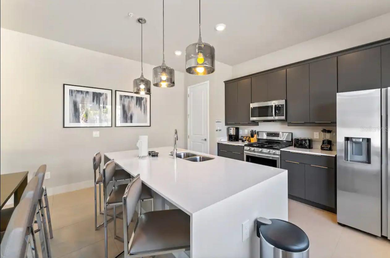 Experience luxury living at its finest in this stunning, modern condo at Spectrum at Reunion Resort! Perfectly appointed for immediate enjoyment, this fully furnished and equipped retreat is mere minutes from the magic of Walt Disney World. Ideal for primary residence, vacation home, or investment opportunity, this property offers the ultimate in convenience and flexibility, with on-site management and no rental restrictions. Showcasing 3 spacious bedrooms, 2.5 elegant baths, and an expansive open floor plan with sleek, modern finishes, this exceptional residence is a true showstopper. The gourmet kitchen boasts high-end stainless steel Samsung appliances, a gas range, and a beautiful island perfect for food preparation and presentation. Sliding doors lead to a spacious pavered patio, ideal for al fresco entertaining and mere steps from the resort-style pool. Residents of Reunion Resort enjoy a wealth of luxurious amenities, including a state-of-the-art gym, resort-style pools, an incredible water park with lazy river, three signature golf courses, pro-shops, community pools, tennis courts, conference facilities, and diverse dining options. This incredible opportunity includes a comprehensive package covering cable, internet, water, trash, and amenities, making it an unbeatable value in today's market. Don't miss out on living the Florida lifestyle in this exceptional home - schedule a showing today!