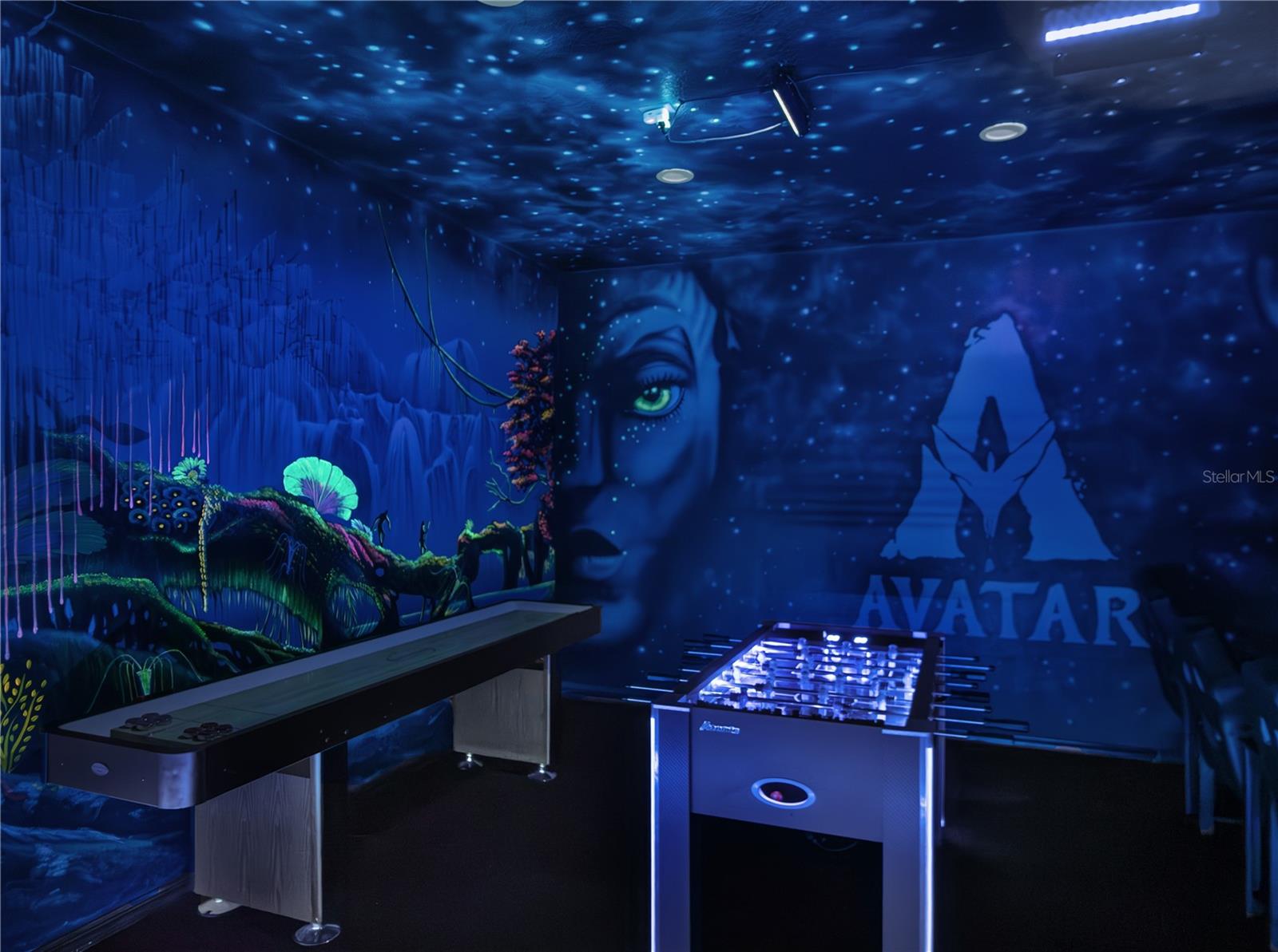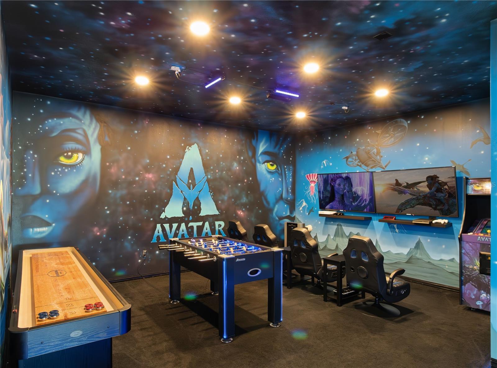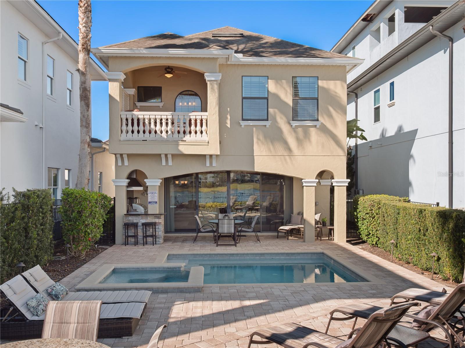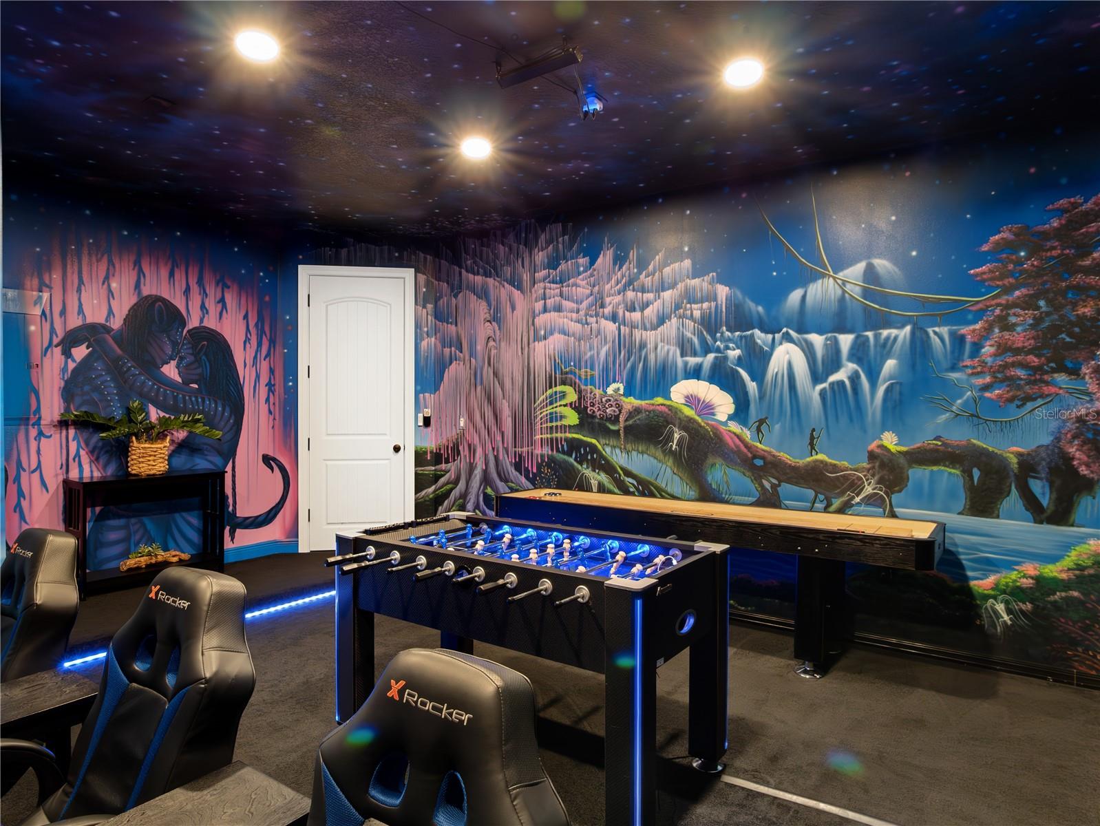 Nestled in the exclusive Reunion Golf Resort, this stunning and rare waterfront estate offers the perfect blend of privacy, beauty, and resort-style living. One of only a limited number of homes in the community with serene pond views, a truly special find behind the gates of this world-renowned luxury vacation destination. Thoughtfully upgraded throughout and offered fully furnished, it presents an outstanding opportunity as a second home or investment property. The spectacular residence will captivate you at every turn with its 3,900+ SF of exquisitely appointed indoor and outdoor spaces, offering 5 bedrooms and 4.5 bathrooms. Adding a fun, immersive touch, the home includes a show-stopping Avatar-themed game room, fully equipped with a 60-game arcade console, PS4, Xbox, foosball table, and a 9-foot shuffleboard table, plus blacklight lighting and glow-in-the-dark painting transform the room into a truly unforgettable experience. The first floor is graced by a grand foyer with soaring 20-foot ceilings, and flows into open-concept living and dining rooms and kitchen. The dining room table features generous seating for 8, with additional seating for 4 at the kitchen counter. The fully appointed kitchen features solid wood cabinetry, granite countertops, and stainless-steel appliances. A convenient first-floor primary suite offers a king bed and a spa-like bath with a walk-in shower. Upstairs, the second primary suite is a true retreat, featuring private balcony access with sweeping pond views and an elegant en-suite bath complete with double vanities, a garden tub, walk-in shower, and walk-in closet. The second floor is completed with 3 additional bedrooms, each with its own unique flair. The spacious front-facing bedroom, with its en-suite bathroom, offers direct access to the front balcony and can easily function as a third primary suite. The other two bedrooms are just as stunning, with one enhanced with a Harry Potter theme, equipped with an Xbox for added fun, and connected to the 5th bedroom via a Jack-and-Jill bathroom. The centrally located loft on the second floor offers a mini bar table, TV, and a beautiful billiard table. Outside, you can capture the best in Florida waterfront living in your pool and spa overlooking impeccable grounds, with water views beyond. Soak up the warm Florida sunshine in your own private oasis, with lounge chairs flanking the sparkling swimming pool and heated spillover spa. Indulge in poolside meals with a built-in outdoor kitchen and grill, plus a covered outdoor dining space. With an Active Gold membership as an owner and guest at Reunion Resort, you’ll enjoy an incredible lineup of amenities. Explore the 5-acre on-site Water Park with thrilling slides and a 1,000-ft lazy river. Enjoy 10+ community pools throughout the resort. Sports and recreation include the Tennis Center, pickleball, FootGolf, bocce ball, miniature golf, and the Seven Eagles Fitness Center. Reunion is a true golfers' paradise, featuring three signature championship courses designed by Arnold Palmer, Tom Watson, and Jack Nicklaus, plus a Short Game Practice Area. For those looking to take things further, Club Champion offers Tour-level, custom club fitting with 65,000+ head and shaft combinations. From standout dining to nightlife like 7593 Chophouse, Eleven rooftop, the Grande Lobby Sushi Bar, .... This is more than a home: it’s an experience and lifestyle in one of Central Florida’s most sought-after golf resort communities.