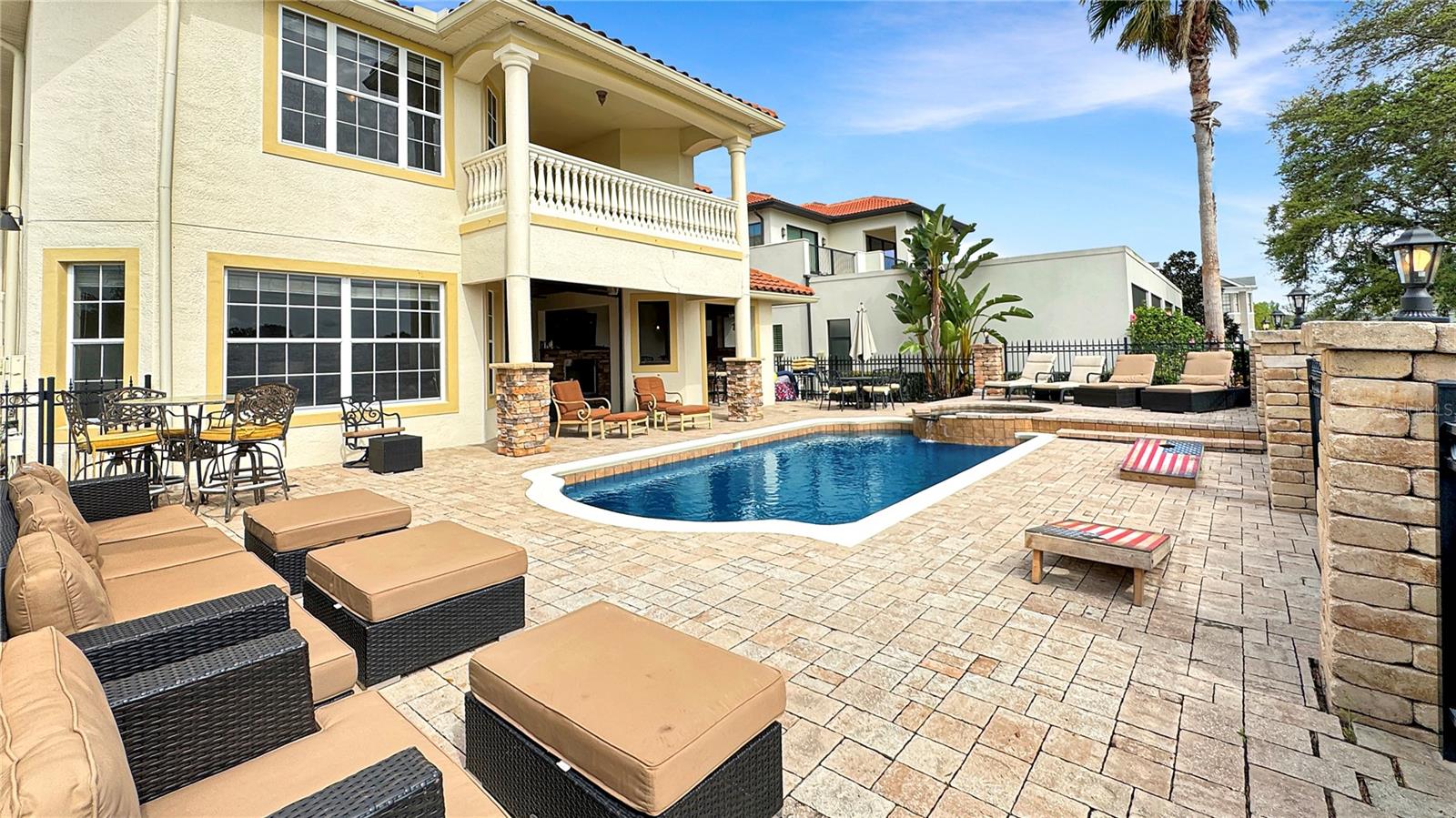 NEWLY RECONSTRUCTED BALCONY - ACTIVE GOLF MEMBERSHIP - This custom-built, two-story traditional home is a dream family-friendly retreat and a standout investment opportunity, perfectly positioned on an oversized east-facing lot with breathtaking views of the Tom Watson Signature Golf Course and stunning sunrises. From the moment you step inside, you'll be captivated by the bright, open living room with soaring cathedral ceilings, abundant natural light streaming through three levels of windows, and the striking grand staircase. Designed for fun and relaxation, the home features a vibrant game area complete with a red pool table, HDTV, and wet bar, setting the stage for unforgettable family nights or entertaining guests. The spacious kitchen boasts oak-style cabinets, a four-burner gas range, double built-in ovens, and a large island with bar seating—ideal for hosting and everyday convenience. The cozy family room, with its inviting fireplace and bright windows, offers picturesque views of the golf course and pool area. Step outside to a true Florida oasis. The covered patio, adorned with brick pavers and wood plank ceilings, features a custom-designed summer kitchen with a built-in grill, outdoor fireplace, and drop-down screens. The outdoor space is complete with a luxurious elevated spa with a waterfall feature, multiple seating areas, and a spacious lounging zone that allows you to fully embrace Florida's sunny lifestyle. Never before used as a rental, this home offers immense potential as a fresh, high-value vacation rental or private family getaway. The five generously sized bedrooms and four full baths comfortably accommodate large groups. The main-floor master suite features an en-suite with a Jacuzzi soaking tub, while upstairs, a bonus room, additional bedrooms, and a walk-out balcony provide ample space and stunning views. Recent updates, including a new roof in 2018, updated air conditioners, and a new pool heater, ensure the home is move-in ready. Offered fully furnished, this property presents an exceptional investment opportunity with its perfect combination of luxury, location, and turnkey readiness.