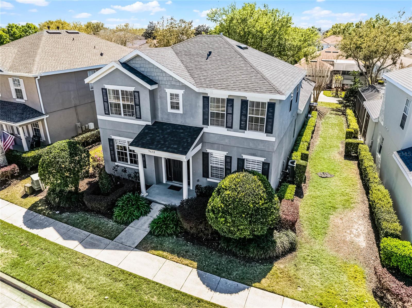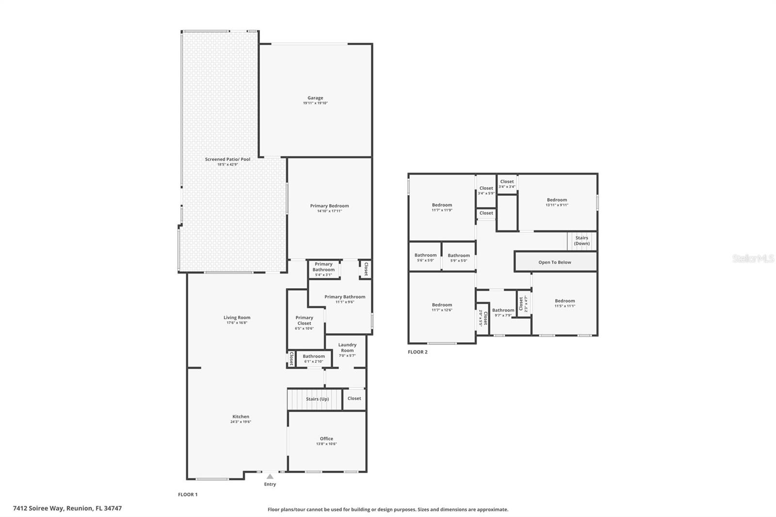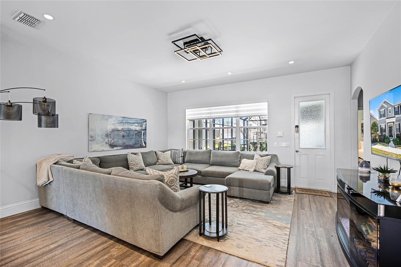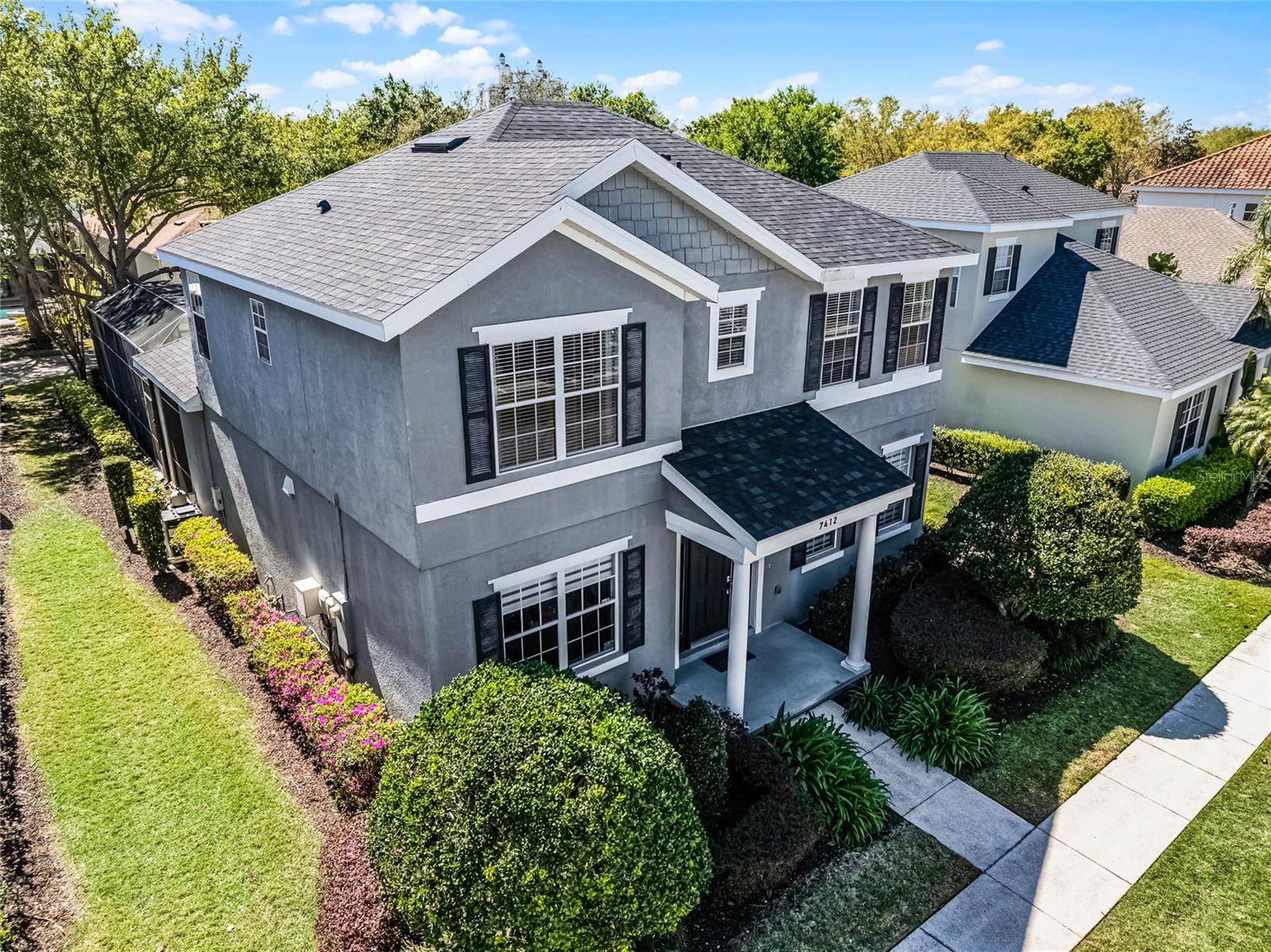 This exceptional, fully furnished, contemporary 5-bedroom, 3.5-bathroom single-family home, located within the desirable, guard-gated Reunion Resort golf community, offers the perfect blend of luxury and leisure. Step into a modernized space boasting pride of ownership, where double French doors lead to a versatile den, ideal as an office or entertainment area. Adjacent, a breathtaking open-concept dining and kitchen area features state-of-the-art 2022 Thermador appliances, including a refrigerator, range, and dishwasher, overlooking the spacious living room. The oversized primary suite, conveniently located on the first floor, includes an ensuite bathroom with double vanity, a large walk-in shower, and a walk-in closet. Four additional bedrooms with two bathrooms are located on the second floor. Enjoy preferred privacy in the courtyard-style lanai, screened-in pool, and spa with included heating. Recent upgrades include a complete pool equipment replacement in 2022, a 2018 AC central unit, a brand new roof and water heater in 2024, and a freshly repaired driveway in 2025. Further enhancements include a complete R1's floor renovation in 2020, and a Pac-Man arcade game. This property grants full membership access to Reunion Resort's renowned amenities, including a water park with a lazy river, three championship golf courses, a tennis complex, multiple community pools, and fitness centers. Enjoy walking distance to the Seven Eagles clubhouse with its resort pool, gym, and dining, as well as the Reunion Grande Hotel for rooftop dining and Disney fireworks views. A dedicated office/6th bedroom, gourmet Thermador kitchen, designer finishes throughout, and resort amenities like a kids club, make this 2,442 sq ft home an exceptional vacation retreat, short-term rental, or permanent residence, located close to Orlando theme parks, restaurants, and shopping.