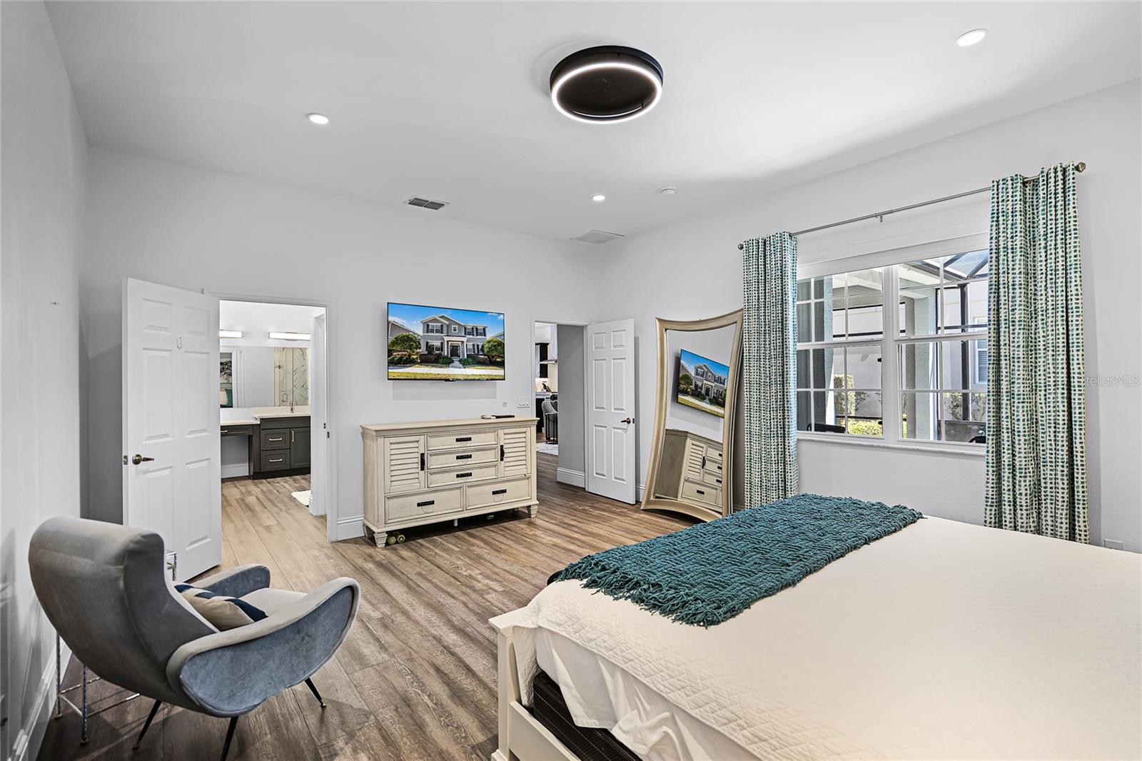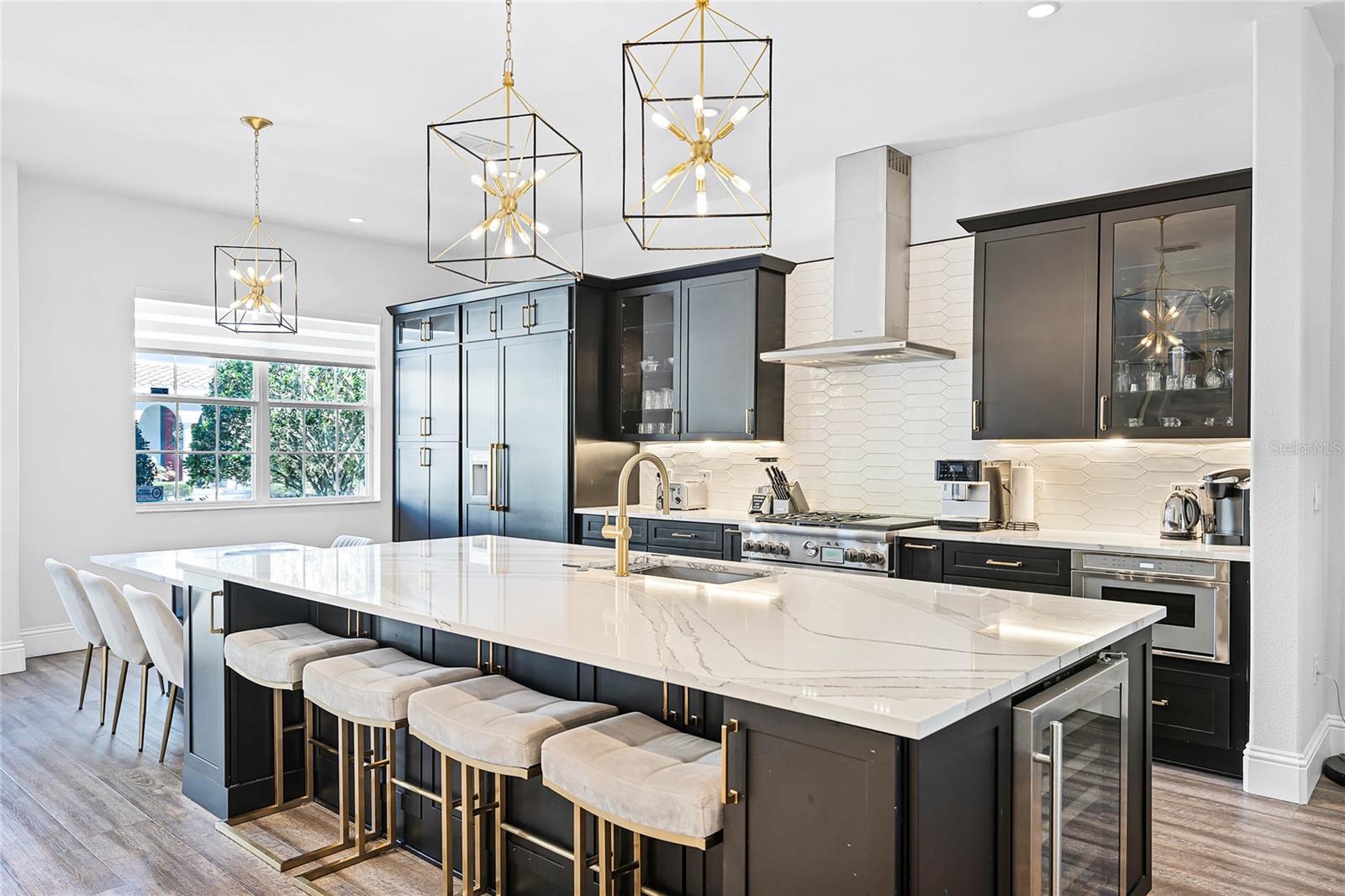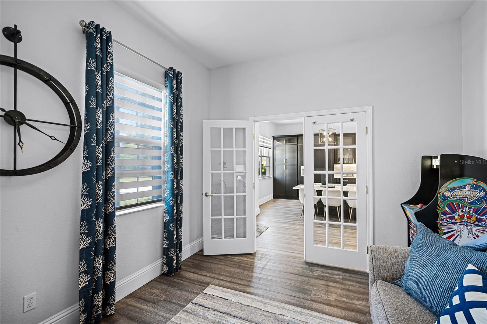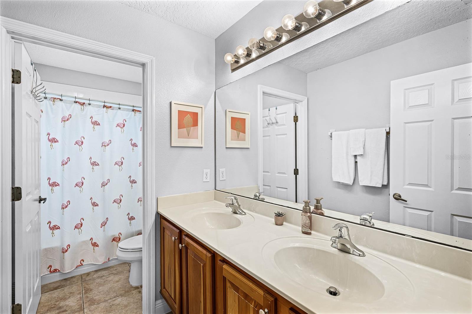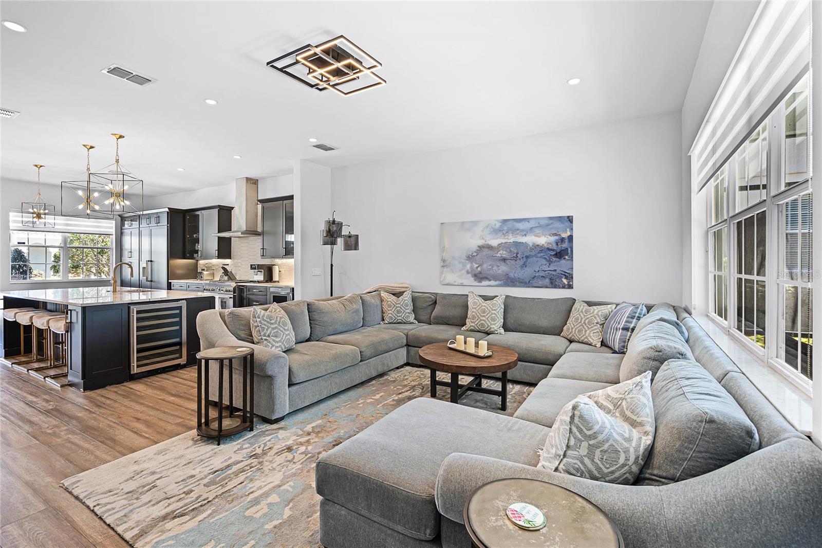 This exceptional, fully furnished, contemporary 5-bedroom, 3.5-bathroom single-family home, located within the desirable, guard-gated Reunion Resort golf community, offers the perfect blend of luxury and leisure. Step into a modernized space boasting pride of ownership, where double French doors lead to a versatile den, ideal as an office or entertainment area. Adjacent, a breathtaking open-concept dining and kitchen area features state-of-the-art 2022 Thermador appliances, including a refrigerator, range, and dishwasher, overlooking the spacious living room. The oversized primary suite, conveniently located on the first floor, includes an ensuite bathroom with double vanity, a large walk-in shower, and a walk-in closet. Four additional bedrooms with two bathrooms are located on the second floor. Enjoy preferred privacy in the courtyard-style lanai, screened-in pool, and spa with included heating. Recent upgrades include a complete pool equipment replacement in 2022, a 2018 AC central unit, a brand new roof and water heater in 2024, and a freshly repaired driveway in 2025. Further enhancements include a complete R1's floor renovation in 2020, and a Pac-Man arcade game. This property grants full membership access to Reunion Resort's renowned amenities, including a water park with a lazy river, three championship golf courses, a tennis complex, multiple community pools, and fitness centers. Enjoy walking distance to the Seven Eagles clubhouse with its resort pool, gym, and dining, as well as the Reunion Grande Hotel for rooftop dining and Disney fireworks views. A dedicated office/6th bedroom, gourmet Thermador kitchen, designer finishes throughout, and resort amenities like a kids club, make this 2,442 sq ft home an exceptional vacation retreat, short-term rental, or permanent residence, located close to Orlando theme parks, restaurants, and shopping.