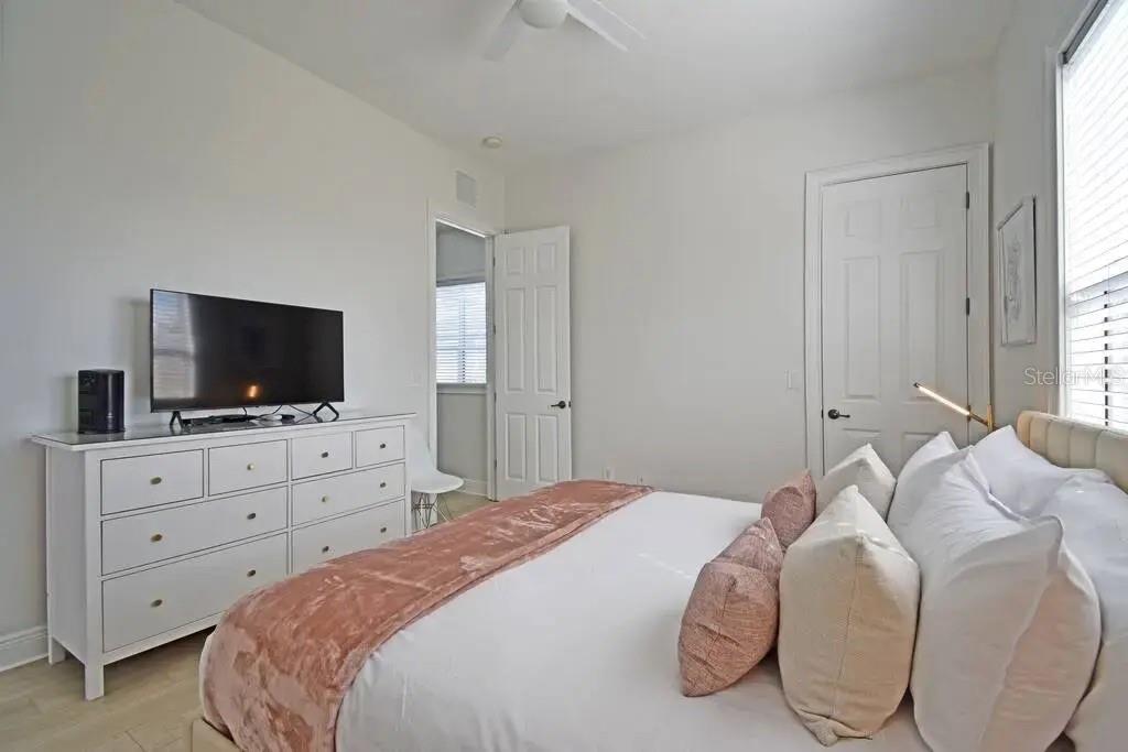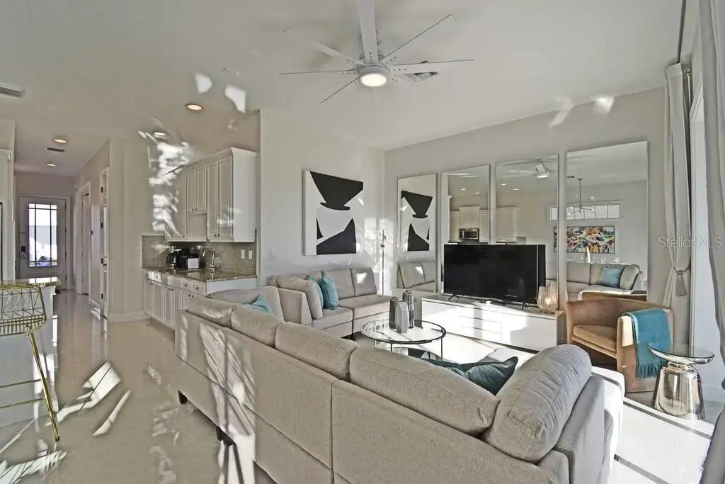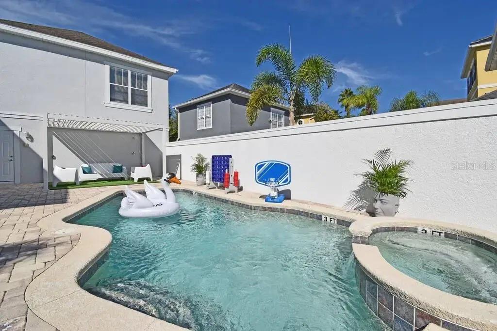 Investors do not miss out on this High-income producing Property that has generated over $110,000 just from Airbnb alone in 2024 not including other booking sites. The seller has done this without the need of the resort membership saving the additional carrying cost to the new owner. This home is situated on one of the largest lots in the area for these style homes and overlooks the Arnold Palmer Signature Golf course. The rear covered patio area features an outdoor dining area with extended pavers featuring a Modern fire pit and comfy chairs. Another great benefit is the oversized courtyard pool area with a spillover spa, ample seating, a covered arbor with nice seating, an outdoor chess set, and other poolside games. There is a completely emersed Star Wars games room featuring a 135-inch HD projection screen, surround sound system, pool table and exciting console games to play. Once inside the home you will experience a modern and bright Miami chic style features including elegant 4ft porcelain white tiles throughout, white cabinets and furniture. There is a king suite on the main floor with private bathroom, upstairs you will find marvel themed bedroom with 4 twin beds and full en-suite. The master bedroom upstairs is from a magazine cover feature wall to wall walkout balcony with double French doors, a separate seating area and tray ceilings. Falling in love will be easy but the only difficult part will be viewing the home in person as it is constantly booked with repeat guest staying in the home. Reunion resort is 2300 acres of lush green space, only 10 minutes from Walt Disney World, plenty of restaurants, shopping and Orlando airport 25 min away. The resort is zoned for short term rental and has plenty to do to keep the family entertained which includes 6 resort swimming pool and spas, fitness room, parks, playground and even a dog park.