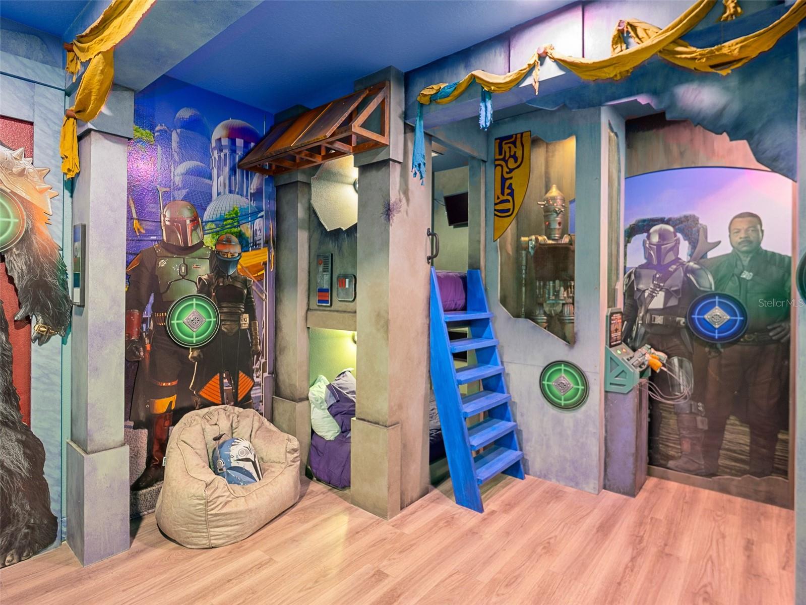 Exemplary Executive Golf Course Home with AMAZING PANORAMIC VIEWS is available for purchase in the exclusive gated, active lifestyle golf community of Reunion Resort! This FULLY FURNISHED 9-bedroom, 12.5-bath purpose-built home, comes professionally themed and decorated to an elite standard and offers an immersive luxury experience. Positioned on a superior southwest-facing lot overlooking the 10th and 11th holes of the Nicklaus Golf Course, it delivers captivating sunsets, year-round sun, and unforgettable vistas. The outdoor living space is everyone’s dream, featuring a covered lanai, oversized pool with sun shelf and hot tub, firepit, cabana-style daybed and generous lounging areas. Inside, you'll find a well thought out main floor open-concept living space with a top-of-the-line chef’s kitchen, a sleek dining and gathering area framed by sliders that flow seamlessly to the pool deck. Also on the first level are four deluxe bedroom suites with full baths and special touches such as black out blinds, ceiling fans and 5 star bedding. Upstairs, indulge in the custom-designed themed sports bar complete with a pool table crafted from a 1967 Camaro, adjacent lounge with gaming stations, and balcony views that are nothing short of spectacular. The curated fun continues in a dedicated arcade room and two mind-blowing themed galactic bunk rooms, one featuring a laser shooting game and animatronic Star Wars characters including Grogu and IG-11, and the other showcasing Hans Solo's carbonite scene and a karaoke stage with realistic detail that must be seen to be believed. Each bunk room has two full bathrooms, and individual beds with personal TV’s, lights and USB ports for today’s connected world. Three additional en-suite bedrooms round out the second floor including an oversized front en-suite with its own covered balcony, and two primary master suites with private sitting areas and sliding doors opening to sweeping golf course views. Strategically designed to comfortably accommodate up to 24 family members and guests it is equipped with two refrigerators, two ranges, two dishwashers, two microwaves, plus two laundry rooms, a downstairs wet bar, an upstairs dry bar, an LED-lit electric fireplace, and even a pool bath with outdoor access....TRANSFERABLE MEMBERSHIP AVAILABLE....Reunion Resort and Club stands out as a one of a kind, active lifestyle community with dynamic amenities, and features 3 signature golf courses, a tennis center, WATERPARK, 12 communal pools, playgrounds, putt putt golf, pickle ball courts, dog-park, fitness center, arcade and numerous on site dinning choices. It is within close proximity to Central Florida's major roadways, attractions, dining, shopping and world class beaches...This TURNKEY home has been designed for both luxury living and high-performance rental potential and contains unmatched upgrades throughout and is ideal for those seeking a personal retreat, or perfect for investors or 1031 exchanges. Schedule your private showing today - this is the Reunion home you've been waiting for! For additional perspective check out the cinematic video -https://youtu.be/JzP6z0sEnI8
