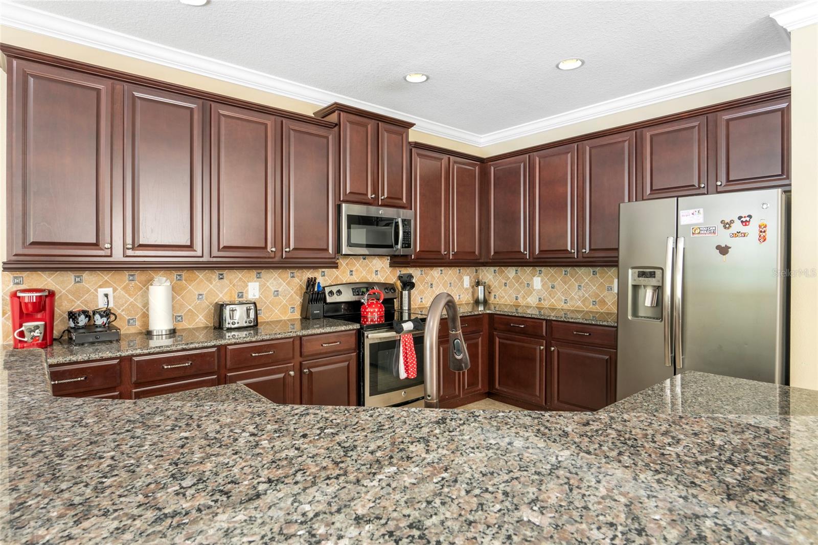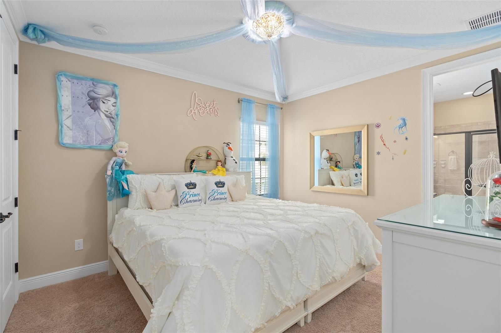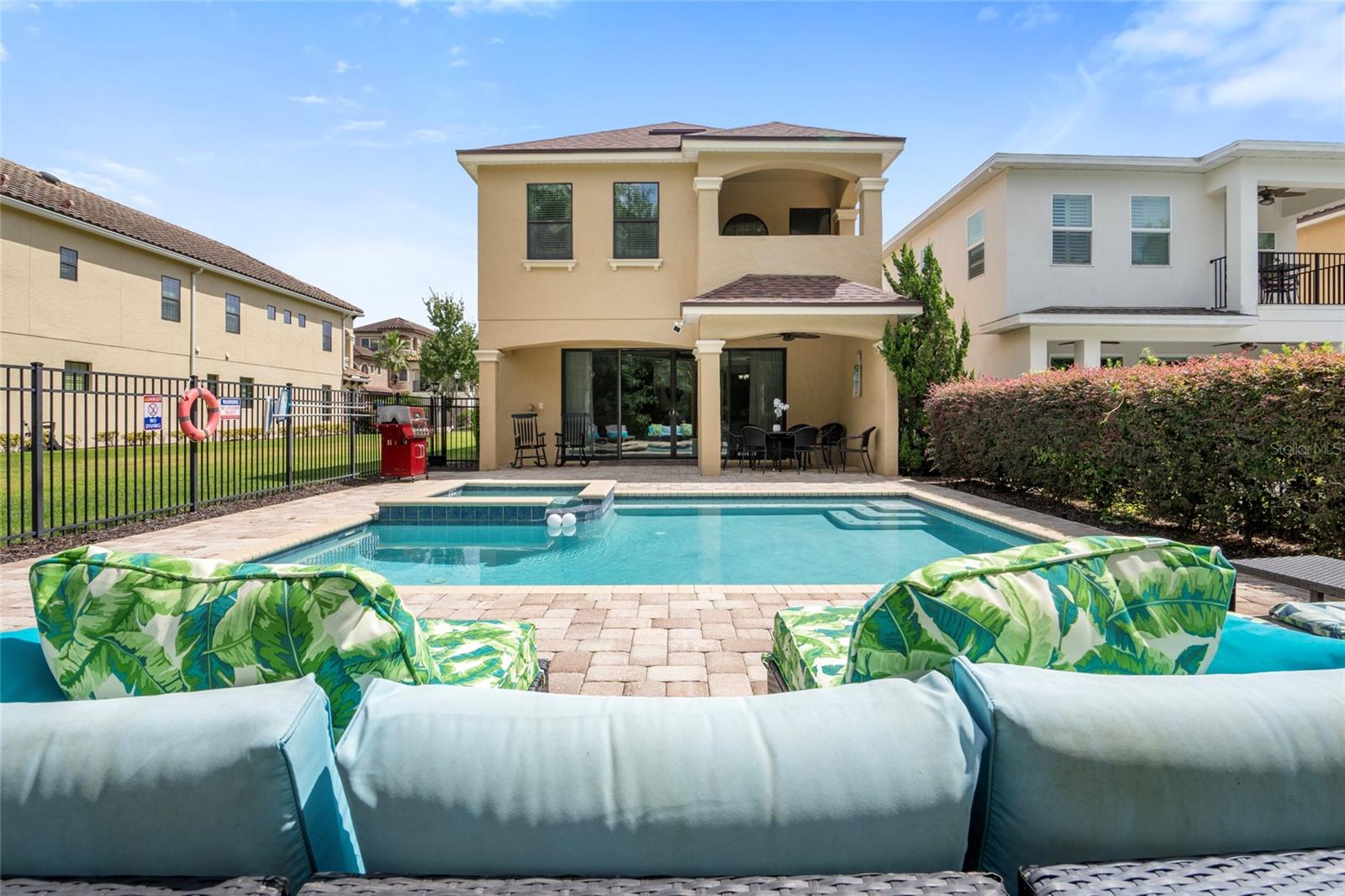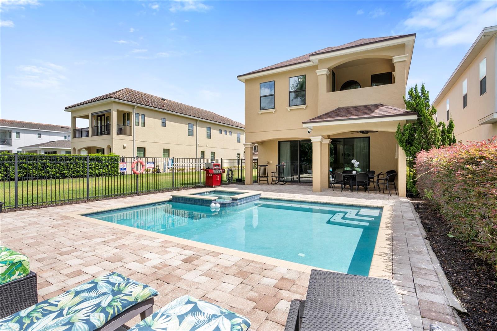 Welcome to an extraordinary investment opportunity in the heart of Central Florida’s premier vacation destination—Reunion Resort. This fully furnished 5-bedroom, 5.5-bath luxury home is a turn-key income-producing powerhouse already booked well into 2026, offering immediate returns for the savvy investor. Each bedroom features its own en-suite bath, and the spacious primary suite on the first level boasts dual sinks, a soaking tub, and a separate shower for true resort-style living. Designed for maximum guest appeal, this home features soaring 10-foot ceilings, a dramatic vaulted entry, and an open-concept layout that flows seamlessly from the living space to the kitchen, where granite countertops, stainless steel appliances, 42-inch cabinets, and a large island with a high bar area create a central hub for entertaining. The open space offers lots of windows and a four-panel sliding glass door that floods the home with natural light and opens up to a private pool oasis overlooking a peaceful wooded preserve—ideal for relaxing after a day at the parks. The backyard retreat showcases a heated pool with an attached hot tub spa, surrounded by ample lounge seating for sunbathing, along with a covered patio featuring an outdoor dining table and chairs, and a built-in grill—perfect for entertaining, relaxing, or enjoying Florida’s sunshine year-round. Recent upgrades include a new roof in 2020, a new pool pump and heater in 2023, an AC pipe cleaning system installed in 2024, and a brand-new washer and dryer in 2025, ensuring the property is not only beautiful but also meticulously maintained. The home comes fully furnished and includes a Ring doorbell and exterior security cameras for added peace of mind. With a two-car garage and additional driveway parking, this home is ready to host multiple guests or extended family comfortably. A key highlight of this property is the collection of professionally designed themed bedrooms that elevate the guest experience and enhance rental appeal. Guests can set sail in the vibrant Captain Mickey suite, drift into tranquility in the breezy nautical-inspired room, unwind in the lush jungle retreat, feel like royalty in the elegant princess escape, or dream of adventures in the globally inspired travel-themed room with double beds—each one crafted to delight guests of all ages. Centrally located on the second floor is a dedicated theatre and game area featuring nine plush theatre chairs, blackout curtains, and ample space for relaxation or movie nights, making it a true entertainment hub. Reunion Resort delivers a five-star experience with championship golf courses, on-site dining, multiple resort-style pools, a water park with a lazy river, miniature golf, tennis courts, a fitness center, and miles of walking trails. Just minutes from Disney and with quick access to I-4, 429, and 192, this home checks every box for an investor seeking consistent rental income in a high-demand location. Whether you're looking to expand your short-term rental portfolio or secure a magical family retreat with exceptional earning potential, this is the opportunity you've been waiting for!