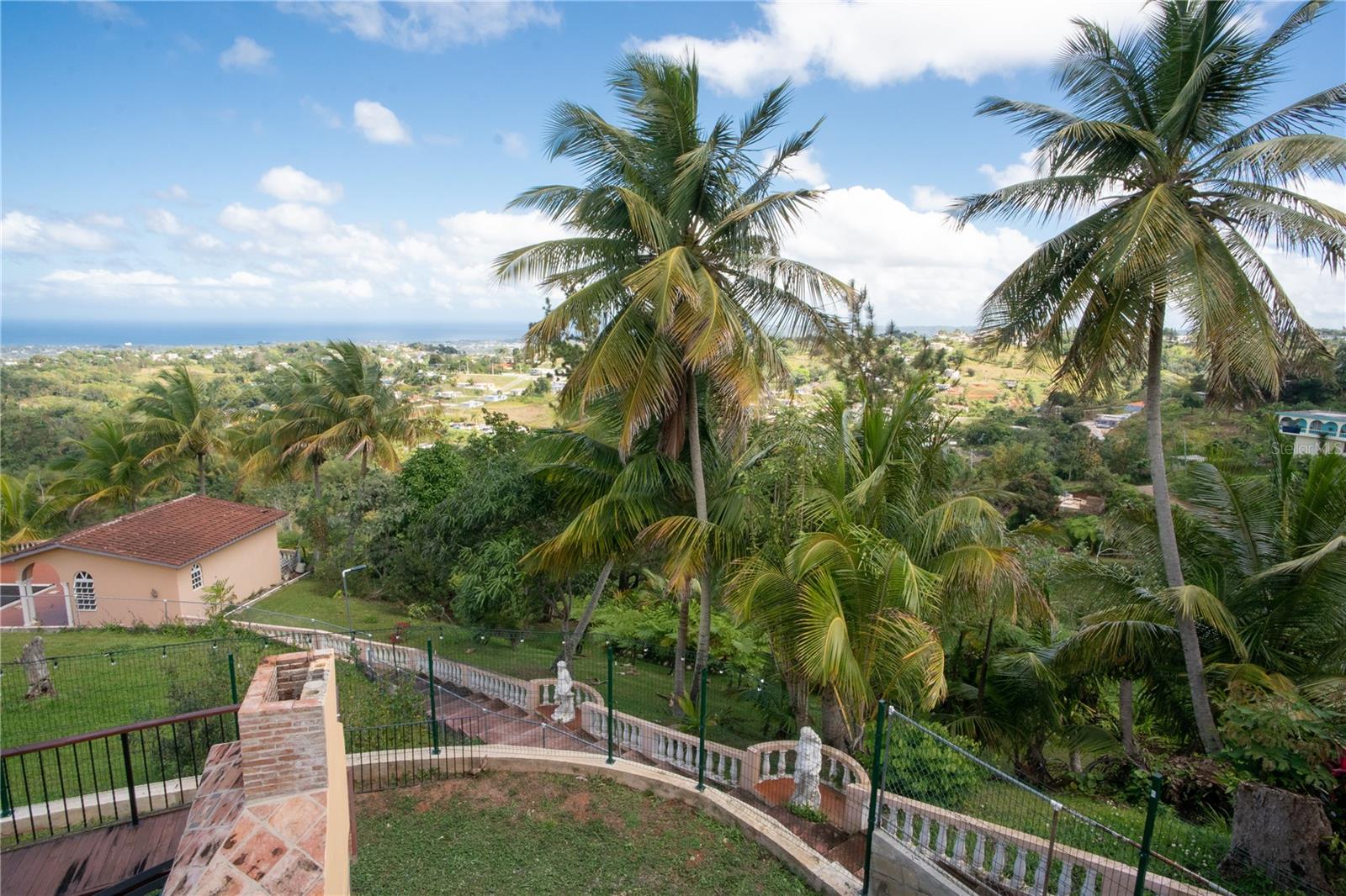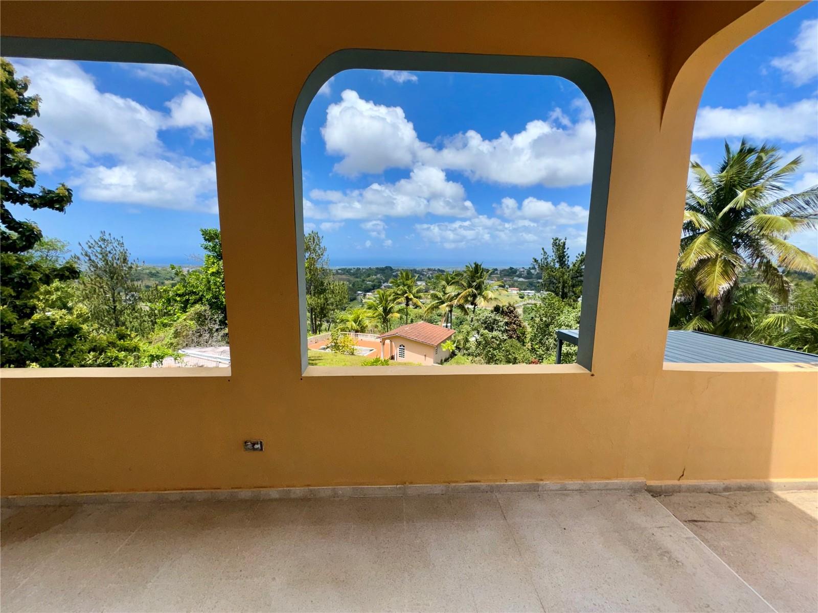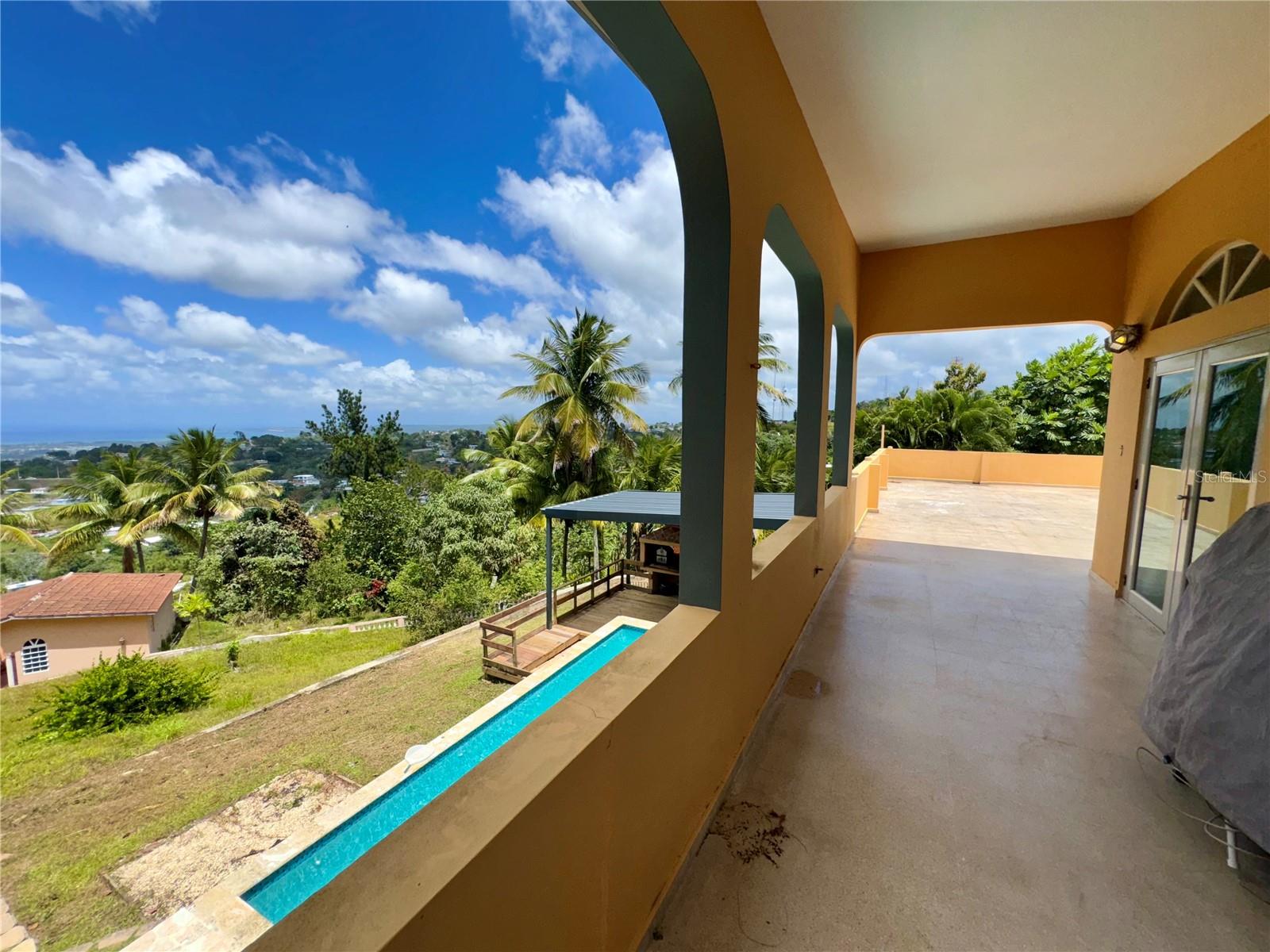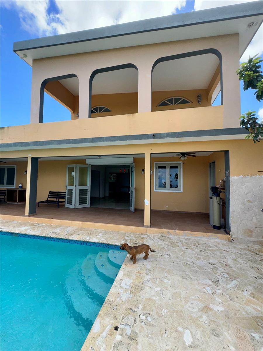 Secluded Villa in the mountains located at the borderline of Rincon and Aguada in Atalaya ward. Ocean views from many areas of the property. Property consists of: First level has 3 bedrooms, 2 full bathrooms, open kitchen-living room-dining room, huge foyer with majestic staircase and high ceiling that leads to second level, 2 car garage, laundry, pool, terrace, outdoor shower. Second level has 2 bedrooms, 1 bathroom, spacious open living room that access to big balcony and a huge open terrace. Property is aprox 1.8 acres with variety of trees including palm trees, plenty of lovely sitting areas. There is a separate studio with an additional pool. Additional building formerly used as a work shop. House is currently without furniture.