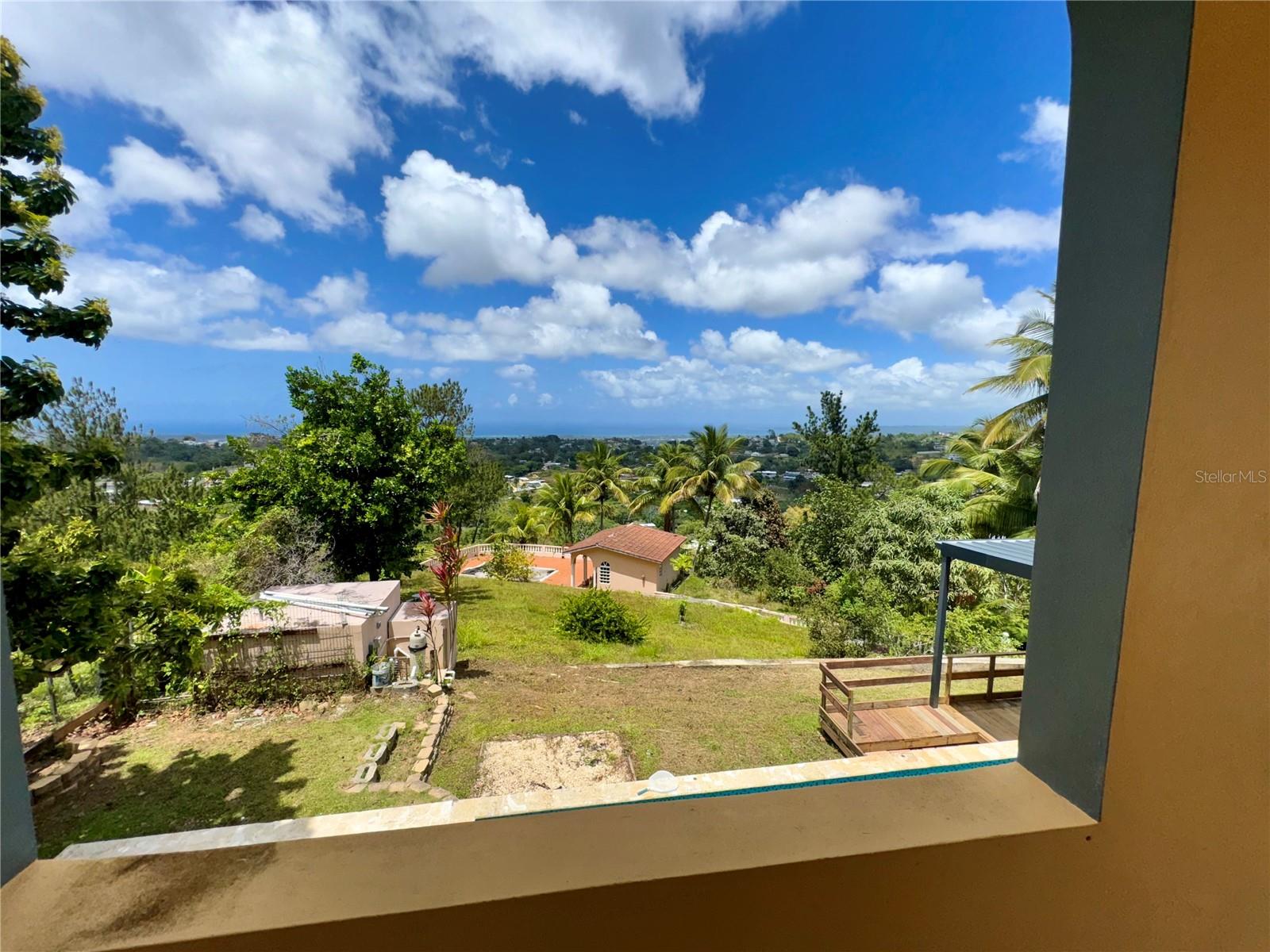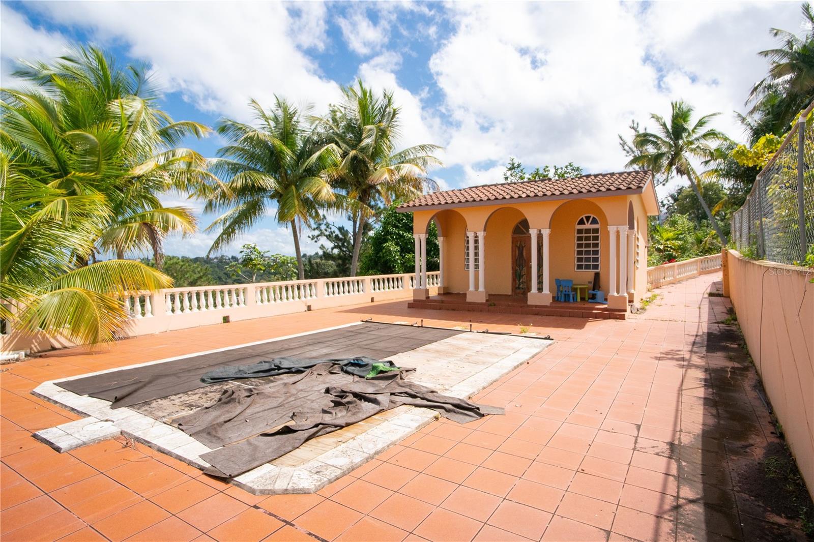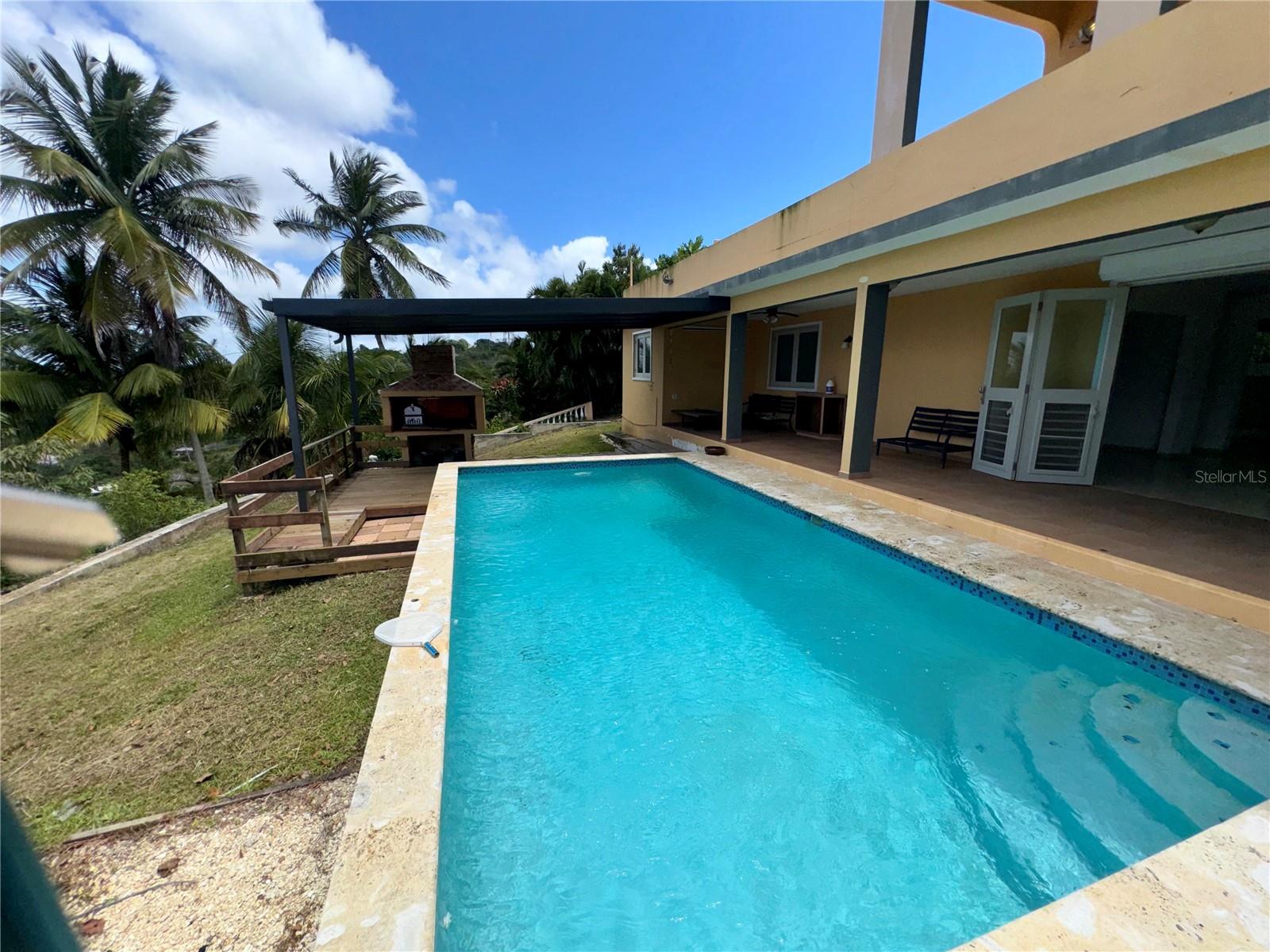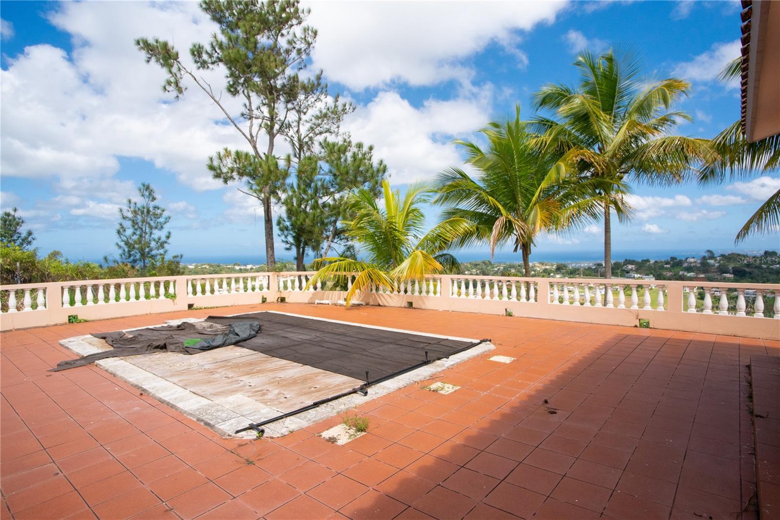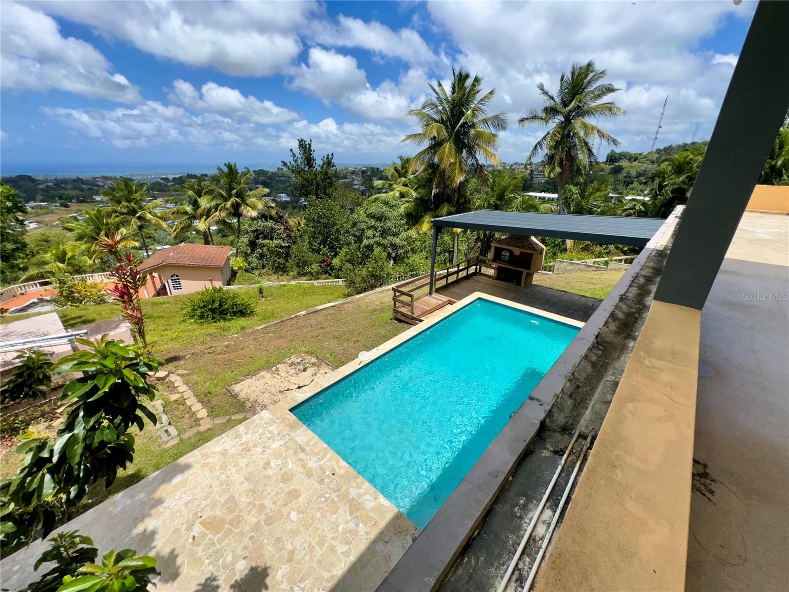 Secluded Villa in the mountains located at the borderline of Rincon and Aguada in Atalaya ward. Ocean views from many areas of the property. Property consists of: First level has 3 bedrooms, 2 full bathrooms, open kitchen-living room-dining room, huge foyer with majestic staircase and high ceiling that leads to second level, 2 car garage, laundry, pool, terrace, outdoor shower. Second level has 2 bedrooms, 1 bathroom, spacious open living room that access to big balcony and a huge open terrace. Property is aprox 1.8 acres with variety of trees including palm trees, plenty of lovely sitting areas. There is a separate studio with an additional pool. Additional building formerly used as a work shop. House is currently without furniture.