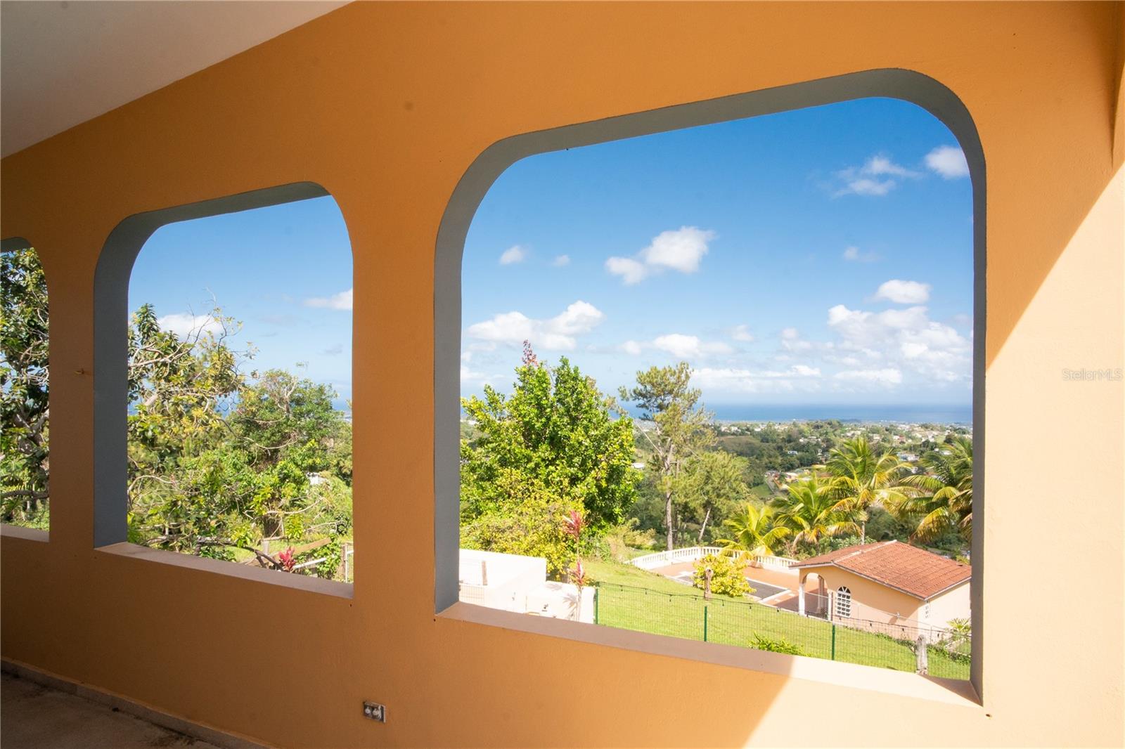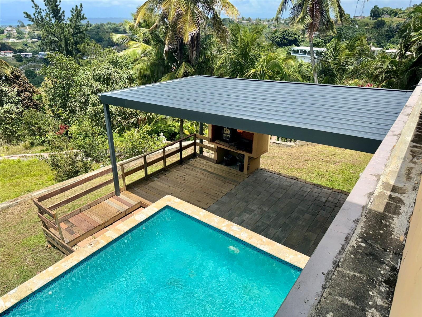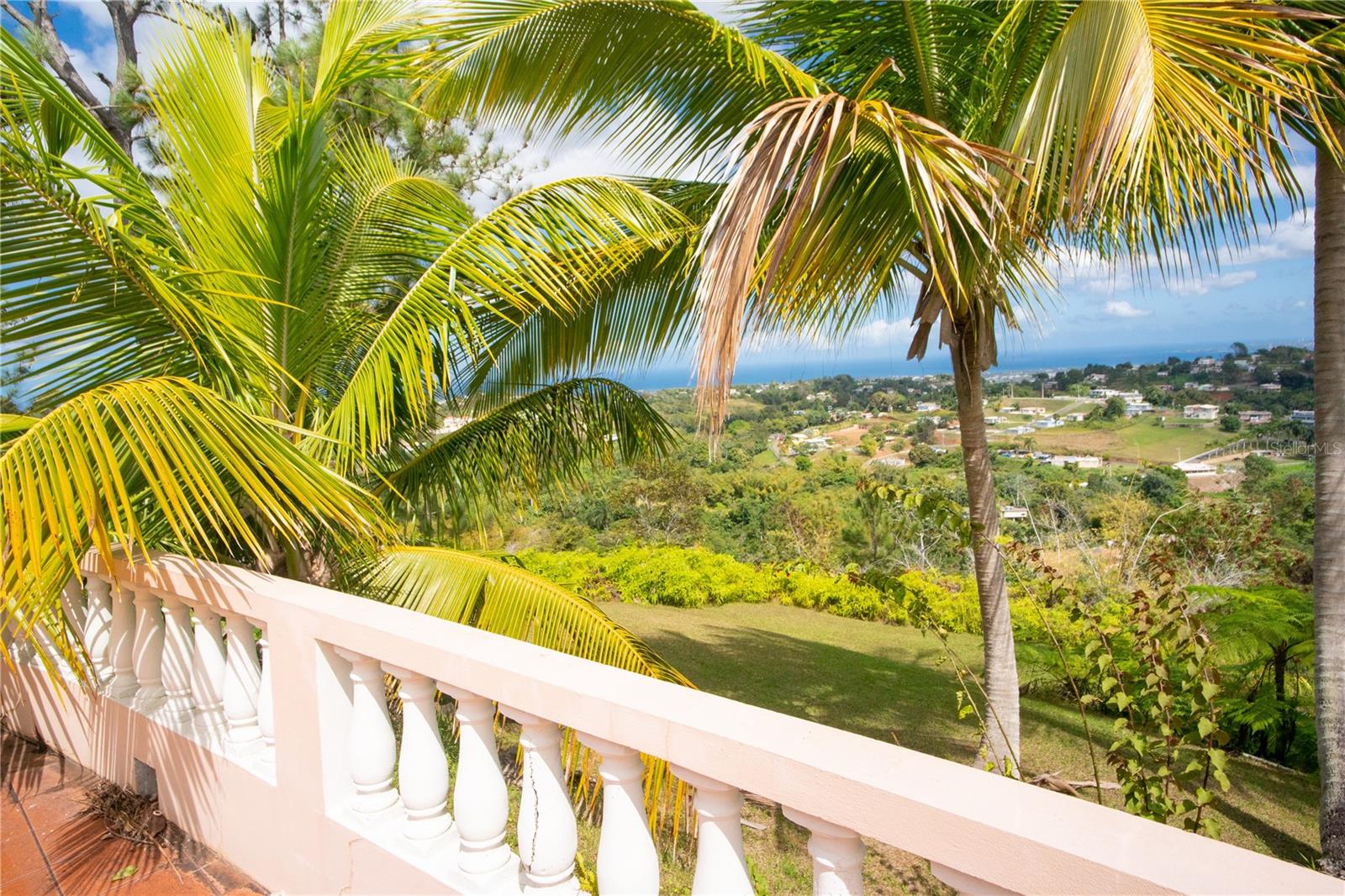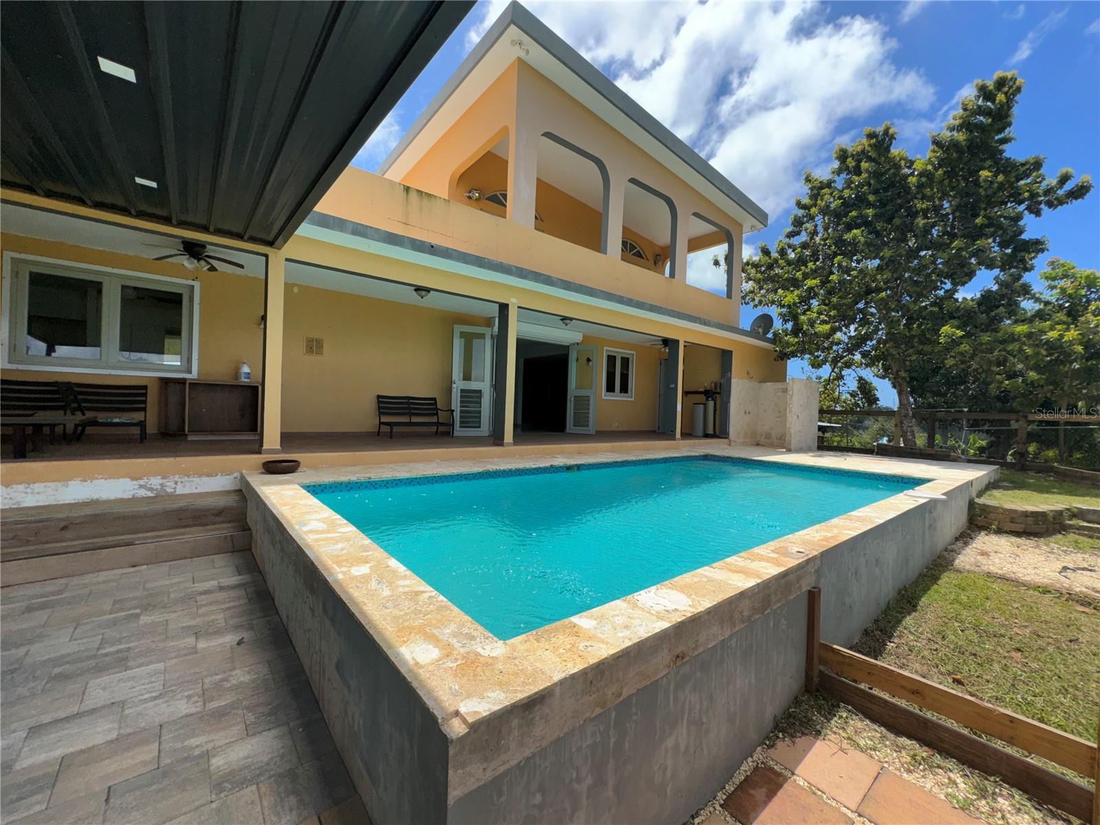 Secluded Villa in the mountains located at the borderline of Rincon and Aguada in Atalaya ward. Ocean views from many areas of the property. Property consists of: First level has 3 bedrooms, 2 full bathrooms, open kitchen-living room-dining room, huge foyer with majestic staircase and high ceiling that leads to second level, 2 car garage, laundry, pool, terrace, outdoor shower. Second level has 2 bedrooms, 1 bathroom, spacious open living room that access to big balcony and a huge open terrace. Property is aprox 1.8 acres with variety of trees including palm trees, plenty of lovely sitting areas. There is a separate studio with an additional pool. Additional building formerly used as a work shop. House is currently without furniture.
