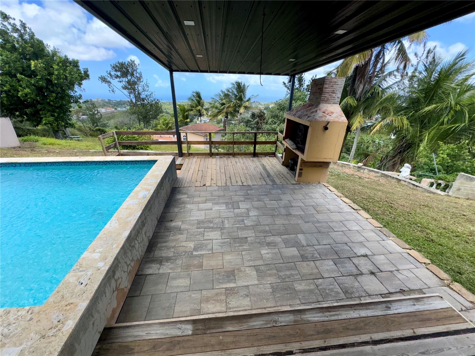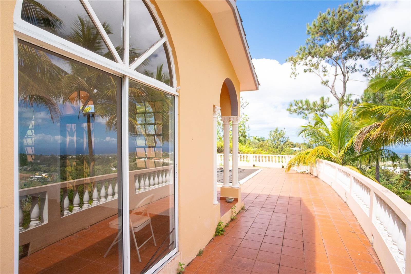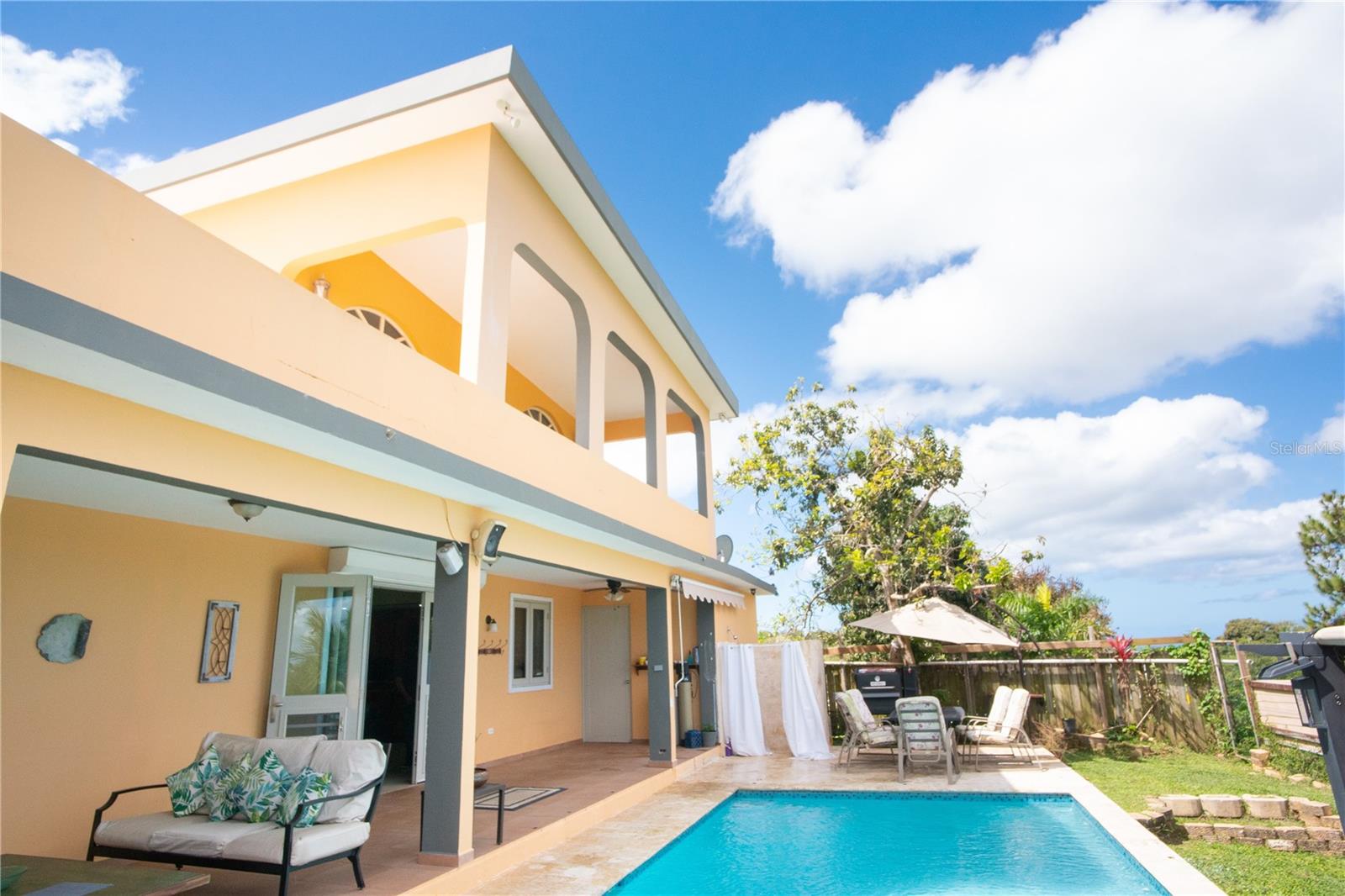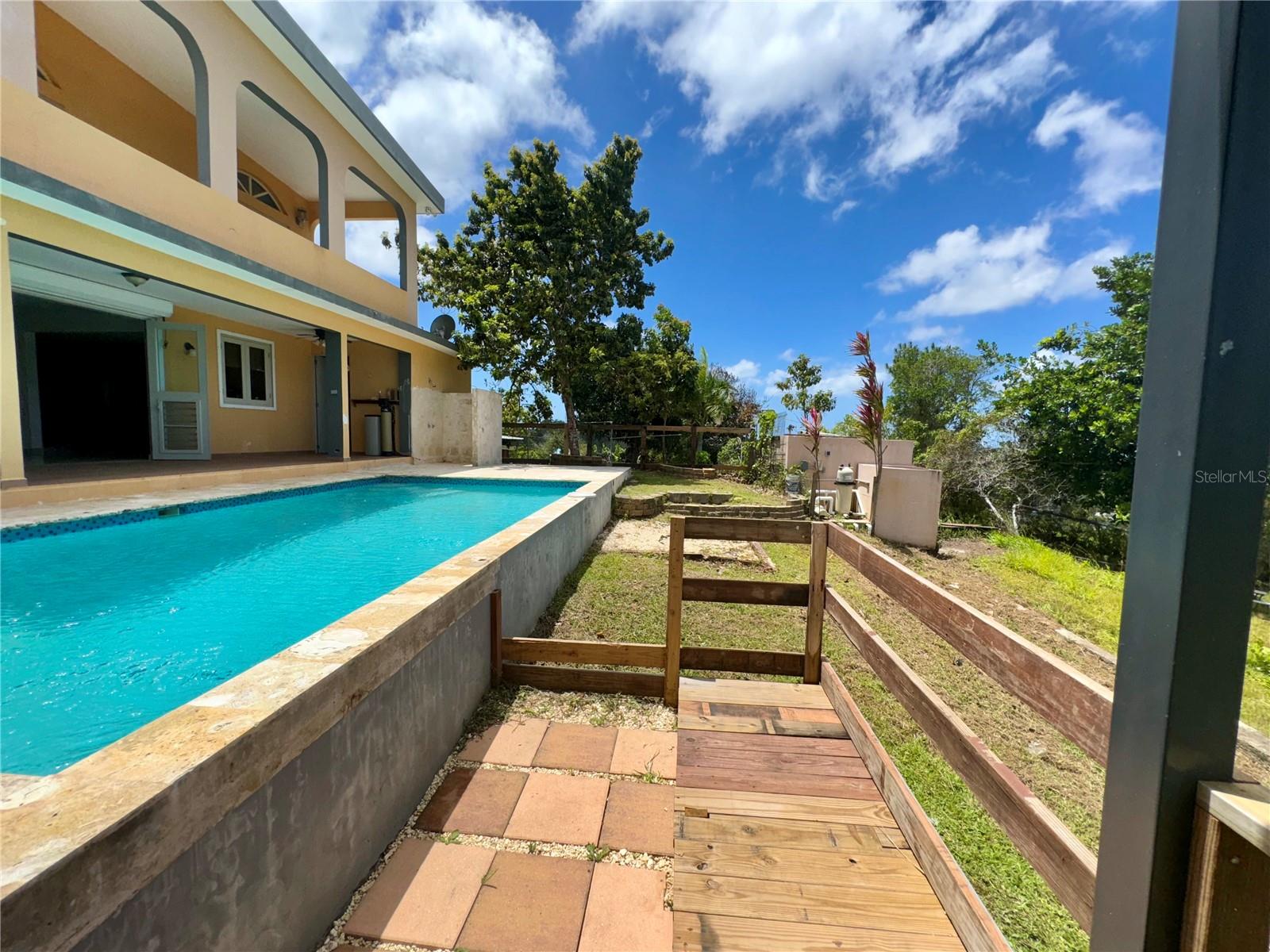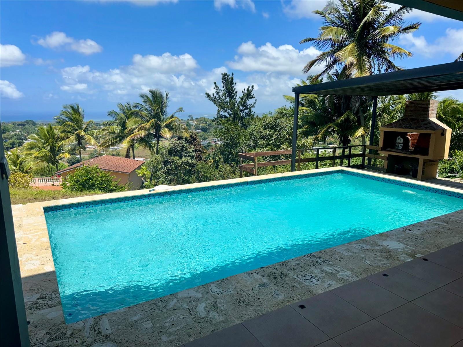 Secluded Villa in the mountains located at the borderline of Rincon and Aguada in Atalaya ward. Ocean views from many areas of the property. Property consists of: First level has 3 bedrooms, 2 full bathrooms, open kitchen-living room-dining room, huge foyer with majestic staircase and high ceiling that leads to second level, 2 car garage, laundry, pool, terrace, outdoor shower. Second level has 2 bedrooms, 1 bathroom, spacious open living room that access to big balcony and a huge open terrace. Property is aprox 1.8 acres with variety of trees including palm trees, plenty of lovely sitting areas. There is a separate studio with an additional pool. Additional building formerly used as a work shop. House is currently without furniture.
