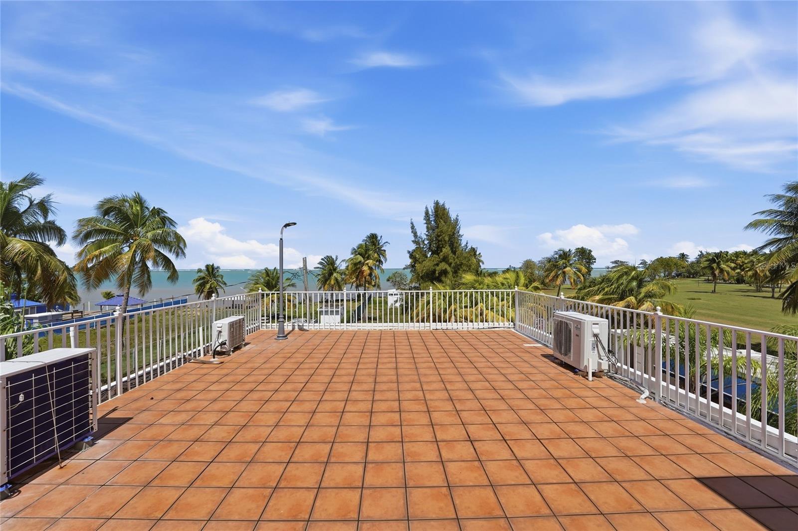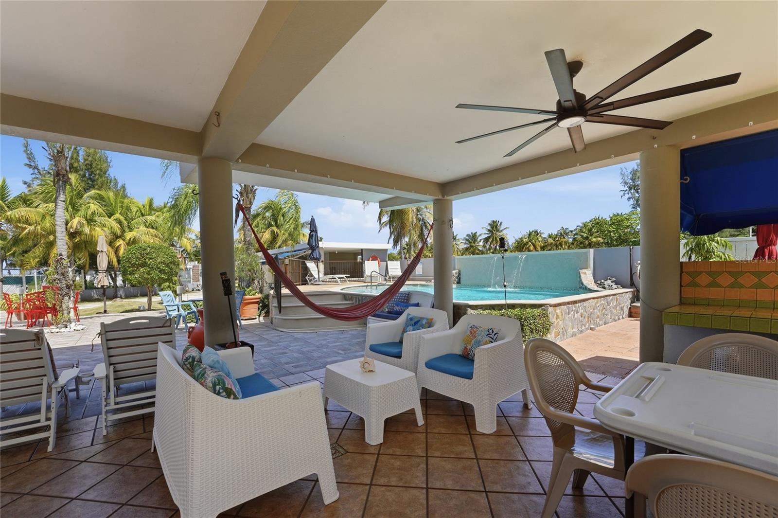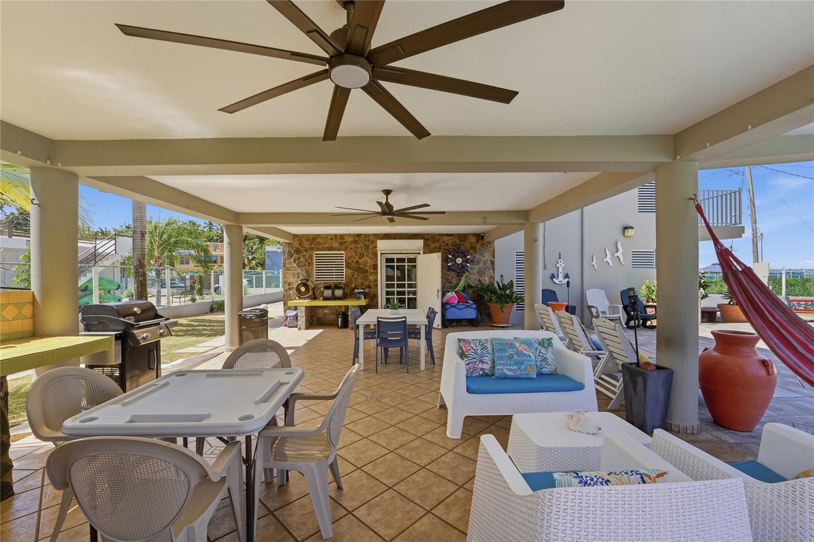 PALMA SOLA, Las Picuas, Rio Grande, Puerto Rico 5 Bedrooms · Ocean Front · Pool Discover your Caribbean oasis in the quiet Las Picuas neighborhood, just five minutes from Rio Mar resort. Perfect for beach lovers, this oceanfront property is ideal for snorkeling, paddleboarding, fishing, and sailing. This solid, three-story concrete home features French doors, storm windows, roll-down security doors, a pool, patio with bar, and generator. The main house has five bedrooms and three bathrooms. The master suite has an ensuite bath, while the spacious kitchen/living area and media room provide comfort. The roof deck is built for entertaining, complete with a shaded area and bar. An oceanfront casita with a roof deck offers breathtaking Caribbean views. The gated property features a utility building with bathrooms, storage, and lush tropical landscaping.