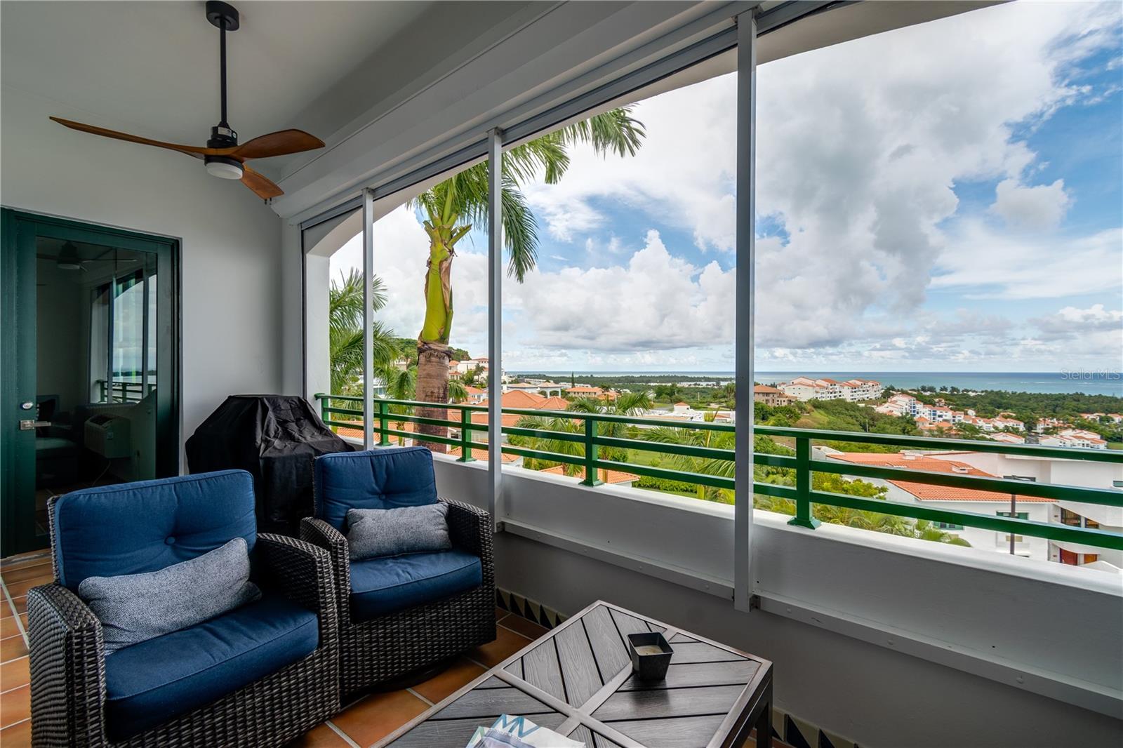 Spectacular corner PH, 1,884 sq/ft, with beautiful and impressive ocean views. In the best complex in Rio Grande, cluster 7. Exclusive and private. Fully furnished and equipped, with fine finishes and luxury decoration. 2B, 3B, living room, kitchen, dining room, family and balcony. 30 foot high ceilings, super comfortable, large and spacious. With plenty of lighting and cross ventilation. View from all angles of the apartment, views of the sea and El Yunque, lots of greenery and ocean. FULL GENERATOR, and tanker. Everything you could want in a luxury property, tranquility, peace, access to Rio Mar Beach Club and recreational areas, security, pool and maintenance; access to hotel, club house, restaurants, golf course, tennis courts, direct access to the beach.