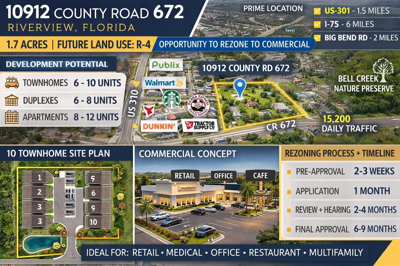 This property represents a remarkable redevelopment opportunity, boasting high and dry terrain free from lowlands or flood zones—so you can proceed with confidence. With 414 feet of prime highway frontage, the site enjoys exceptional visibility, making it highly attractive for a variety of uses. While currently designated AR, future land use plans indicate an upgrade to R4, opening the door for seamless conversion to commercial or residential purposes. The property’s direct access to County Road 672—a bustling two-lane thoroughfare with an average daily traffic count of 16,400 vehicles—further amplifies its exposure. Additionally, the proximity to US 301 S., a major six-lane divided highway accommodating approximately 41,643 vehicles daily, ensures an unparalleled level of accessibility. What truly sets this property apart is its unique combination of strategic location, outstanding visibility, and flexible redevelopment potential. These attributes not only enhance its immediate appeal but also create a strong foundation for a wide array of profitable ventures. For investors looking to maximize both short-term returns and long-term growth, this site stands out as an exceptional choice.