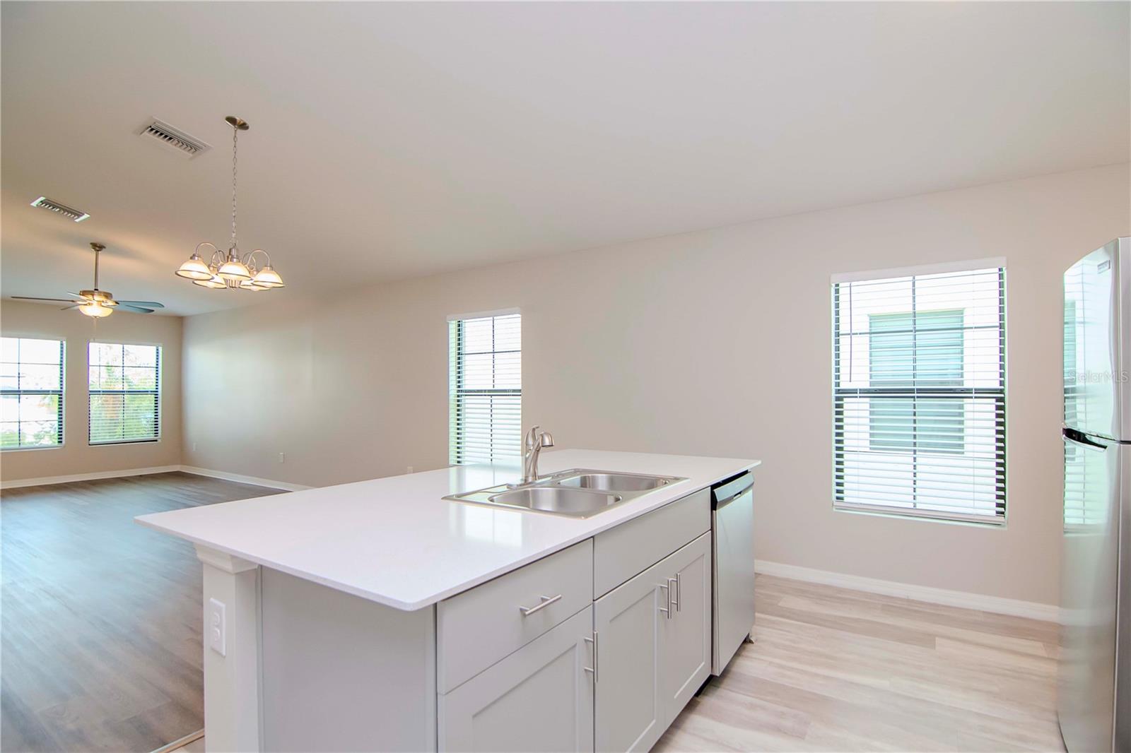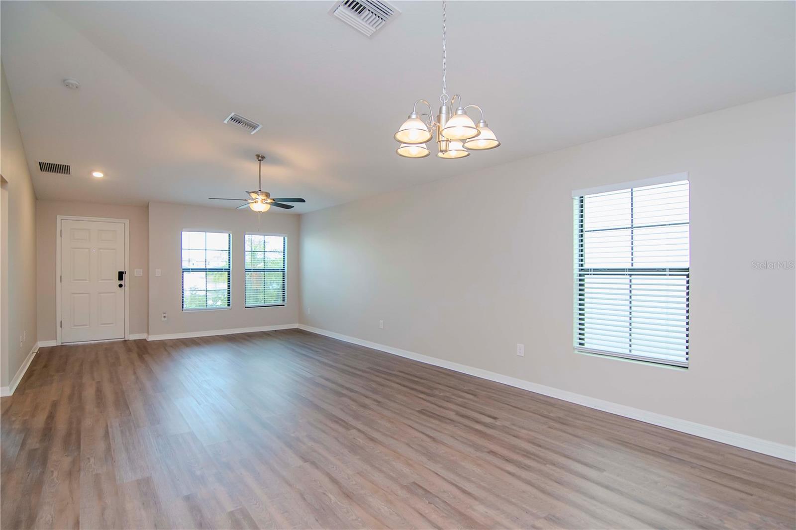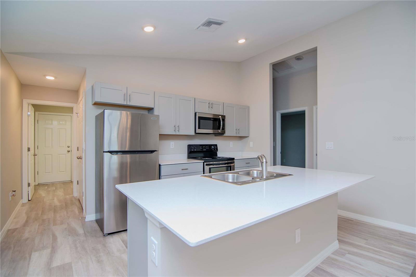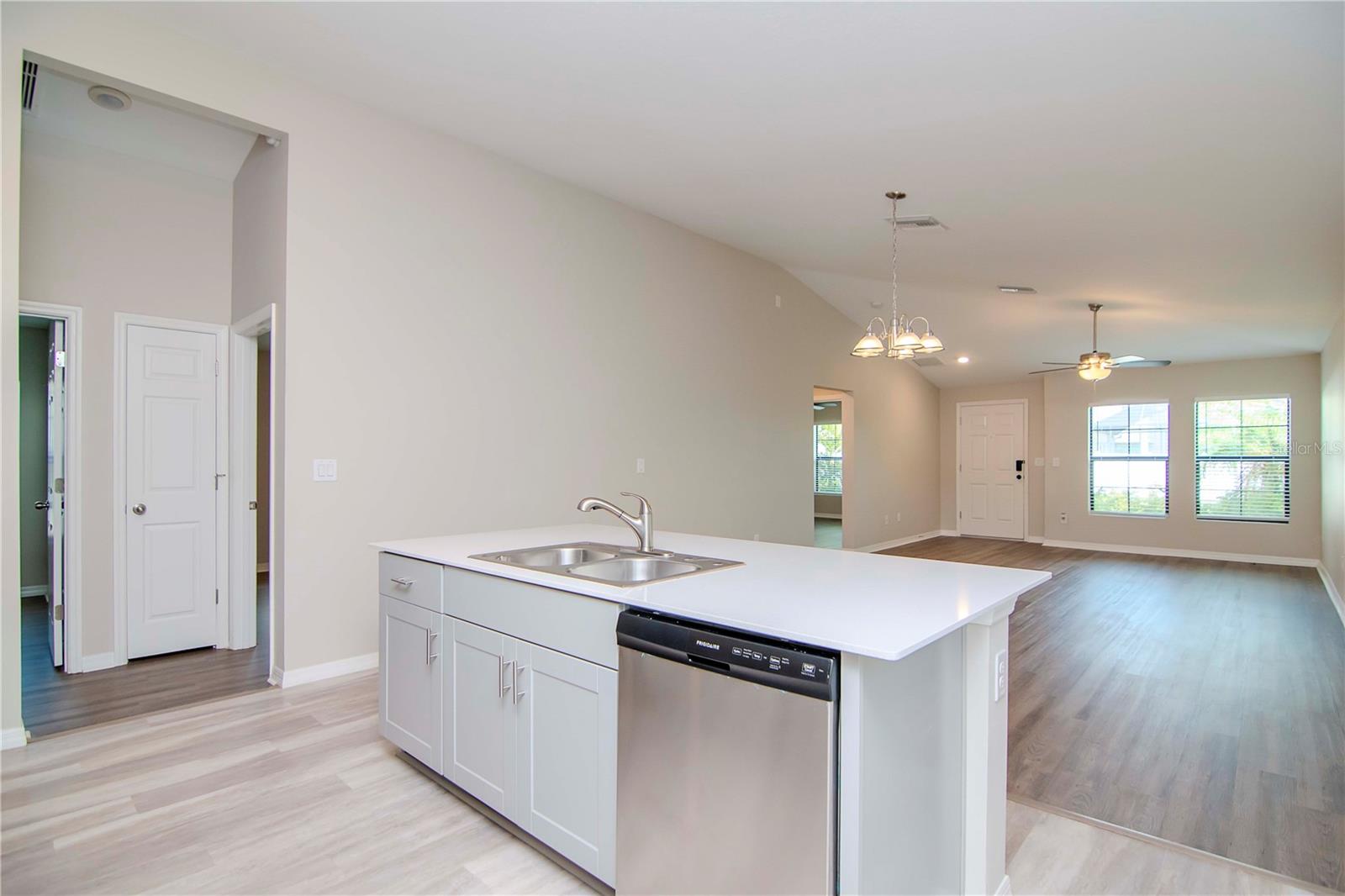 Elegantly designed and freshly completed, this residence awaits you and your loved ones. Featuring 3 bedrooms, 2 bathrooms, and a spacious 2-car garage, this single-level abode maximizes its layout for comfortable living. The heart of the home, a contemporary kitchen, boasts a central island, chic grey Timberlake cabinetry, high-end stainless-steel Frigidaire appliances, luxe Silestone Quartz countertops, and a generous double-door pantry, all flowing seamlessly into the inviting family room. Throughout the home, luxury vinyl flooring adds an element of sophistication. The primary suite is a haven of relaxation with a large walk-in closet, while its attached bathroom offers dual vanities and an expansive walk-in shower. Two additional bedrooms share access to a well-appointed full bathroom. A convenient laundry area is positioned near the kitchen and garage entrance. Prepared for any weather, hurricane panels for the double-pane windows are stored in the garage. Outdoor living is a breeze with a rear patio perfect for barbecues. Situated within the neighborhood is the Warren Hope Dawson Elementary School & the Goddard School for pre-school & daycare, which enhances the family-friendly appeal. Located in the Triple Creek Community, residents enjoy easy access to shopping, dining, and the interstate, alongside impressive amenities such as two swimming pools, a splash pad, dual fitness centers, clubhouses, a dog park, basketball and tennis courts, a playground, and scenic walking trails. This home is just waiting for you to move in!