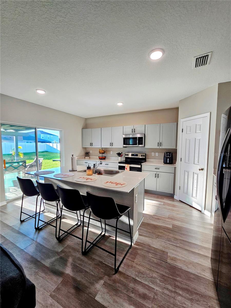 Beautiful home on pie-shaped lot in the desired Triple Creek! Your family will love living adjacent to the Triple Creek Greenway. This five-bedroom, three-bathroom, two-car garage home is loaded with upgrades. Neutral gray luxury vinyl plank flooring is throughout the first-floor common areas for easy maintenance. The open-concept kitchen and dining room overlook your large family room. Your upgraded kitchen features light gray cabinets, quartz counters, a single bowl sink, stainless appliances, recessed LED lighting, a roomy corner pantry, and a counter-height island with additional seating. The custom accent wall with a built-in fireplace in the family room. Sliders off the kitchen lead you to a custom extended lanai and a fully fenced backyard. The upgrades added to this space, including an oversized pergola with two ceiling fans, recessed lighting, a paved lanai, and added outdoor outlets. As you go back inside, a secondary bedroom with a full bathroom is conveniently located on the first floor. It is the perfect area for a guest suite, office, or even a secondary master for multi-generational living. At the top of the stairs, you'll find the large loft with great space for a game room, den, or playroom. Exiting from the left of the loft are three more spacious bedrooms and a full bathroom with quartz counters. A hallway off the right of the loft leads you to a vast Master Retreat. The en-suite master bath includes a walk-in shower, quartz counters, a double vanity with dual sinks, and a sizeable walk-in closet. Your laundry room is conveniently located just outside the Master Retreat and includes a washer and dryer. Other upgrades to the home include a smart thermostat, a video doorbell, a wireless garage door opener, and rain gutters.Triple Creek, amenities include multiple resort-style pools, a splash pad, a clubhouse, a fitness center, tennis and basketball courts, a dog park, walking trails, and numerous playgrounds. Dawson Elementary School is located within Triple Creek and easy walking distance from the home, also zoned for Barrington Middle School and brand new Sumner High School. This Riverview community is just minutes from I-75 on the Balm Riverview corridor, 9 miles from Apollo Beach: extremely convenient shopping, restaurants, and many health care facilities.