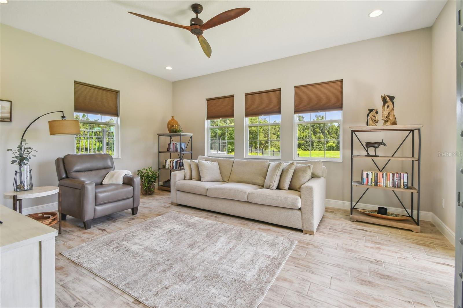 Discover the epitome of Florida living in the sought-after Hawkstone Subdivision, featuring the sophisticated Artisan Collection GATED Preserve. This stunning home offers the most comfortable and practical spaces where it counts most. The foyer, formal dining room, grand room, and spectacular kitchen feature soaring 12-foot ceilings, creating a sense of grandeur and openness. Luxury designer lighting, Minka Aire fans, and custom wood architectural features elevate the home's aesthetic, offering unique touches beyond available upgrades from the builder. Enjoy a double-door entry into the owner's retreat, complete with an expansive walk-in closet and a luxurious bath. The gourmet kitchen is equipped with high-end GE appliances, Arbor faucets, Sonoma Duraform Linen cabinets with satin nickel pulls, Calacatta Novello Corian Quartz countertops, and Ventura 7x22 wood-look tile flooring. This Key Largo I from WestBay Builders includes an oversized laundry room, a bonus room, and two large, covered lanais for outdoor living. This 2022 single-story home boasts a 3-car garage, 4 bedrooms, 3 full bathrooms, a private office with double doors, and an additional bonus room. The feeling of openness with lots of natural light and features like soaring ceilings with decorative beams, 8-foot doors, home surround sound wiring setup, and high-end finishes throughout make this home truly exceptional. Located in the master-planned community of Hawkstone in Lithia, FL, residents enjoy resort-style amenities and proximity to top-rated schools, nature preserves, and family-friendly activities. The community offers pools, pickleball courts, fishing and rowing lakes, walking trails and playgrounds. Close to US-301 and I-75, Hawkstone provides easy access to surrounding Tampa Bay. Experience a quiet and private backyard with an incredible water view, abundant wildlife, and woods to explore. With no neighbors on one side, and no front or back neighbors, this home offers enhanced privacy. Commercial-grade security cameras with two-way audio are accessible from any phone or computer, ensuring peace of mind. Experience the elegance and comfort of this grand residence, nestled in the gorgeous natural gas, tile roof and brick-pavers private community. Don't miss this incredible opportunity to own a piece of Florida paradise!