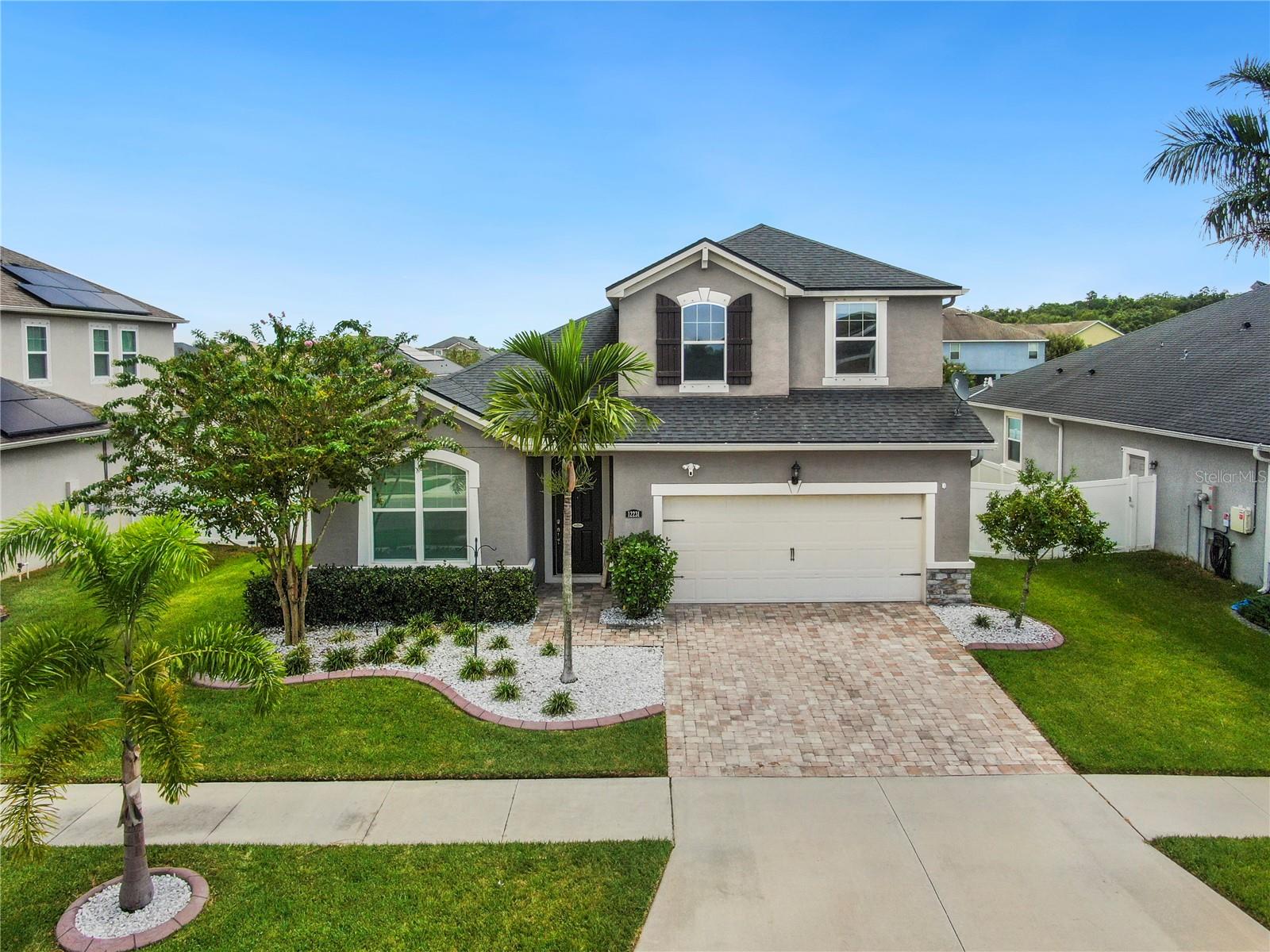 Welcome to your dream home, perfectly situated in the highly sought-after Triple Creek community. This stunning two-story residence boasts exceptional curb appeal with its driveway pavers, stacked stone accents, and meticulous professional landscaping. Inside, you'll be captivated by the high ceilings and high-end finishes that highlight the numerous builder upgrades and thoughtful post-construction enhancements made by the current owners. Enjoy the fresh, new carpet in all bedrooms, office, and loft areas, while plantation shutters and blinds add a touch of elegance throughout. The heart of this home is its expansive, open living area, designed for both comfort and functionality. The chef's kitchen is a culinary delight, featuring a spacious island with a breakfast bar, stainless steel appliances, warm wood cabinetry, and granite countertops. A large walk-in pantry and a reverse osmosis system ensure convenience and quality in your cooking. This space seamlessly transitions into the dining area and Great Room, where sliders open up to a fantastic, covered lanai. The lanai, complete with pavers and a large hot tub, is perfect for entertaining or relaxing, while the fully fenced backyard provides privacy with a wooded buffer. Upstairs, the versatile loft area with surround sound is ideal for movie nights or a game room, complemented by three generous secondary bedrooms and a full bath. The Master Suite, conveniently located on the main floor, offers a large walk-in closet and a luxurious bath with dual sinks and quartz countertops. Additional features include a laundry room with ample cabinetry, a deep stainless utility sink, and granite counters, along with a garage outfitted with extra storage and a water softener. Triple Creek offers resort-style amenities such as pools, a splash pad, playgrounds, tennis courts, and miles of sidewalks for outdoor activities to enjoy the Florida lifestyle. With highly rated schools in the area, this property is the perfect blend of luxury, convenience, and community.