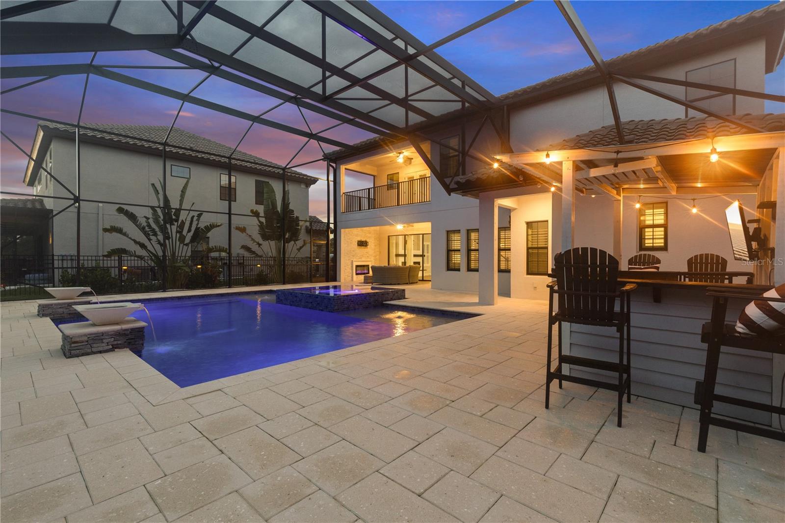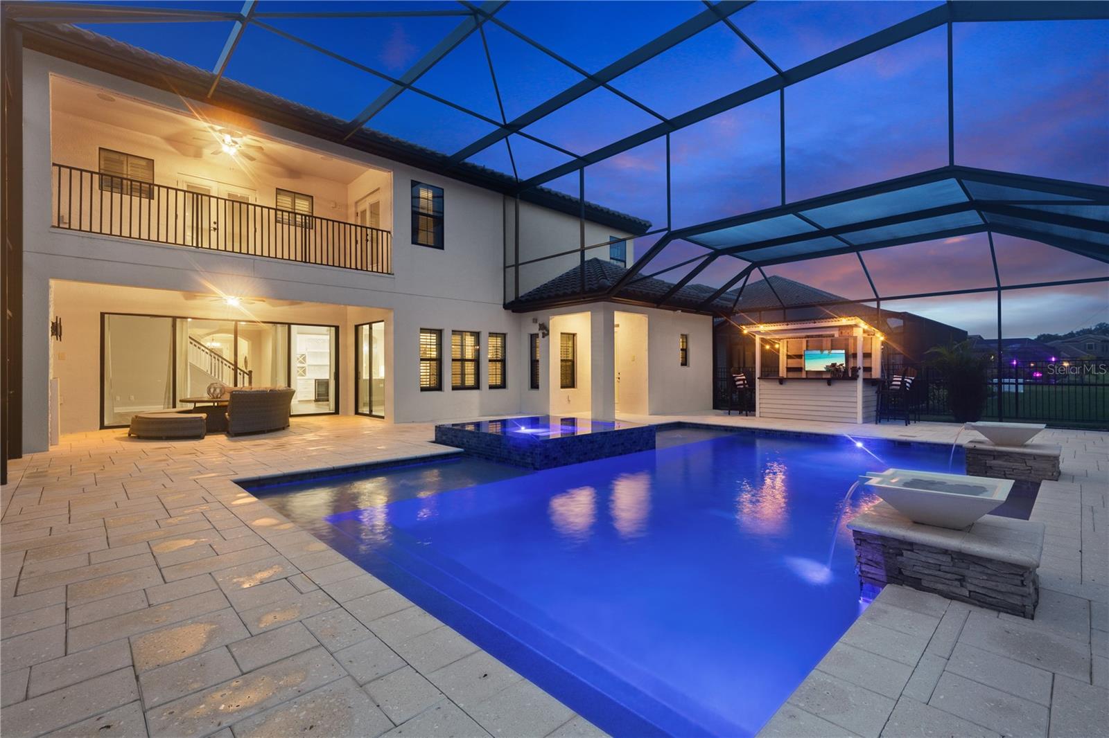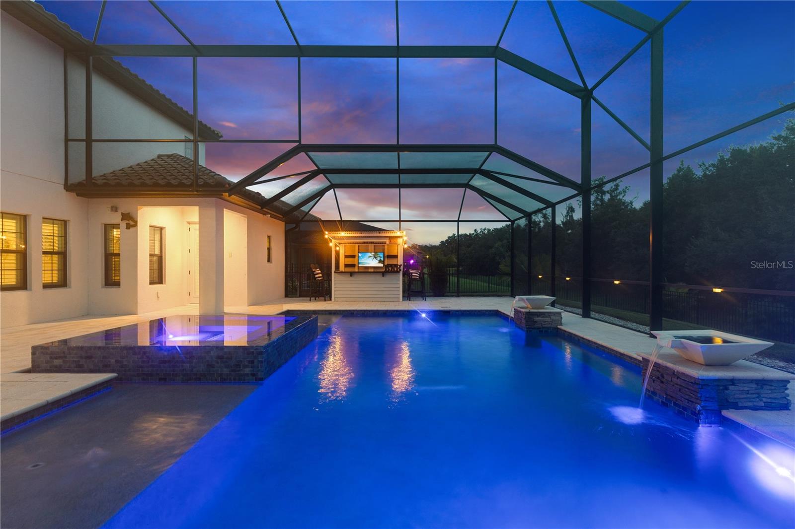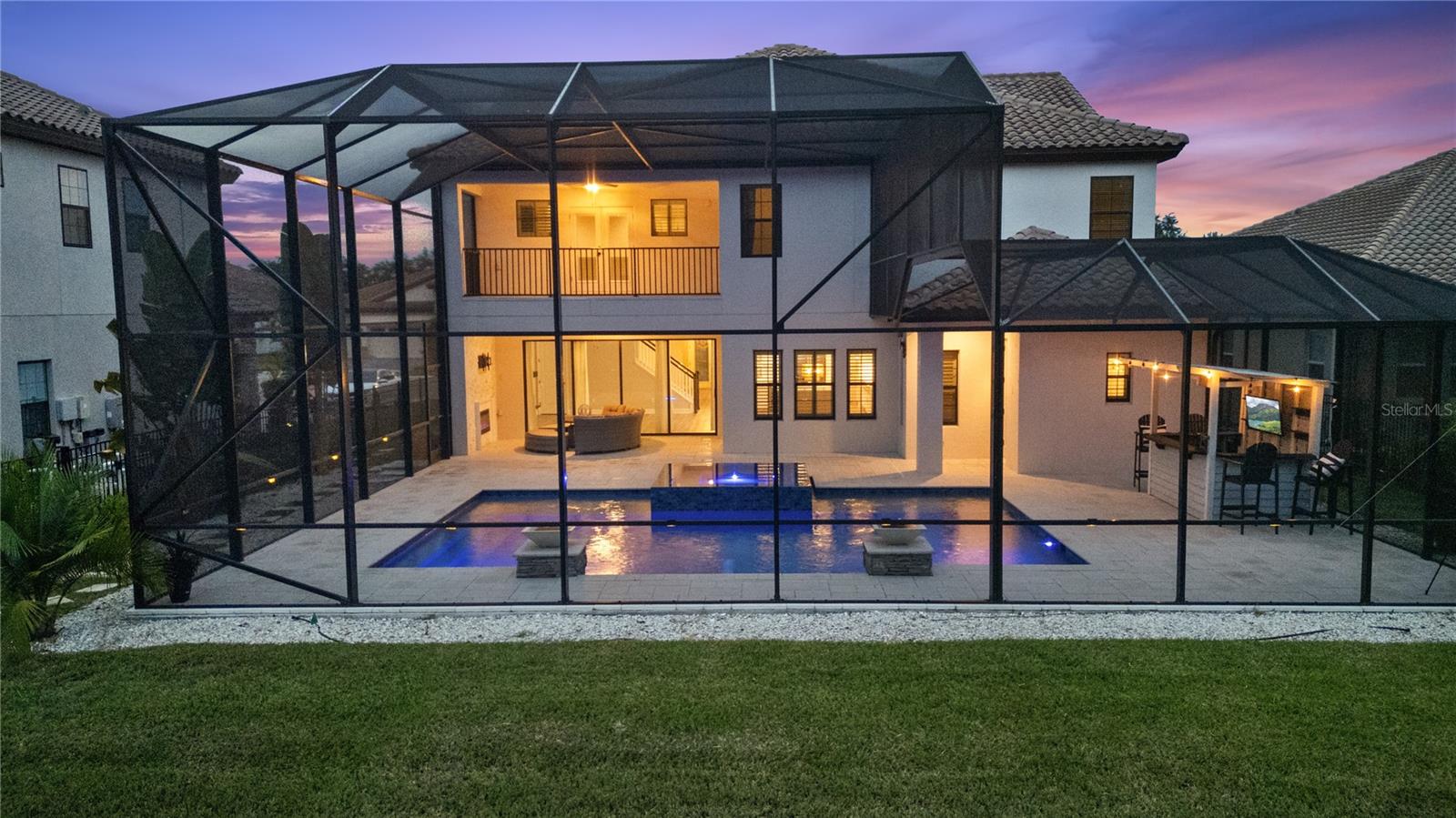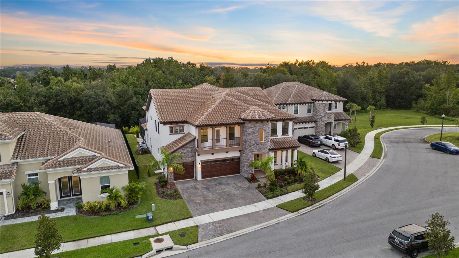 One or more photo(s) has been virtually staged. **Sellers will assist with buyers' closing costs** Step into your dream home. This EXQUISITELY DESIGNED Homes by WestBay Granada, just 2 years NEW, in the highly desired Hawkstone community! Nestled near the end of the ONLY cul-de-sac within the Artisan GATES, this 7-bedroom, 6-bathroom, almost 5,000 SQ FT home offers unparalleled luxury. Expertly customized and designed, from the stunning Tuscan elevation to the resort backyard, this home is a GEM with STUNNING quartz countertops throughout, luxury vinyl plank flooring on the first level, wood-look tile ceramic flooring, 8' doorways, upgraded light fixtures in EVERY room, tray ceilings, shiplap, crown molding, whole-home surround sound, security system, water softener, plantation shutters, AND 2 custom-built feature walls with fireplaces. The heart of the home is the meticulously designed gourmet kitchen with matte stainless CAFE appliances, including a French door oven and beverage fridge. Gorgeous quartz countertops, herringbone subway tile backsplash, an apron sink, wine racks, modern open shelving, chrome island light fixtures, pot filler, and cabinet lighting will make any Chef’s dream come true! The primary bedroom is on the main floor and features two walk-in closets with customized built-ins and TWO BATHROOMS. Yes, it has TWO EN SUITE BATHROOMS. Welcome to PARADISE!!! The primary bathroom features lighted anti-fog mirrors, an oversized shower with dual/rain shower heads, picket fence tile, and frameless glass. The second bathroom also works as a convenient pool bath with all the upgrades including an aesthetic barn-door style shower door. Upstairs, there are six more bedrooms, three full bathrooms, and an ENORMOUS BONUS ROOM. A golfer's delight takes up half of the recreational area with a FlightScope golf simulator with turf to hold your tee! The screen converts seamlessly into a home theater for cozy family movie nights. Adjacent to the bonus room, you will discover even more space perfectly suited for a poker or pool table! The expansive rear balcony offers a serene pool and conservation view for morning coffee and sunsets with a glass of wine. The backyard resort highlights a sparkling 20 x 30 saltwater pool equipped with app-controlled lighting, and gas heating and enhanced by two stone water bowl features and elegant subway-tiled glass. Unwind on one of two tanning ledges, each with umbrella stands and bubblers, or in the oversized infinity spa! Entertain in style at the outdoor bar, or relax by the custom-built fireplace, all under upgraded lighting, speakers, and ceiling fans. Outdoor speakers can be played by room or connected to the whole-home sound system to set the perfect ambiance. Stay secure with wired security cameras monitoring over 600 SQ FT of outdoor living space. The fully fenced backyard includes French drains, and three convenient gate access points. While this home offers resort-style amenities, the Hawkstone community adds TOP-RATED Lithia schools, nature preserves, walking trails, swimming and lap pools, a dog park, playgrounds, pickleball courts, a yoga lawn, bocce ball, and a picturesque floating dock. Hawkstone provides easy access to Tampa, Orlando, and world-class white sugar sand beaches while also providing a cozy community feel close to nature. THIS is your dream home.
