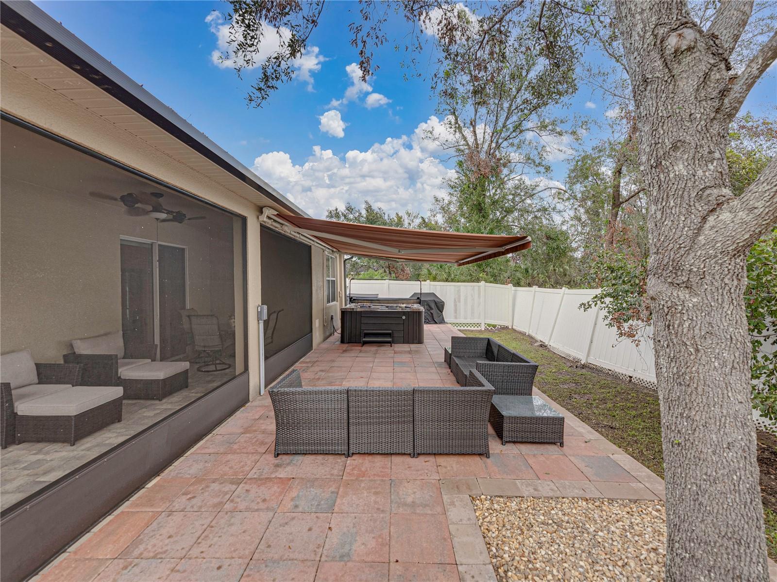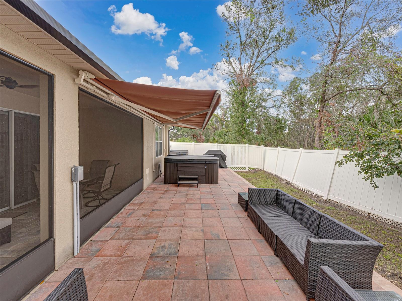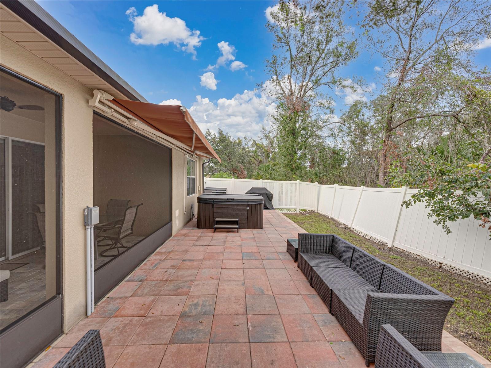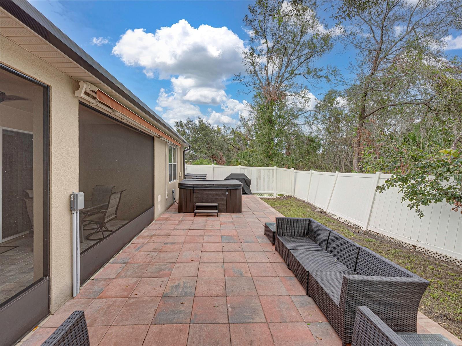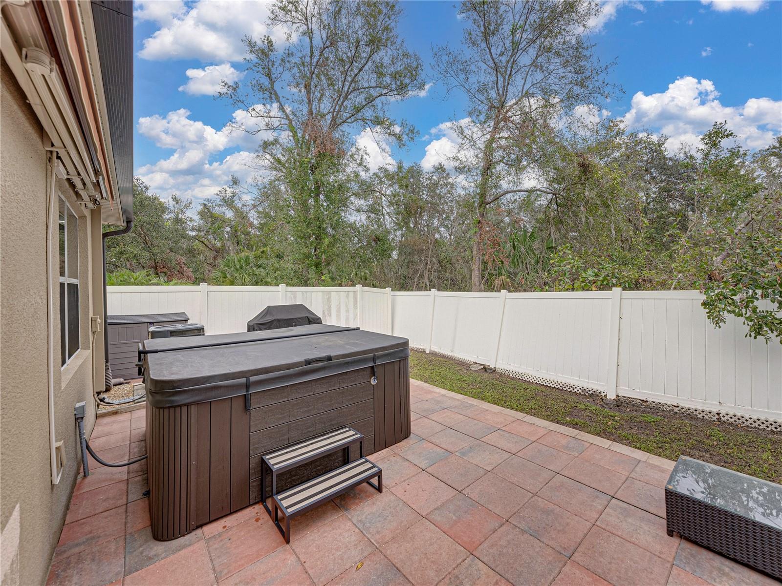Immaculately Maintained Home in Riverplace with a BRAND NEW ROOF!!! NO CDD!! Welcome to your dream home! This beautifully maintained property offers a spacious and open living/dining/kitchen floor plan that seamlessly extends to an expansive screened lanai. Perfect for entertaining or relaxing, the lanai leads to a raised deck in the fenced backyard, featuring a luxurious hot tub with dual motors, 56 jets, lighting, waterfall, and fountain. Enjoy the privacy of no backyard neighbors and the comfort of a large retractable awning that lights up, providing wonderful shade and cooling the entire house. Inside, you’ll find tile flooring throughout the main living areas and wet areas, ensuring easy maintenance and a sleek look. The primary bedroom is a true retreat with an en suite bath that includes a large soaking tub, separate shower, and dual sinks. The kitchen is a chef’s delight, boasting an island with seating for four, a large pantry, and a convenient coffee station. Additional features include a direct wire in the garage for a generator plug-in, perfect for stormy days when power outages occur. Nestled in the private neighborhood of Riverplace, this home offers tranquility and convenience with no CDD fees. All schools are conveniently located with bus pickup in the neighborhood. Don’t miss out on this exceptional home that has everything you need and more. Schedule your showing today!
