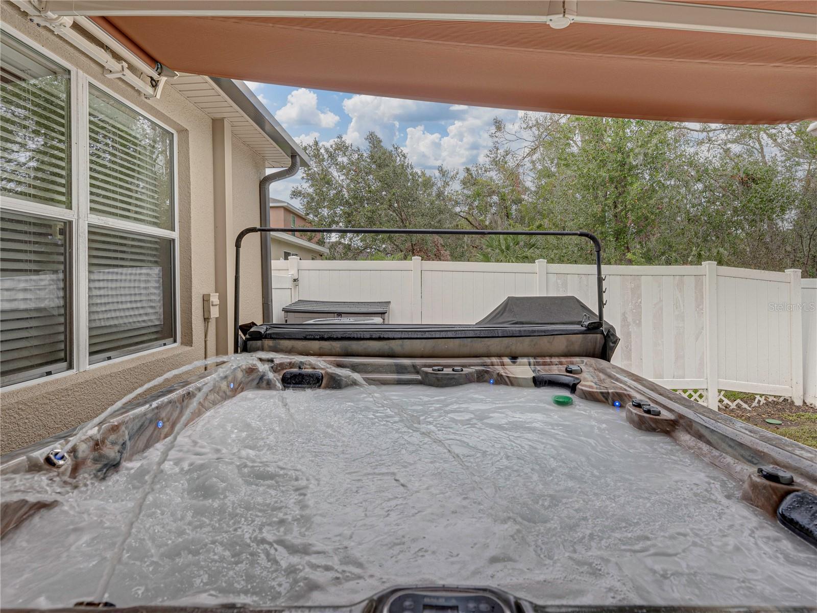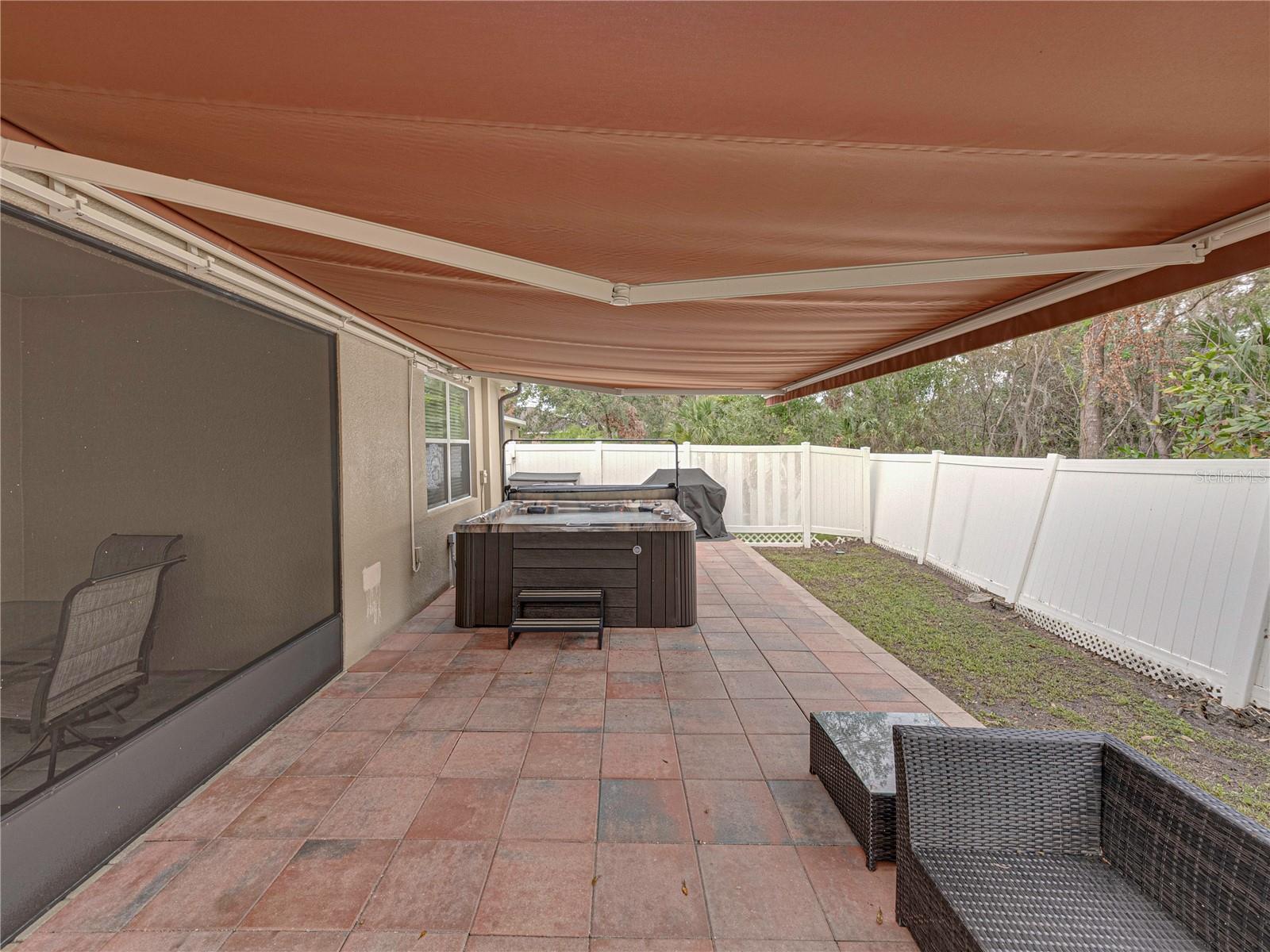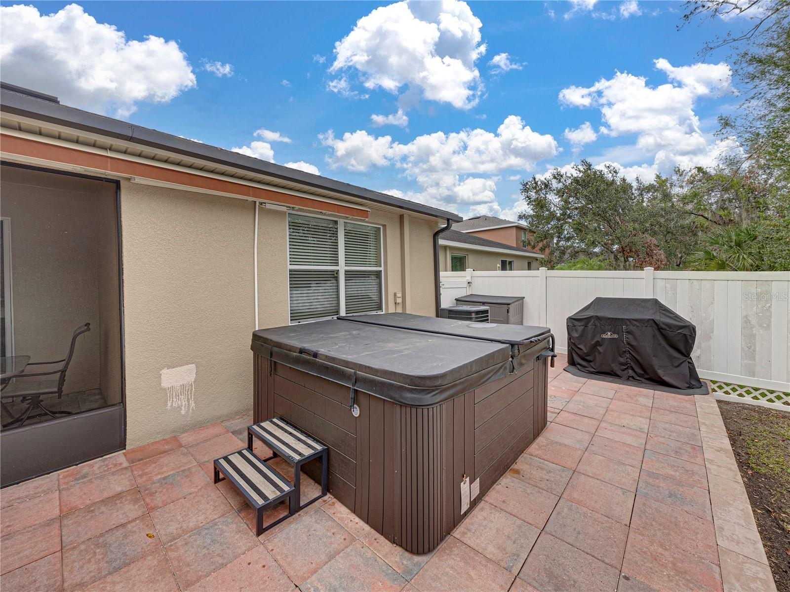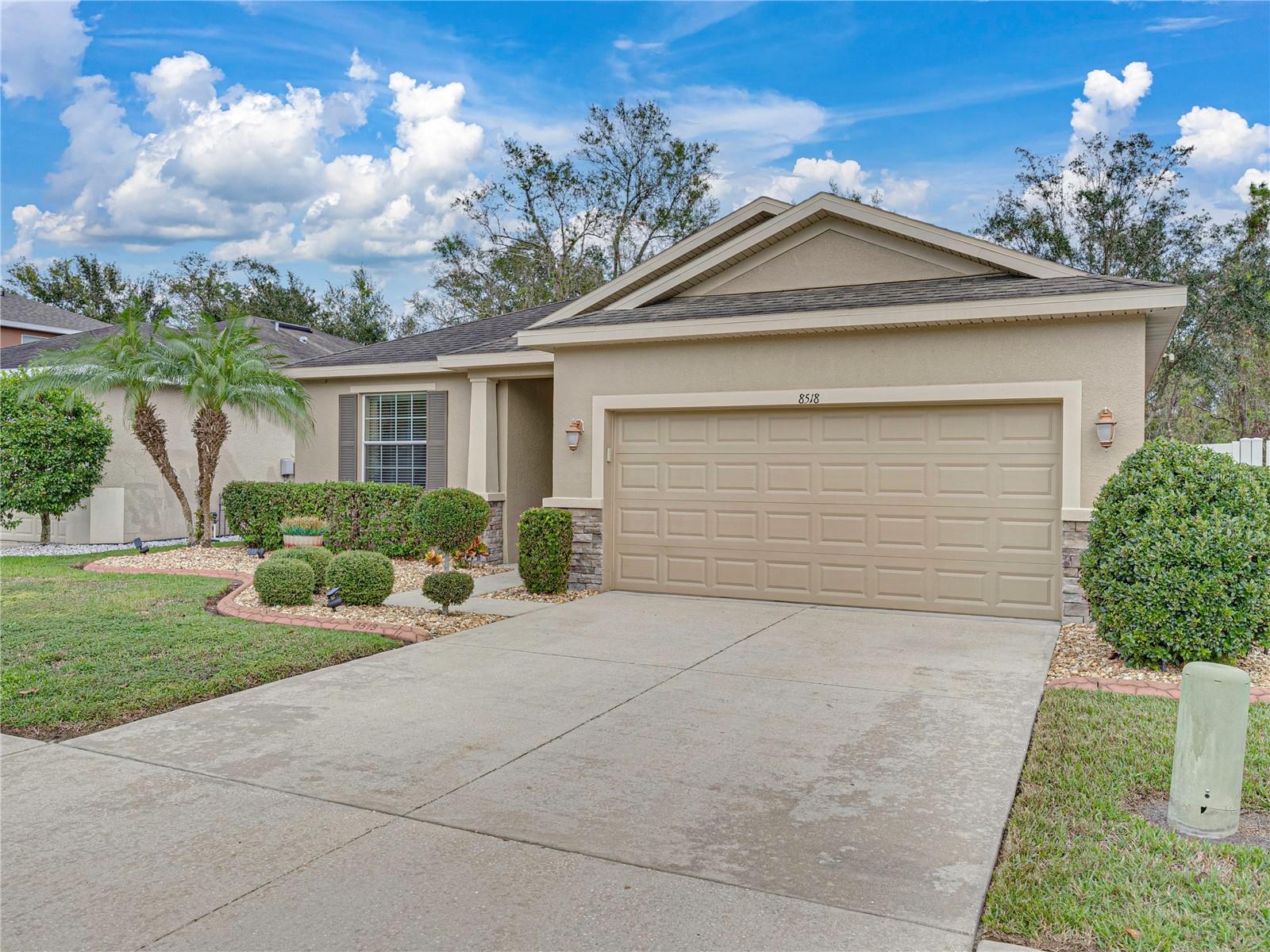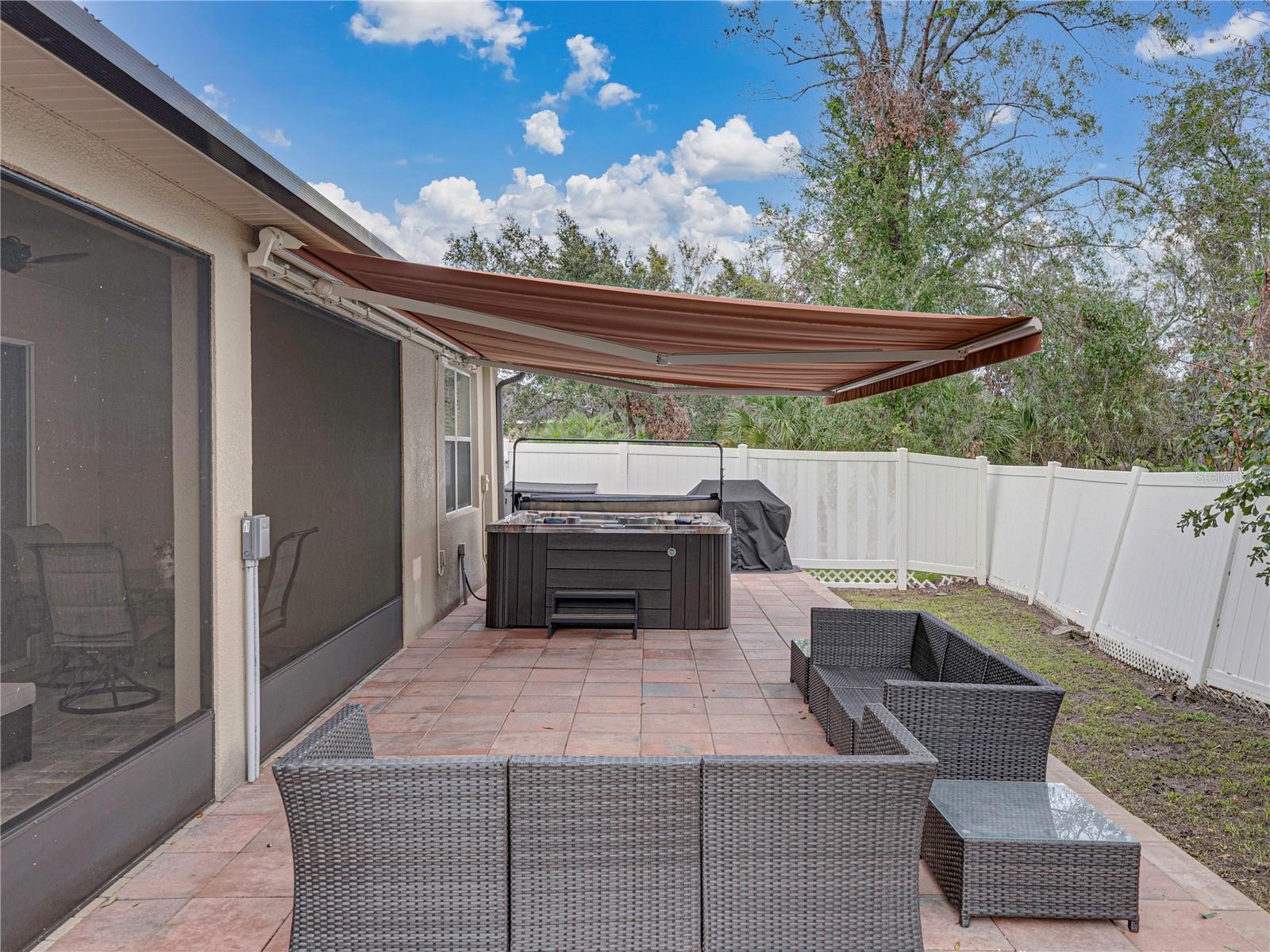 Immaculately Maintained Home in Riverplace with a BRAND NEW ROOF!!! NO CDD!! Welcome to your dream home! This beautifully maintained property offers a spacious and open living/dining/kitchen floor plan that seamlessly extends to an expansive screened lanai. Perfect for entertaining or relaxing, the lanai leads to a raised deck in the fenced backyard, featuring a luxurious hot tub with dual motors, 56 jets, lighting, waterfall, and fountain. Enjoy the privacy of no backyard neighbors and the comfort of a large retractable awning that lights up, providing wonderful shade and cooling the entire house. Inside, you’ll find tile flooring throughout the main living areas and wet areas, ensuring easy maintenance and a sleek look. The primary bedroom is a true retreat with an en suite bath that includes a large soaking tub, separate shower, and dual sinks. The kitchen is a chef’s delight, boasting an island with seating for four, a large pantry, and a convenient coffee station. Additional features include a direct wire in the garage for a generator plug-in, perfect for stormy days when power outages occur. Nestled in the private neighborhood of Riverplace, this home offers tranquility and convenience with no CDD fees. All schools are conveniently located with bus pickup in the neighborhood. Don’t miss out on this exceptional home that has everything you need and more. Schedule your showing today!