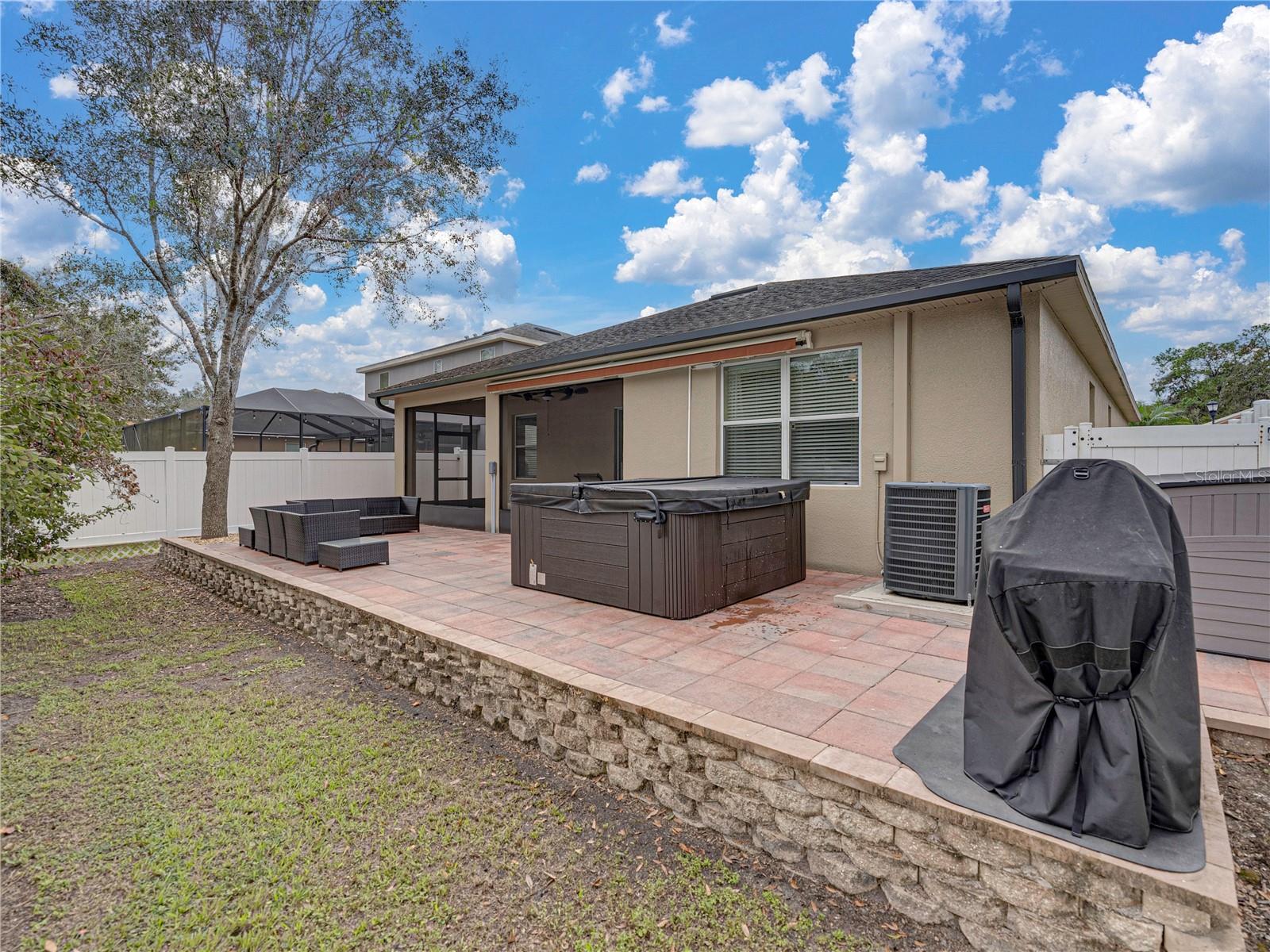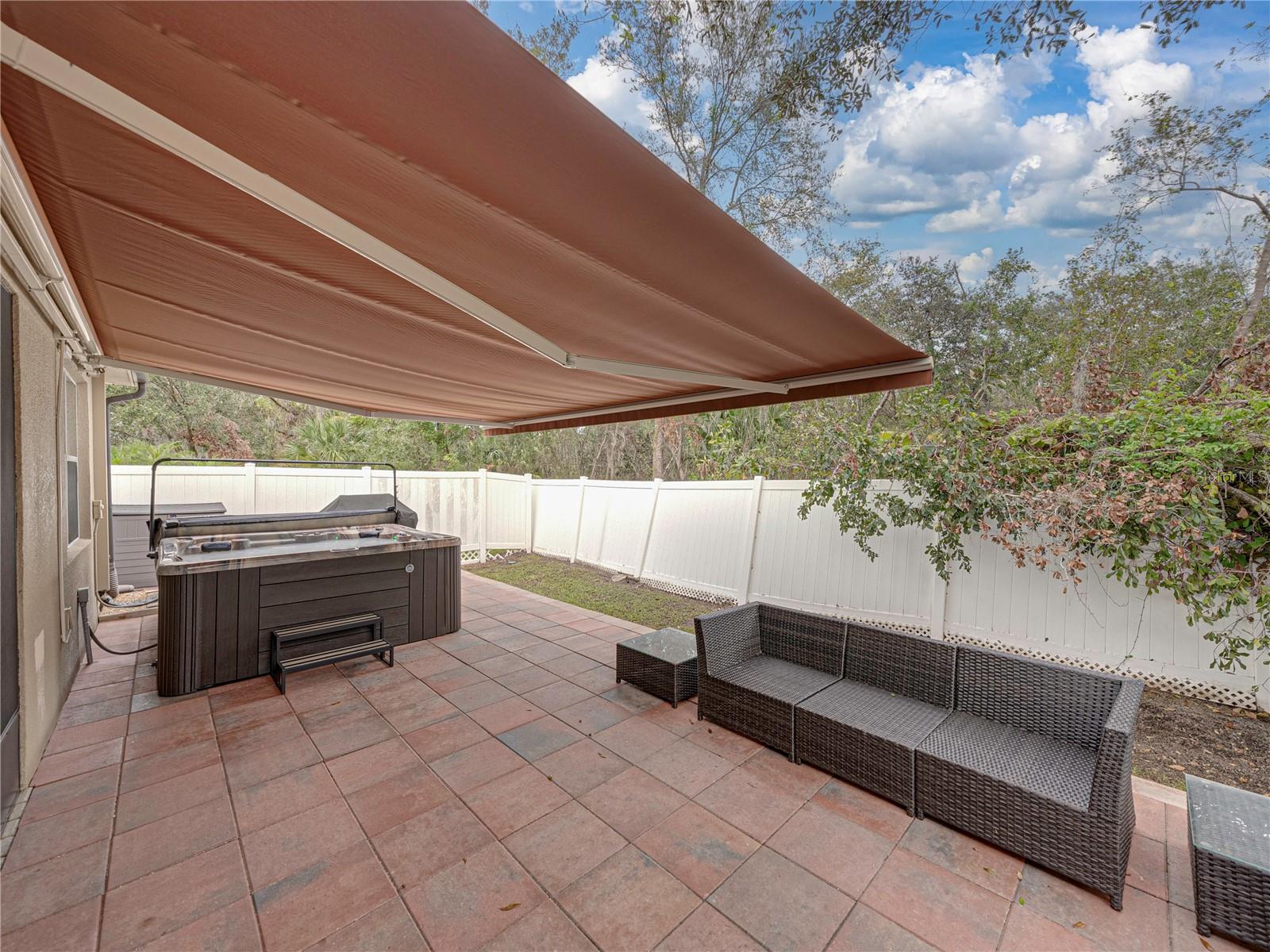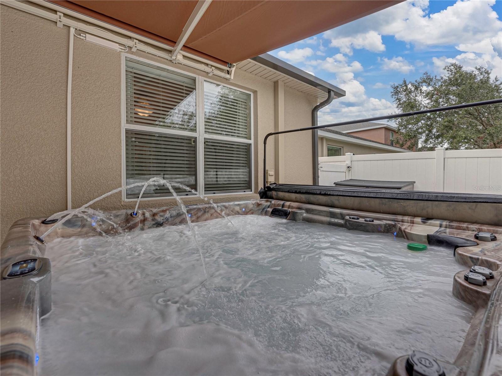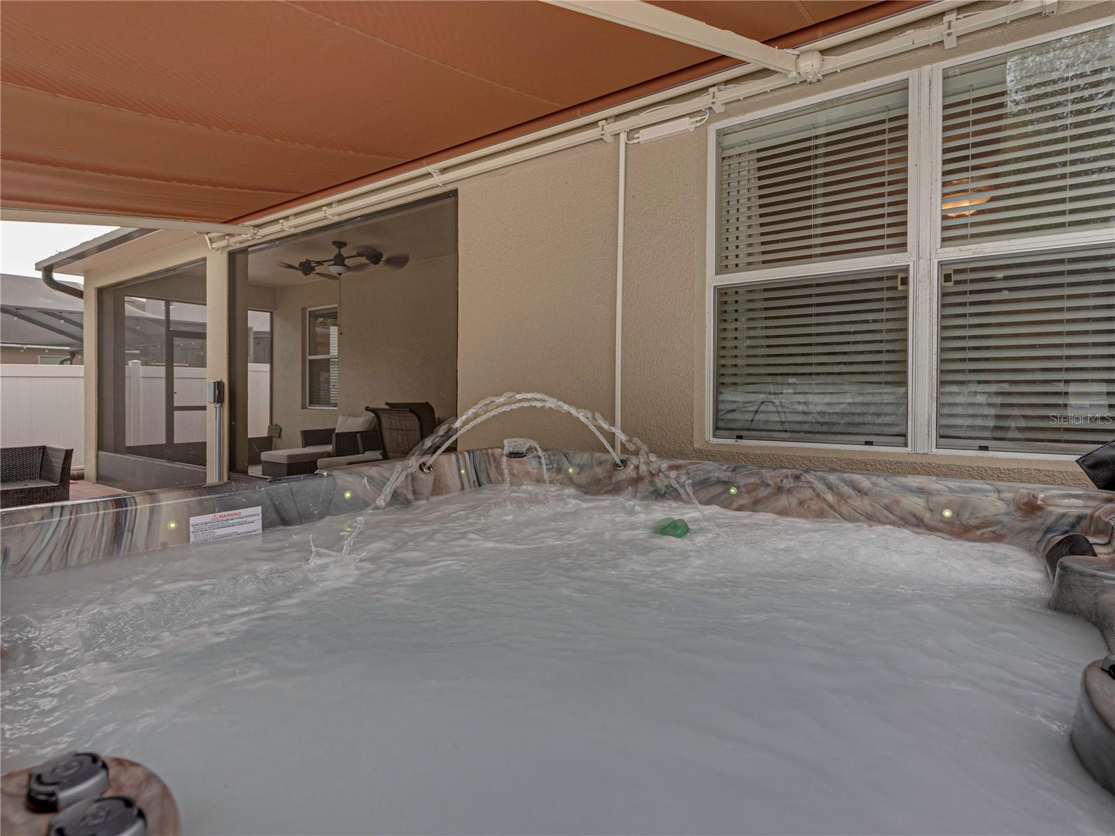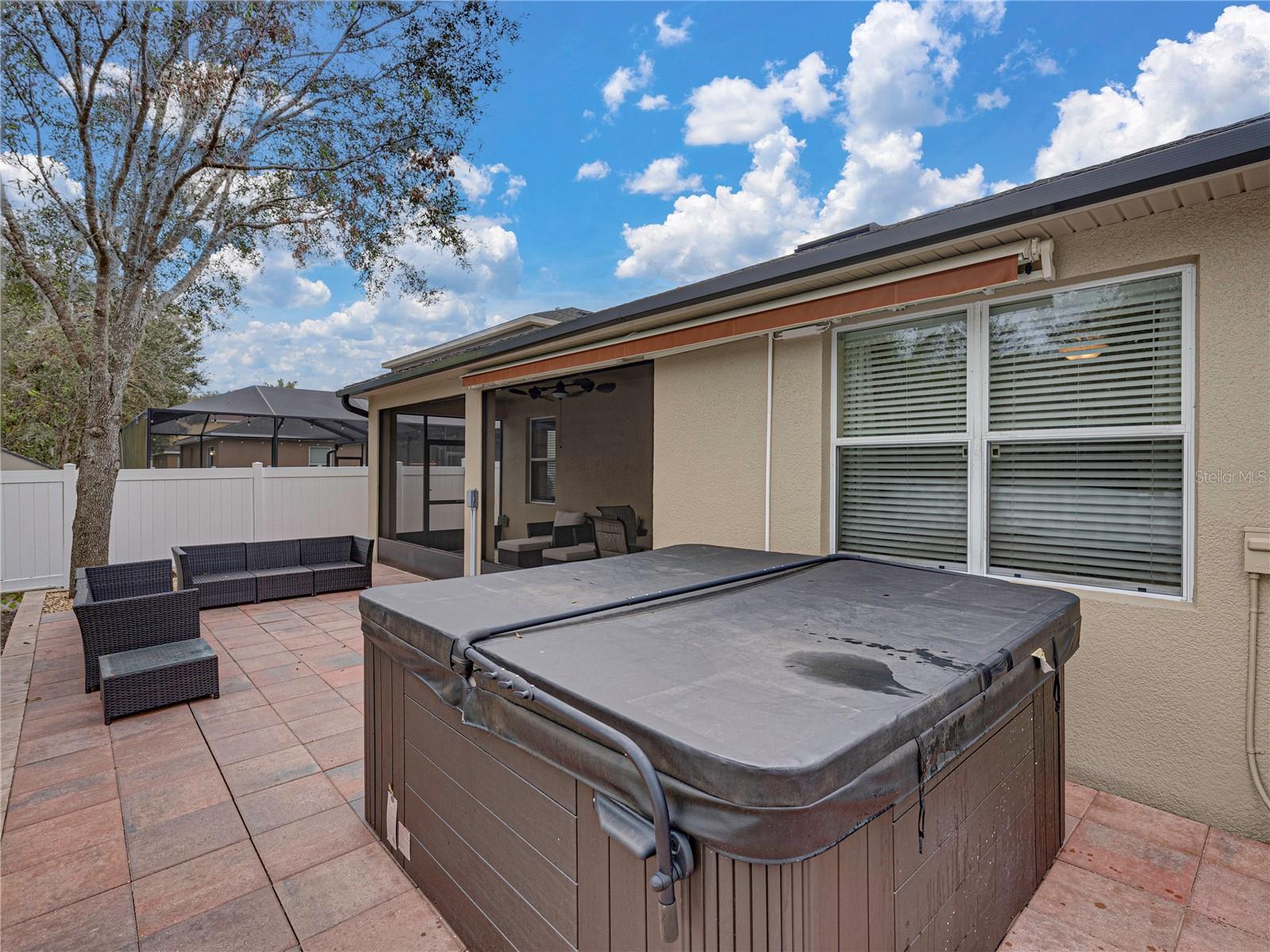 Immaculately Maintained Home in Riverplace with a BRAND NEW ROOF!!! NO CDD!! Welcome to your dream home! This beautifully maintained property offers a spacious and open living/dining/kitchen floor plan that seamlessly extends to an expansive screened lanai. Perfect for entertaining or relaxing, the lanai leads to a raised deck in the fenced backyard, featuring a luxurious hot tub with dual motors, 56 jets, lighting, waterfall, and fountain. Enjoy the privacy of no backyard neighbors and the comfort of a large retractable awning that lights up, providing wonderful shade and cooling the entire house. Inside, you’ll find tile flooring throughout the main living areas and wet areas, ensuring easy maintenance and a sleek look. The primary bedroom is a true retreat with an en suite bath that includes a large soaking tub, separate shower, and dual sinks. The kitchen is a chef’s delight, boasting an island with seating for four, a large pantry, and a convenient coffee station. Additional features include a direct wire in the garage for a generator plug-in, perfect for stormy days when power outages occur. Nestled in the private neighborhood of Riverplace, this home offers tranquility and convenience with no CDD fees. All schools are conveniently located with bus pickup in the neighborhood. Don’t miss out on this exceptional home that has everything you need and more. Schedule your showing today!