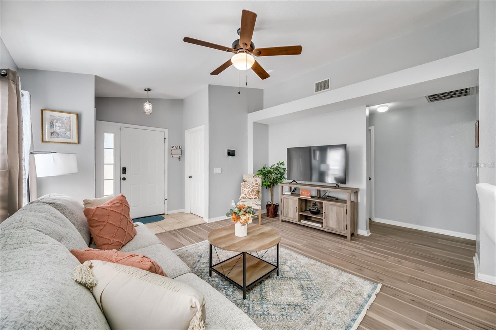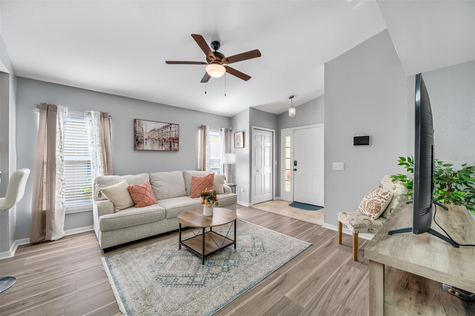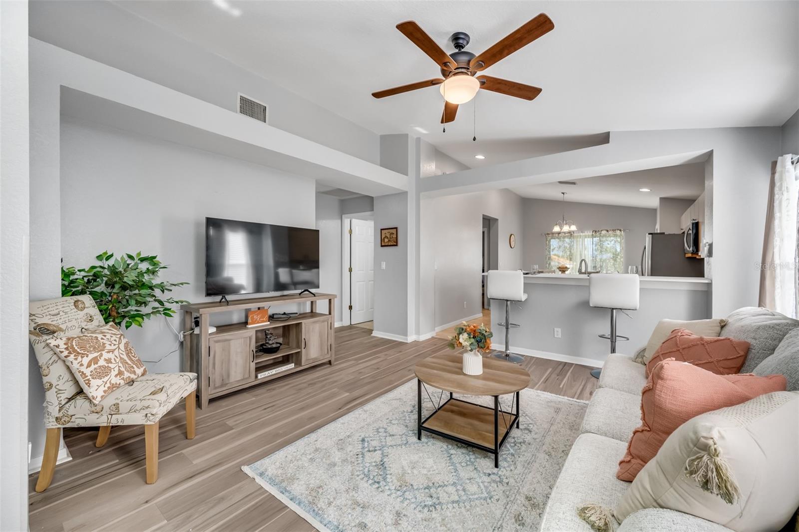 Major upgrades include a brand-new AC system (2024), a new roof (2022), and a new water heater (2023), providing peace of mind and energy efficiency. The two-car garage and 2023 washer and dryer enhance convenience. Step into this beautifully updated 3-bedroom, 2-bathroom retreat, perfectly designed for modern living and effortless style. Perched in a serene pond setting, this move-in-ready gem offers an unparalleled blend of luxury and tranquility. The updated flooring (2022) flows seamlessly, leading you to a stunning kitchen with sleek cabinetry, elegant countertops, and brand-new stainless-steel appliances that make every meal a joy. The bathrooms have been reimagined into spa-like sanctuaries, adding a touch of indulgence to your daily routine, while the expansive cement patio invites you to unwind, dine, or entertain against the backdrop of breathtaking pond views. Whether you’re drawn by the high-end finishes, thoughtful updates, or idyllic location, this home offers the lifestyle you’ve been dreaming of. Don’t wait—schedule your private tour today and see why this property is the one you’ve been searching for! Please use "AS IS" contract for the sellers convenience. Buyer/buyer's agent to verify all MLS information including room sizes and any information deemed important to the buyer, including verifying with the HOA about lease restrictions, pets, and CDD. This house stayed dry and didn't incurred any damages during the two hurricanes and never lost electricity. The CDD is included on the tax bill.