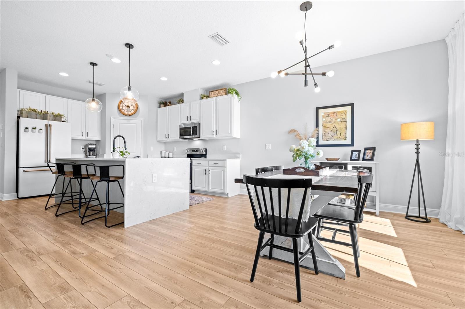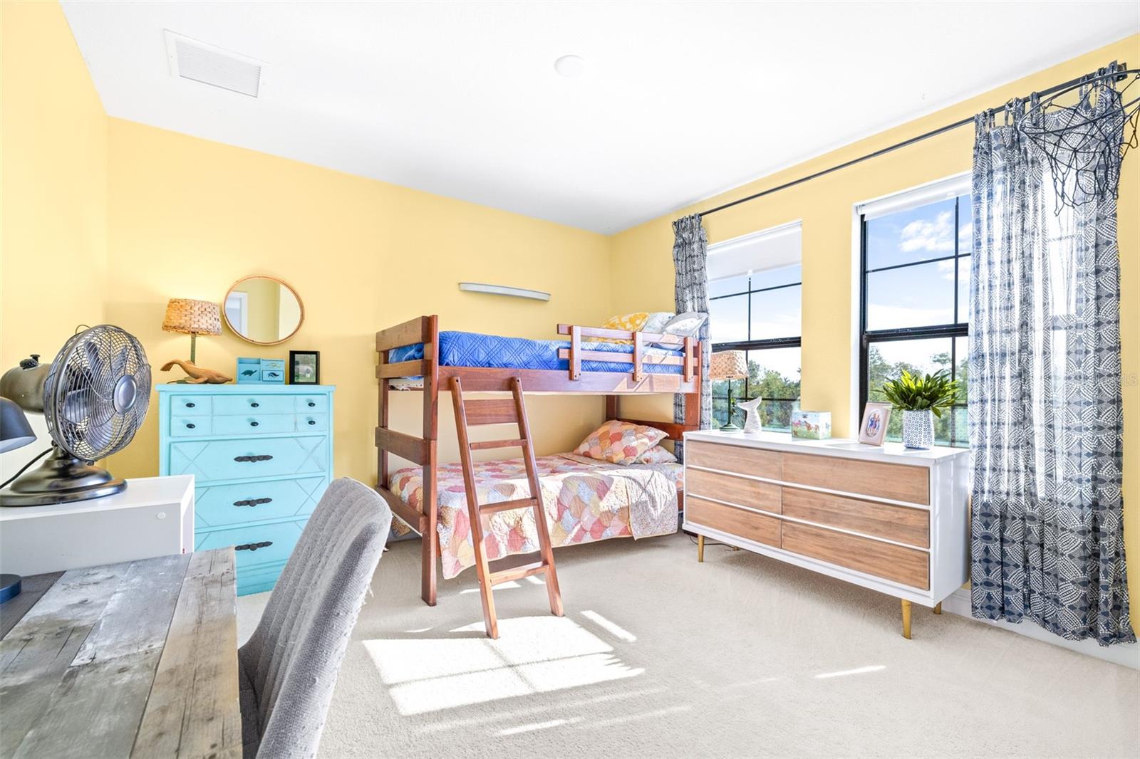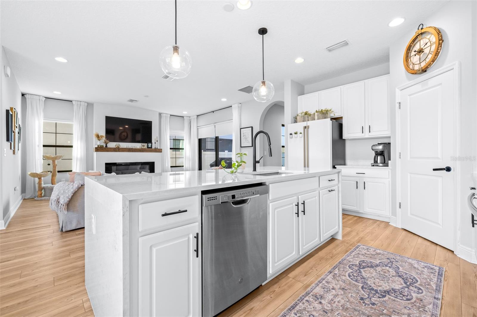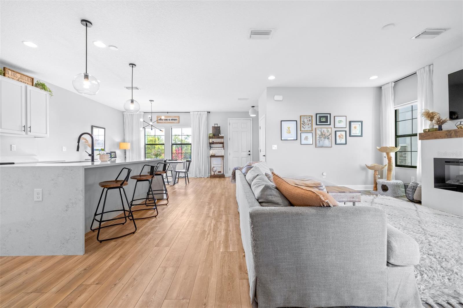Welcome to the stunning Sunflower Model by WestBay Homes, where bright, airy, and open concept living awaits you. The heart of the home features beautiful QUARTZ kitchen countertops enhanced by a striking WATERFALL ISLAND, CAFE refrigerator and stainless steel appliances. The pantry boasts BUILT IN SHELVING that ensures all your essentials are neatly organized. A CUSTOM FIREPLACE with a modern minimalist mantle adds a nice touch to the living area. Covered lanai and NEW FENCING encloses the yard, providing a safe place for your pets to roam. FRESHLY LANDSCAPED front and backyard, complete with two new palm trees. Practical upgrades throughout the home include EPOXY FLOORING in the garage, added SHELVING AND STORAGE solutions in the garage, and even FLOORING IN THE ATTIC for additional storage needs! The laundry room features a custom tabletop build. FRESH INTERIOR PAINT completed in March 2025. UPGRADED LIGHT FIXTURES and can lights that illuminate the home beautifully.This layout offers ultimate convenience, with one bedroom located downstairs accompanied by its own full bathroom, while the primary bedroom, two other bedrooms and laundry room are situated upstairs, along with a spacious loft area that can serve as a playroom, office, or additional living space. The primary suite features an en suite bathroom, equipped with upgraded dual vanity, and tile shower. Owners NEVER LOST POWER during hurricanes as the community has underground utilities and wiring. Home has wind resistant windows and shutters. The Triple Creek community elevates your lifestyle with an array of incredible amenities, including a club amenity center featuring a multi-purpose room and an open-air social room, fitness center, an expansive pavilion, and a resort-style pool with lap lanes, a zero-entry section. Additionally, you’ll find tennis courts, a basketball court, an open play field and the Central Bark dog park, perfect for your pets. New pickleball court, pool, and volleyball court are also being completed. Nature trails for walking and biking provide a serene escape just outside your door.