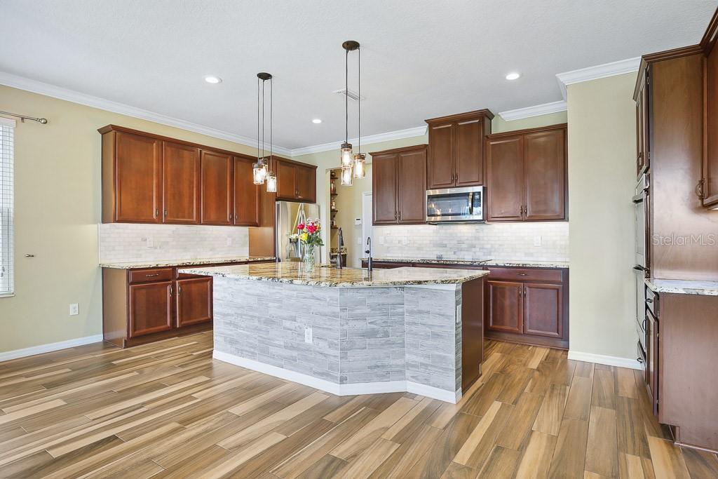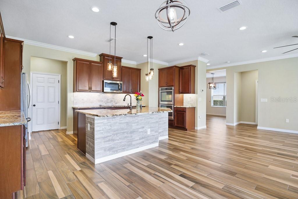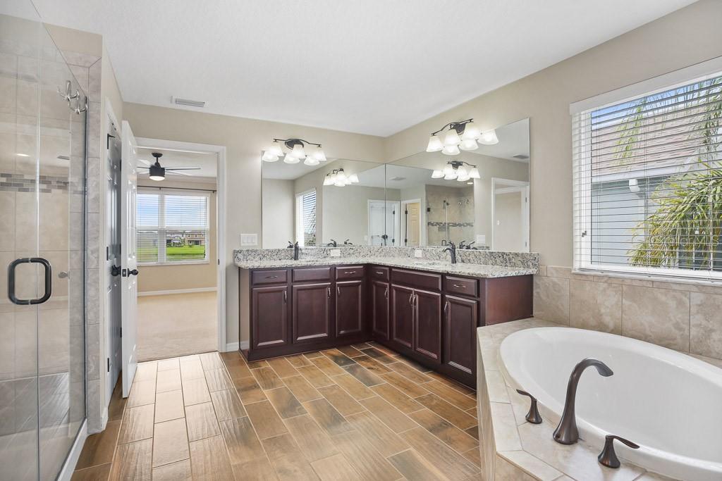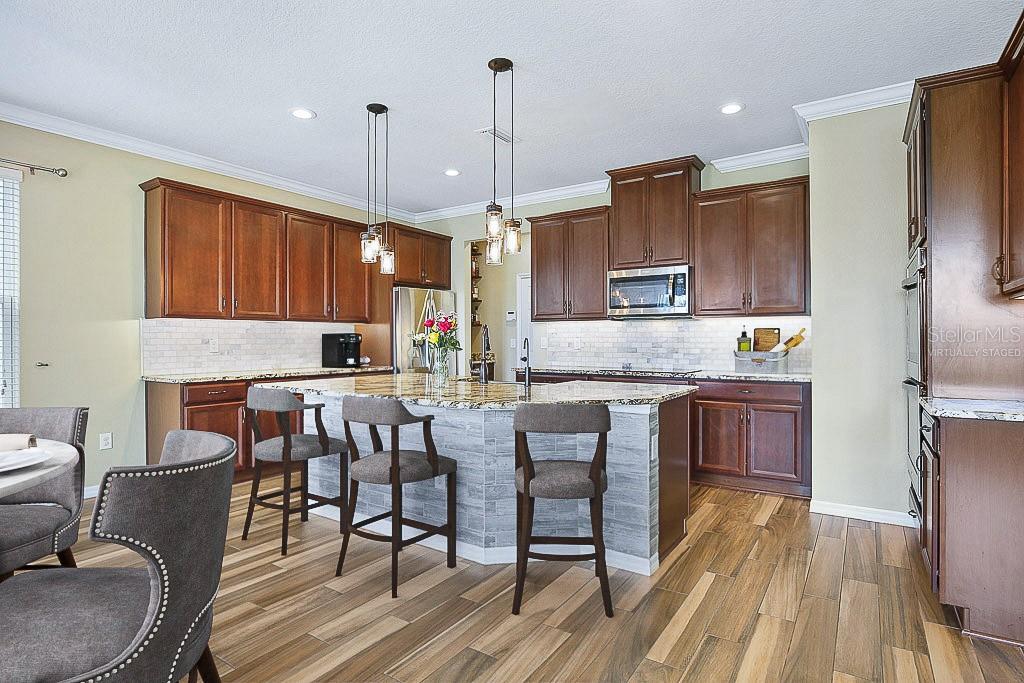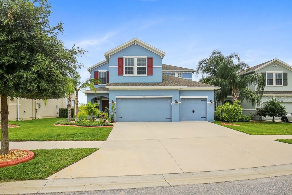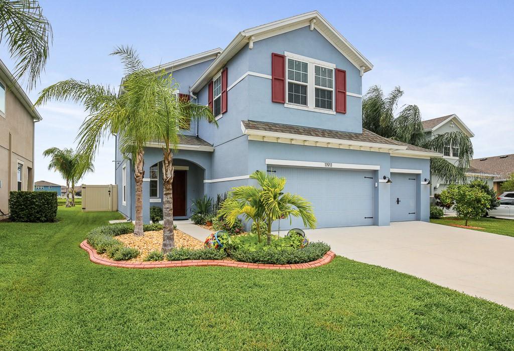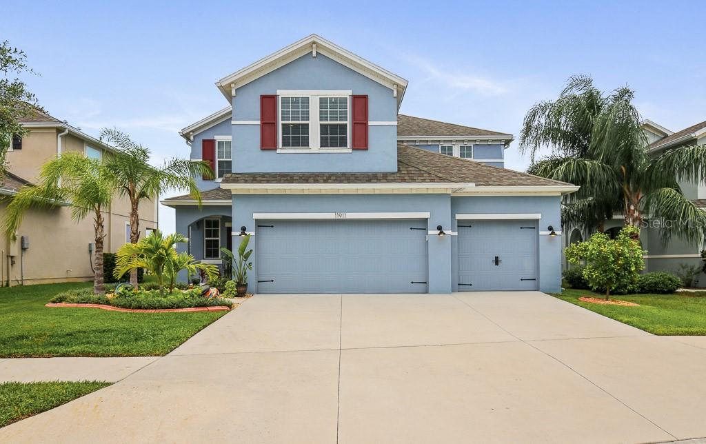 One or more photo(s) has been virtually staged. ATTRACTIVE VA ASSUMABLE at 4.75%. Experience the charm of the Reserve at Pradera! With just under 150 homes and well-appointed recreation amenities you don’t want to miss your opportunity to own in the community. This stunning 4-bedroom plus office/flex/5th bedroom, 3-bathroom, 2,912 sq ft home is perfectly situated on an oversized, fenced lot with a captivating pond view. Tucked away in a private cul de sac, this property features meticulous landscaping, elegant palm trees, and fresh exterior paint from 2021, ensuring impressive curb appeal. Upon entry, you'll be immediately charmed by the formal dining room's tray ceiling, adorned with a chic light fixture and a custom-designed accent wall. The home offers wood-look tile flooring throughout the main living areas and bathrooms, while the bedrooms are carpeted for added comfort. Crown molding along the ceilings enhances the elegance of all entertainment spaces. The open concept living room at the back of the house is a perfect space for entertaining, complete with a ceiling fan and prewiring for a home entertainment system. This area seamlessly connects to a gourmet kitchen equipped with stainless steel appliances, including double built-in ovens and a spacious cooktop. Granite countertops, a stylish tile backsplash, and beautifully crafted cabinets with crown molding add to the kitchen's allure. The large island/breakfast bar, featuring a farmhouse sink, is ideal for serving meals, and a spacious walk-in pantry provides ample storage. The dinette area, which overlooks the outdoor patio through plantation shutters on the sliding glass door, is perfect for casual dining. A guest suite on the main floor, complete with its own full bathroom featuring granite countertops and a shower/tub combo, ensures comfort and privacy for guests. Upstairs, an oversized bonus room awaits, prewired for a home theater system. The primary suite serves as a private retreat with natural light streaming in through two large windows that offer picturesque views of the backyard and pond. The primary bathroom boasts a dual vanity with ample granite counter space, wrap-around mirrors, a walk-in shower with a glass door, a separate soaking tub, and a private water closet. An expansive master closet completes the primary suite. The additional three spacious bedrooms (one of which has been converted from a sitting area in the primary bedroom), including one with a walk-in closet, share a bathroom featuring a dual vanity, granite countertops, and a shower/tub combo. The conveniently located upstairs laundry room eliminates the need to carry laundry up and down the stairs. The backyard features a covered patio, and the fully fenced yard offers privacy and security while providing stunning views of the pond. Additional features include a water softener and a kitchen reverse osmosis system. Community amenities such as a pool, playgrounds, and a dog park further enhance the appeal of this home. Conveniently located just a short drive away from shopping, dining, nature parks, hospitals, and the entrances to I-75 and US 301, this home truly has everything you need.