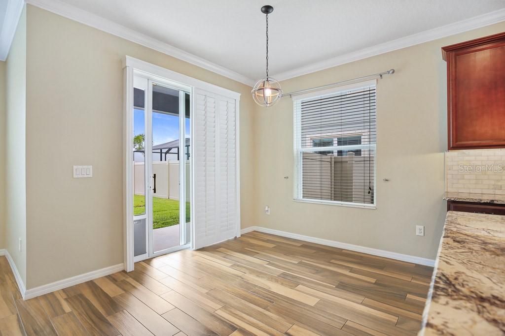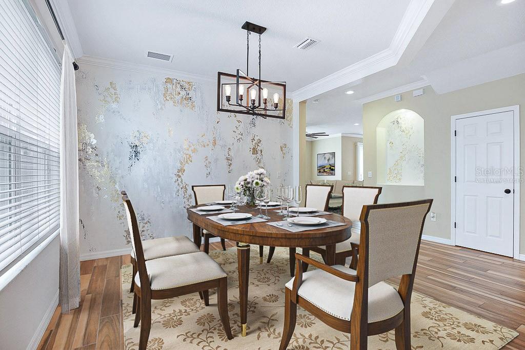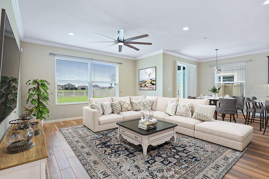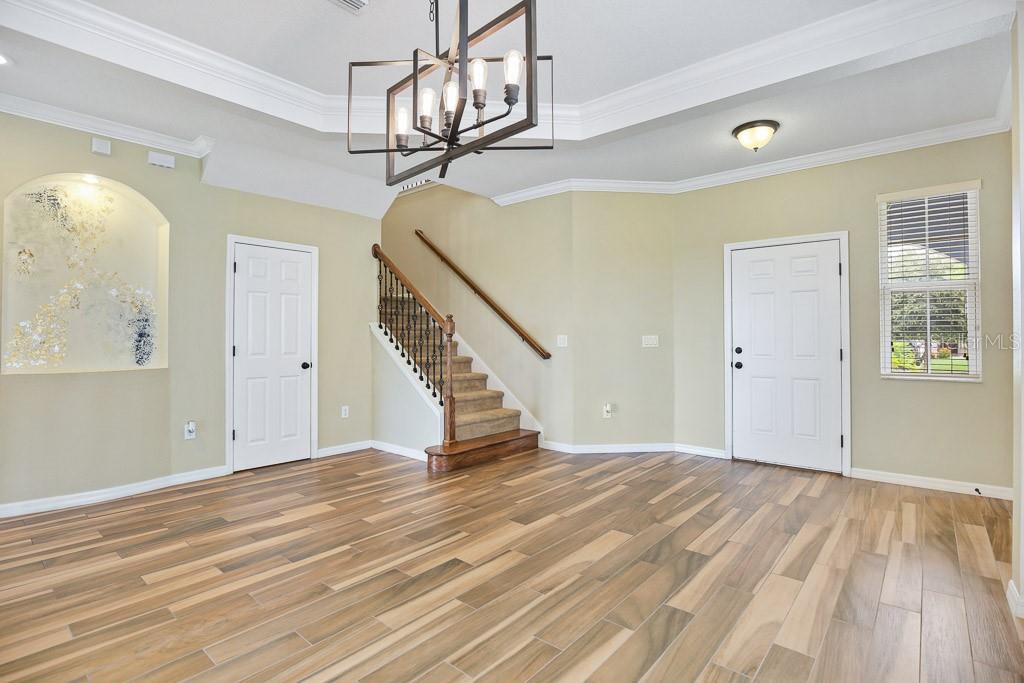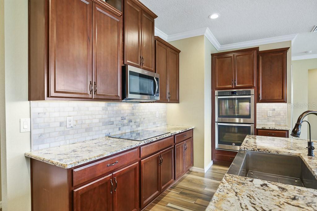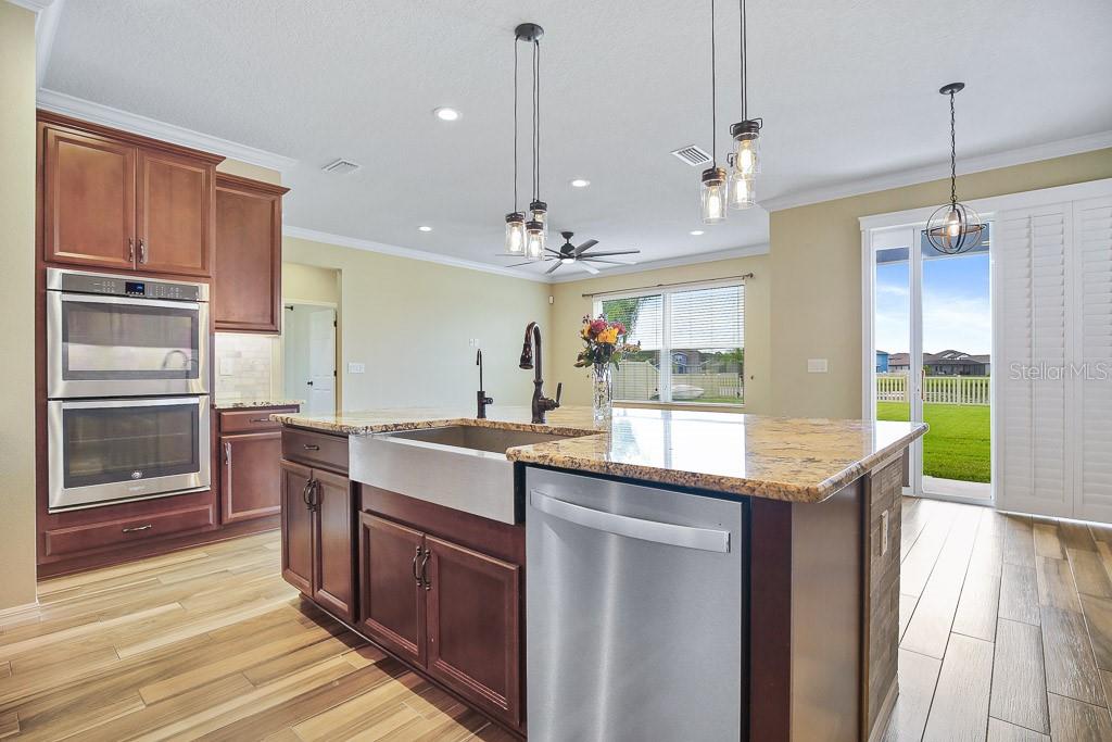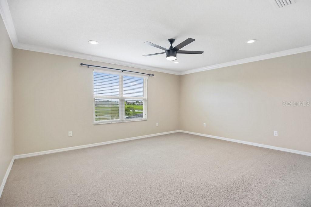 One or more photo(s) has been virtually staged. ATTRACTIVE VA ASSUMABLE at 4.75%. Experience the charm of the Reserve at Pradera! With just under 150 homes and well-appointed recreation amenities you don’t want to miss your opportunity to own in the community. This stunning 4-bedroom plus office/flex/5th bedroom, 3-bathroom, 2,912 sq ft home is perfectly situated on an oversized, fenced lot with a captivating pond view. Tucked away in a private cul de sac, this property features meticulous landscaping, elegant palm trees, and fresh exterior paint from 2021, ensuring impressive curb appeal. Upon entry, you'll be immediately charmed by the formal dining room's tray ceiling, adorned with a chic light fixture and a custom-designed accent wall. The home offers wood-look tile flooring throughout the main living areas and bathrooms, while the bedrooms are carpeted for added comfort. Crown molding along the ceilings enhances the elegance of all entertainment spaces. The open concept living room at the back of the house is a perfect space for entertaining, complete with a ceiling fan and prewiring for a home entertainment system. This area seamlessly connects to a gourmet kitchen equipped with stainless steel appliances, including double built-in ovens and a spacious cooktop. Granite countertops, a stylish tile backsplash, and beautifully crafted cabinets with crown molding add to the kitchen's allure. The large island/breakfast bar, featuring a farmhouse sink, is ideal for serving meals, and a spacious walk-in pantry provides ample storage. The dinette area, which overlooks the outdoor patio through plantation shutters on the sliding glass door, is perfect for casual dining. A guest suite on the main floor, complete with its own full bathroom featuring granite countertops and a shower/tub combo, ensures comfort and privacy for guests. Upstairs, an oversized bonus room awaits, prewired for a home theater system. The primary suite serves as a private retreat with natural light streaming in through two large windows that offer picturesque views of the backyard and pond. The primary bathroom boasts a dual vanity with ample granite counter space, wrap-around mirrors, a walk-in shower with a glass door, a separate soaking tub, and a private water closet. An expansive master closet completes the primary suite. The additional three spacious bedrooms (one of which has been converted from a sitting area in the primary bedroom), including one with a walk-in closet, share a bathroom featuring a dual vanity, granite countertops, and a shower/tub combo. The conveniently located upstairs laundry room eliminates the need to carry laundry up and down the stairs. The backyard features a covered patio, and the fully fenced yard offers privacy and security while providing stunning views of the pond. Additional features include a water softener and a kitchen reverse osmosis system. Community amenities such as a pool, playgrounds, and a dog park further enhance the appeal of this home. Conveniently located just a short drive away from shopping, dining, nature parks, hospitals, and the entrances to I-75 and US 301, this home truly has everything you need.