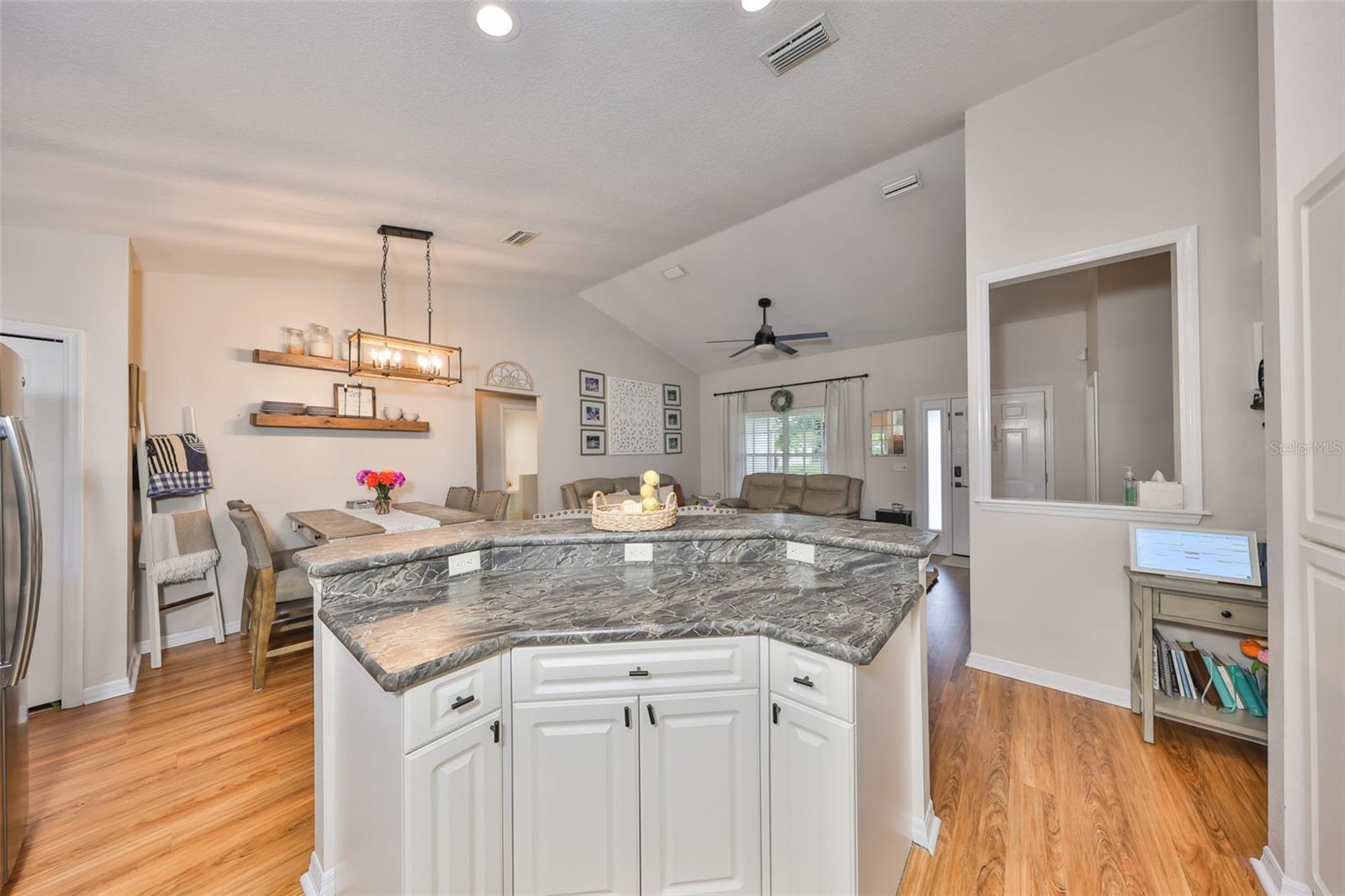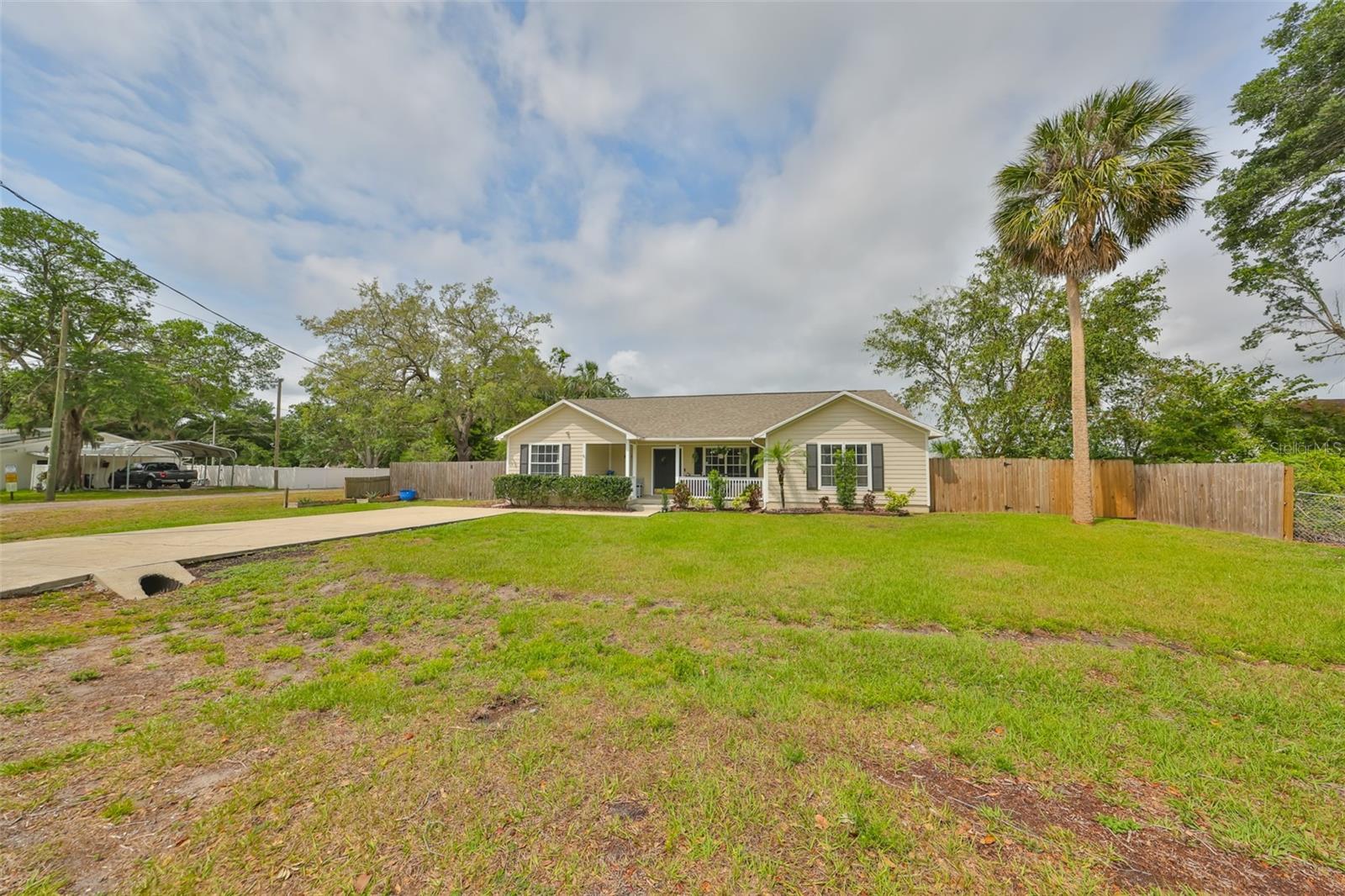 Welcome to your Riverview retreat! This charming single-story home checks all the boxes from the oversized driveway and cozy covered front porch to the bright, open layout inside. Step through the front door and be greeted by soaring vaulted ceilings and beautiful laminate wood flooring that flows through the main living areas. The spacious kitchen, living, and dining areas blend seamlessly for easy entertaining and everyday comfort. In the kitchen you'll find tons of cabinet and countertop space, stainless steel appliances, and a countertop for barstools. The split-bedroom floorplan offers privacy, with the primary suite tucked away from two of the guest rooms. You'll love the en-suite bathroom featuring a dual sink vanity, a walk-in shower, and a soaking tub perfect for unwinding. Additional perks include an inside laundry room, carpeted bedrooms for that extra cozy feel, and tile in the bathrooms. Out back, enjoy Florida evenings under your large covered porch or gather around the firepit in the fully fenced backyard. Located in Flood Zone X and just minutes from Tiki Docks, shopping, dining, and all the local favorites, this home is the perfect mix of convenience and comfort.
